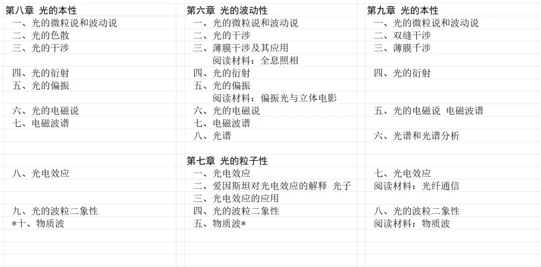 下面是光的本性的章节,甲种本的内容最多。乙种本多了个光纤通信的阅读材料,物质波在旧教材和甲种本是选学的小节,在乙种本是阅读材料。