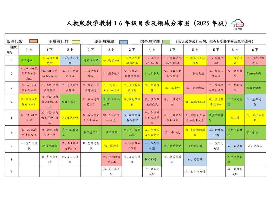 >人教版小学数学新教材1-6年级目录及领域分布图(2025版)