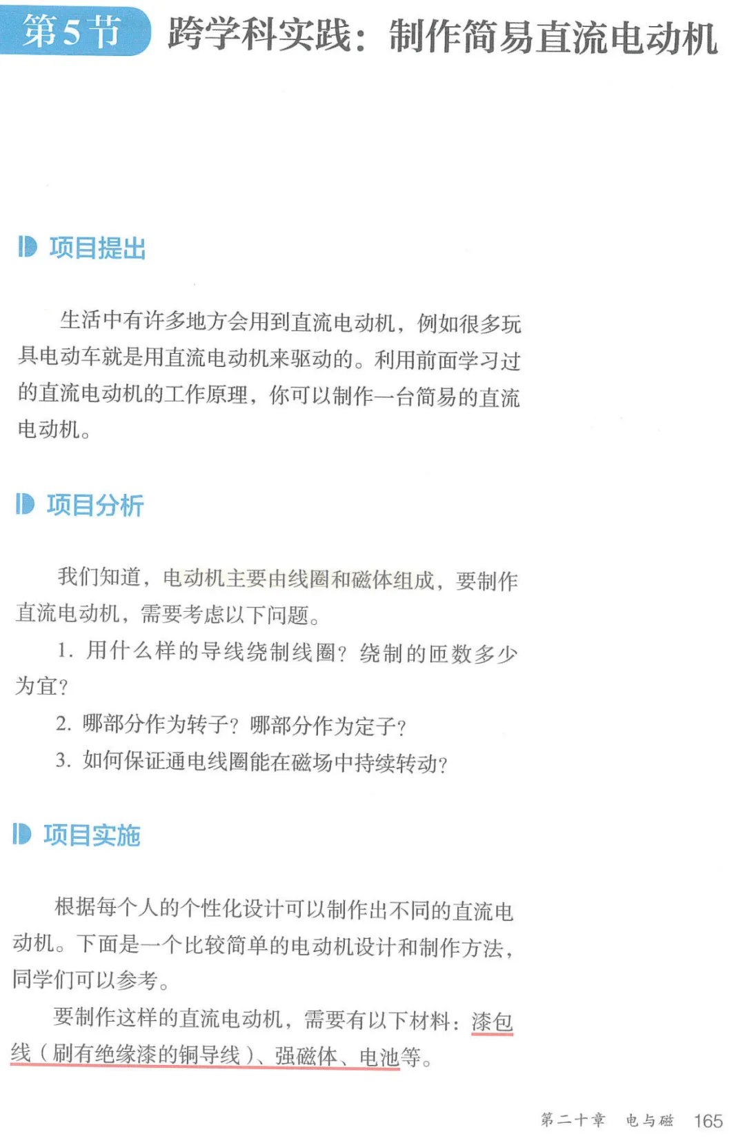 初中物理新教材 第二十章 电与磁 第5节《跨学科实践:制作简易直流电动机》批注(2024人教版)
