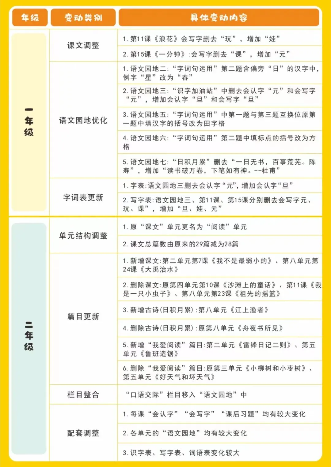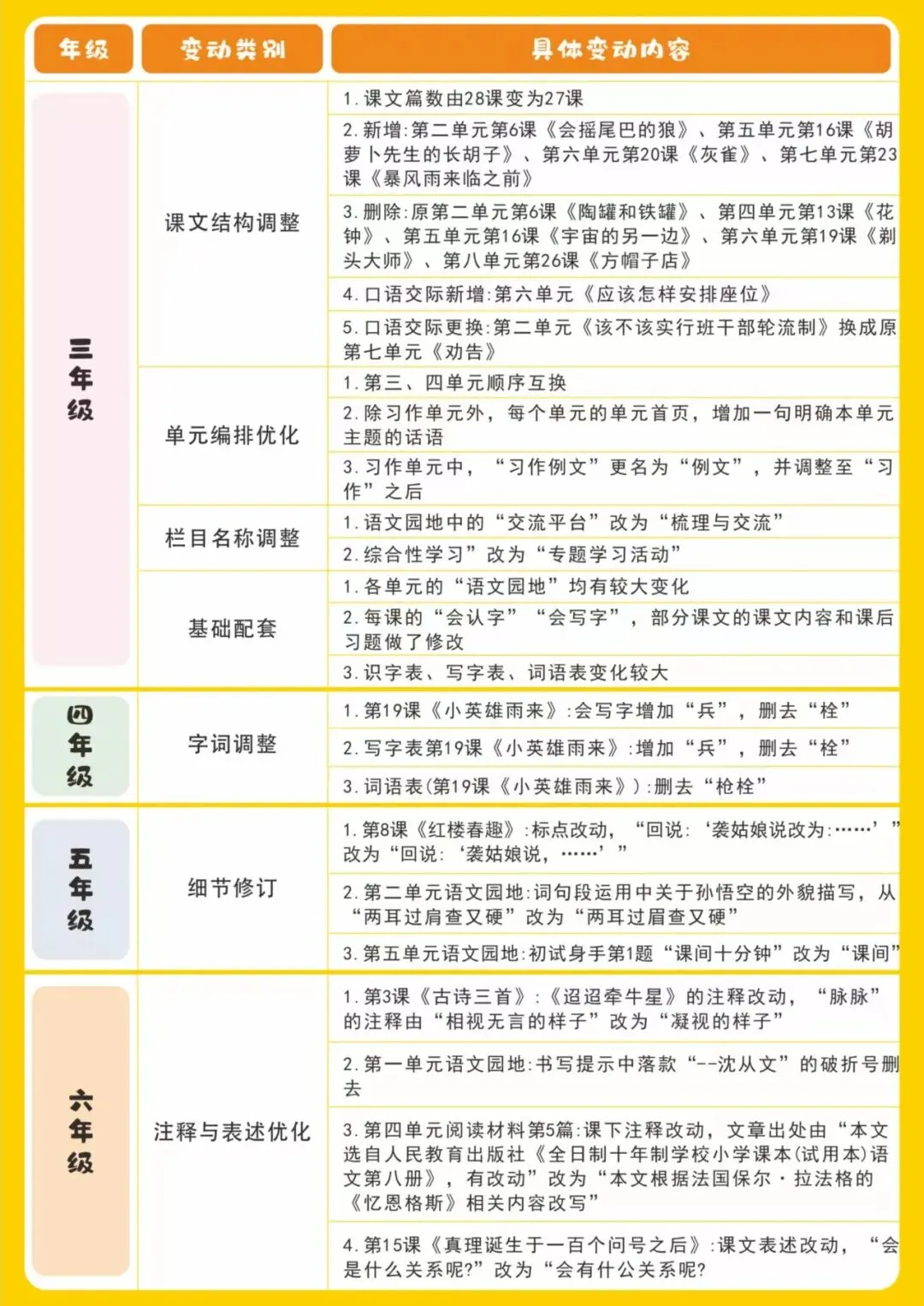 2年级新增了《我不是最弱小的》《大禹治水》,但把《沙滩上的童话》《祖先的摇篮》这些娃熟悉的课文进行了删除了,古诗和课外阅读篇目也有增删,还把“口语交际”挪去了语文园地,字词、课后题跟着大改,得重点盯新增课文。三年级