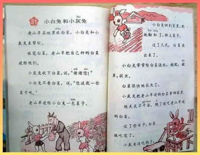 看着插图里那只挥舞着锄头,.大汗淋漓的小白兔,还有那个穿着朴.素工装裤的小灰兔.,满满的都是年代感。那时.候的我们,不也.像这只小白兔一样吗,相信劳动最光荣,.相信双手能创造一切。这篇课文,大概.是我们人生中最早关于.自力更生的启蒙教育了.。