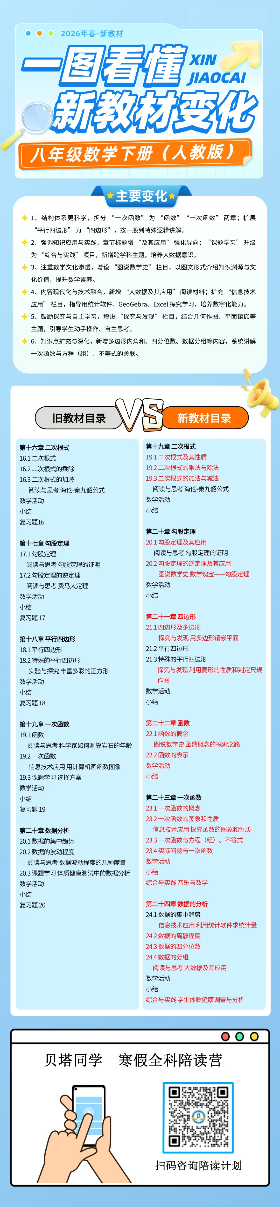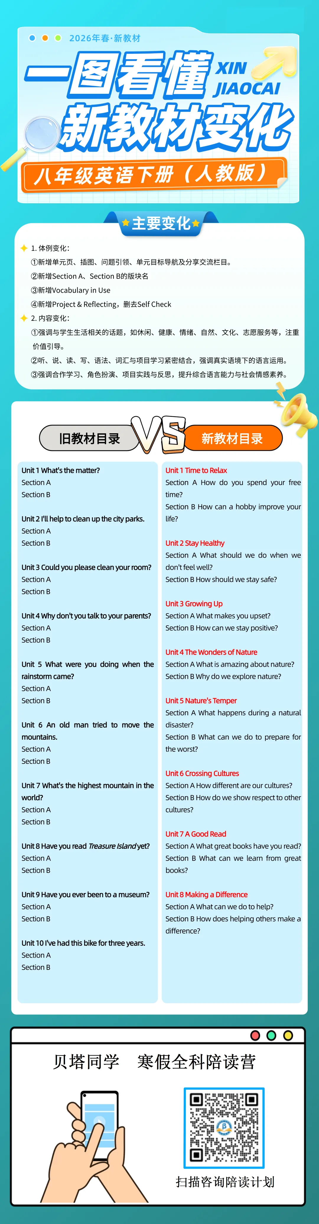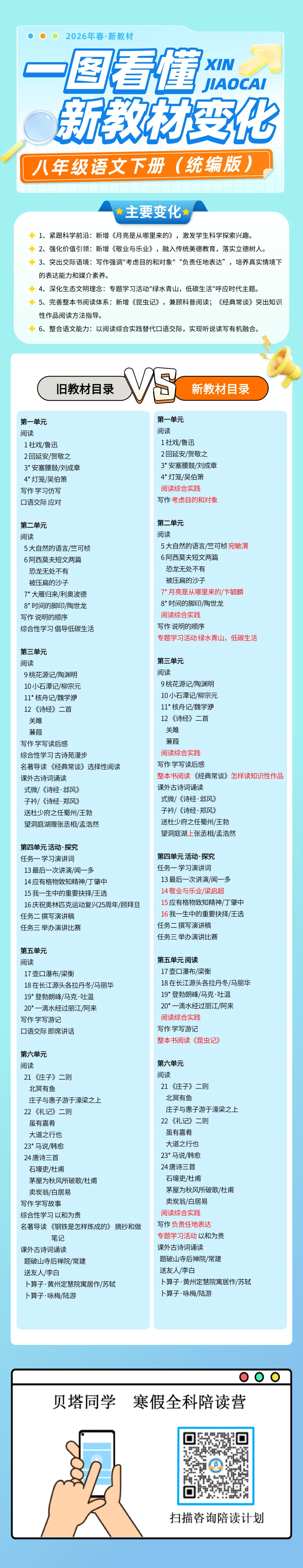 2026年春季新学期,初中八年级下册、九年级物理下册以及小学二、三年级下册、四年级英语下册,将启用新教材。初中下册新教材对比旧教材有什么改动?本文带您一起解读新教材主要变化!内容包括新旧教材目录对比、主要变化解读。