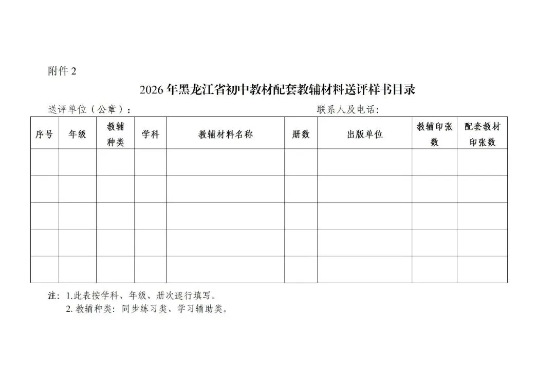为进一步规范义务教育阶段教辅材料管理工作,落实我省中小学利用征订教辅谋利问题专项整治暨做好民生实事工作,推动教辅材料征订管理各项政策规定落地落细,解决当前群众关心关切问题,提供质优价廉的教辅材料,决定开展2026年黑龙江省初中阶段教辅材料评议工作,新评议的教辅材料于2026年秋季学期开始投入使用,现将有关事项公告如下。