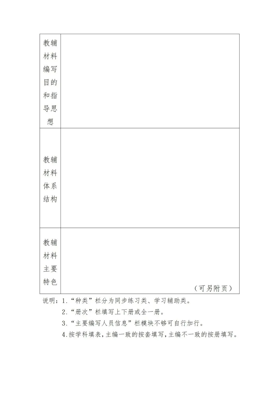 (四)教辅材料送评申请书(附件3)一式2份,内容包括教辅材料名称、适用范围,主要编写者信息,编写目的和指导思想,教辅材料体系结构、特色等同时提供。