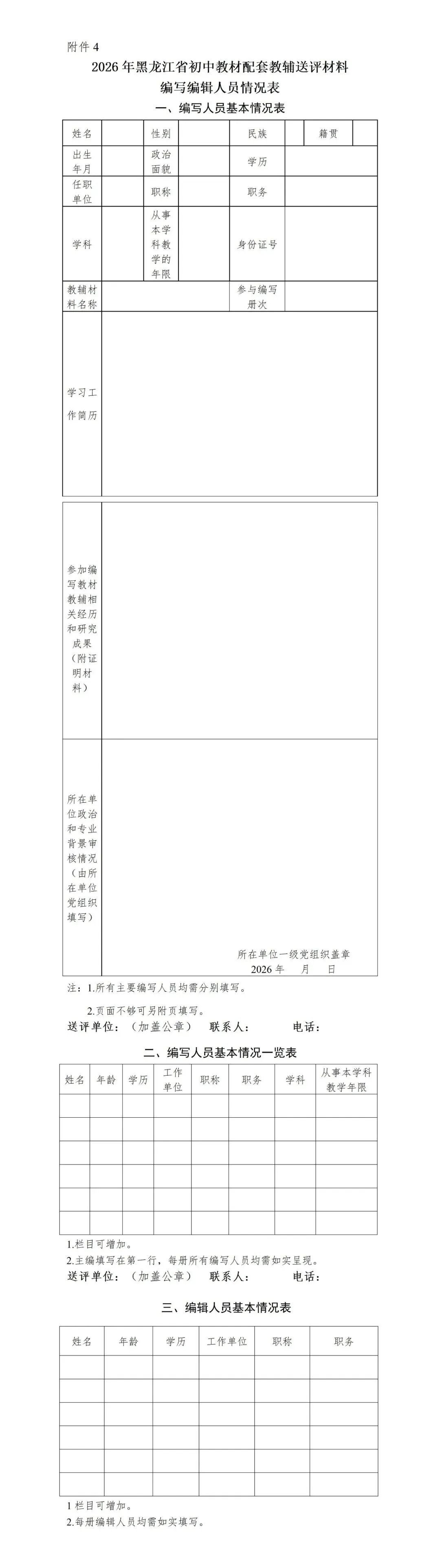 (五)教辅材料编写编辑人员情况表(附件4)一式2份。