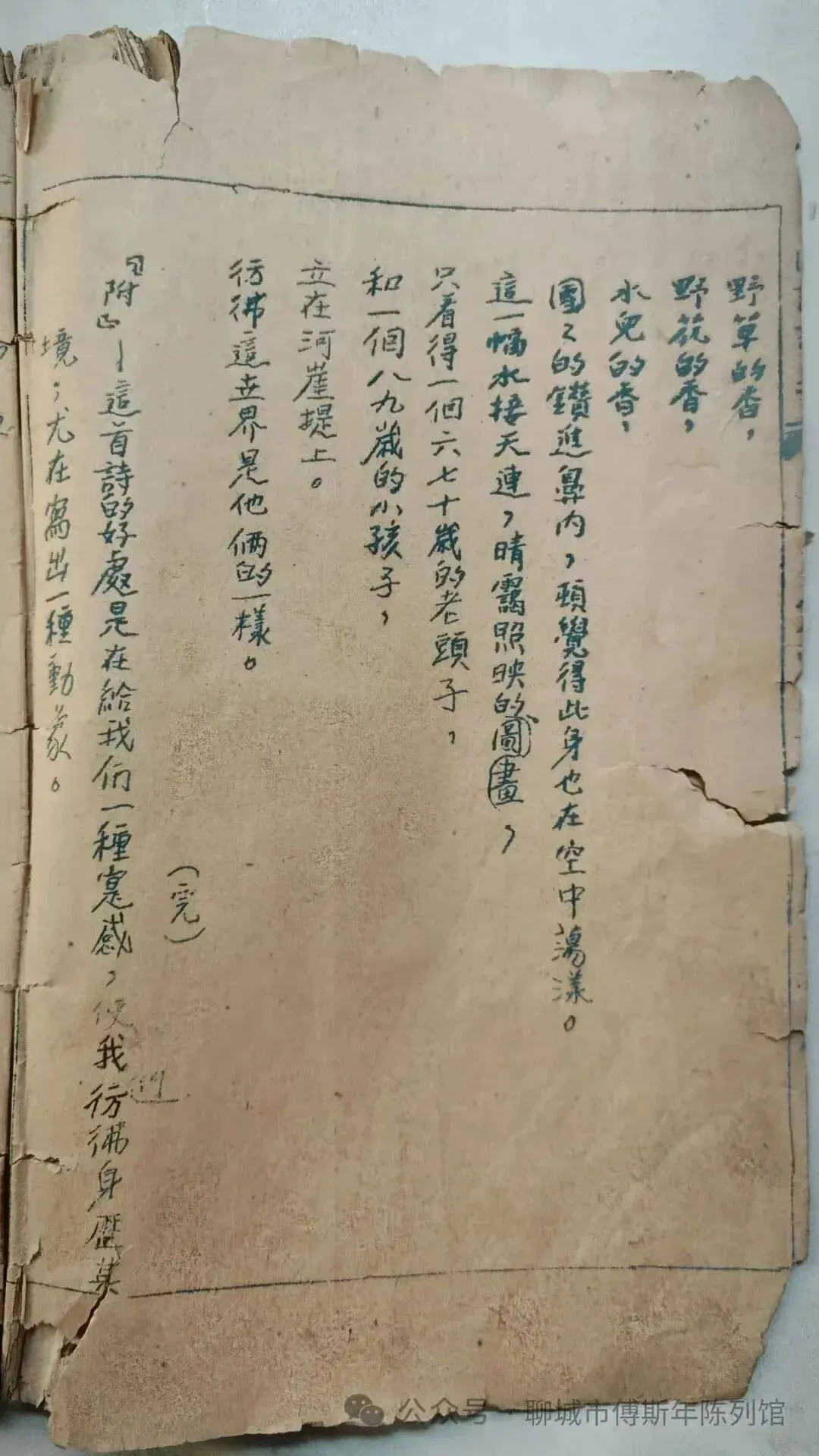 1934年,我党莱芜区党组织推动创办莱芜区大圣寺高级小学,并编印了《国语讲义》,作为孩子们的教科书。书中编录了许多著名学者的文章,有冰心的《一个军官的笔记》、胡适的《清道夫》、叶圣陶的《寒晓的琴歌》等,其中,傅斯年的散文诗《老头子和小孩子》出现在课本比较靠前的第四页,足以看出编者对这首诗的重视。编者在附言中写道:这首诗的好处是在给我们一种实感,使我仿佛身历其境,尤在写出一种动象。《老头子和小孩子》是傅斯年1919年发表在《新潮》杂志上的一首诗。傅斯年九岁时父亲去世,爷爷傅淦在他的童年时期影响非常大,傅斯年扎实的国史知识基础、刚正不阿的性格都与傅淦分不开。傅斯年在这首诗的序中写道:这是发生在十五年前的一段经历,现在回想起来恰似梦境一般。是他回忆童年时期与祖父郊游时的场景,从中我们也可以看出他们的祖孙情深。