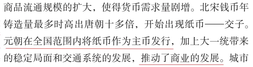 实际上,古代王朝货币发行不能摆脱政府财政需求影响,因此必成恶政。这种情况下,教材却强调其对商业发展的推动作用,不大合适吧。