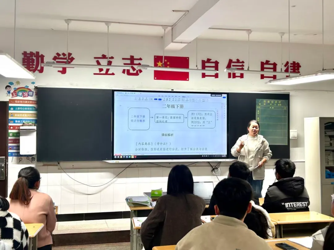 统计与概率是培养数据意识与随机观念的核心载体,其目标是让学生学会“用数据说话、用概率判断率”。本次研修围绕1~6年级下册教材展开系统梳理,清晰呈现了从简单分类计数→画“正”字统计→统计表→条形图→折线图→扇形图的进阶脉络,从数据收集到整理表达,逐步提升可视化能力。