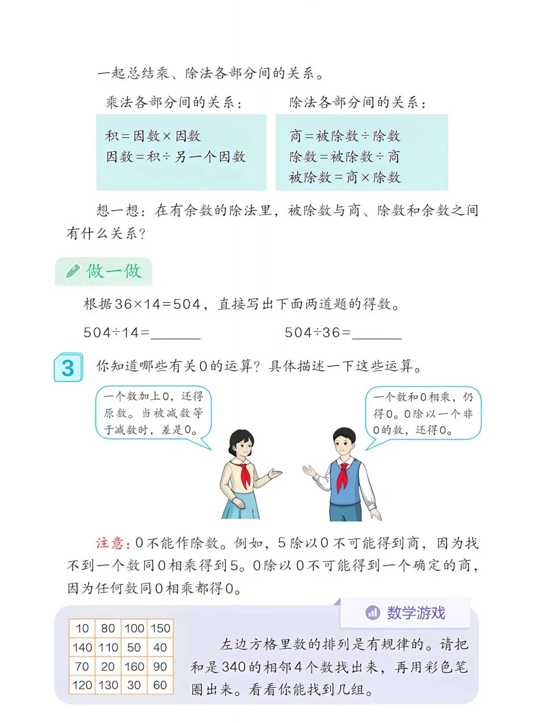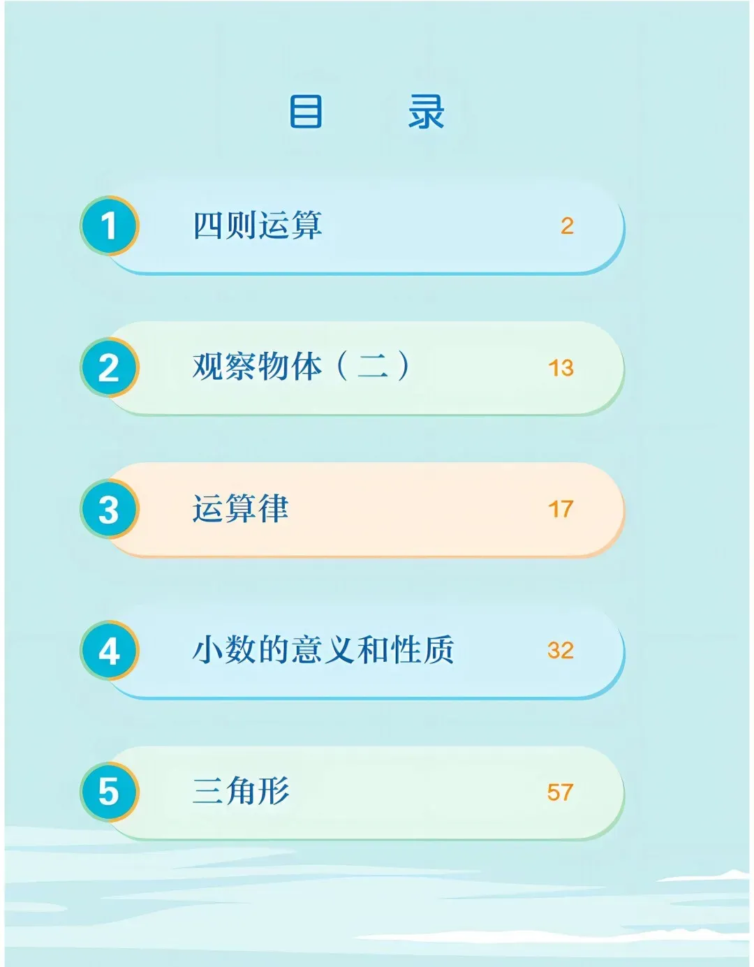 4. 聚焦素养衔接,夯实进阶基础。以“四基四能”为核心,渗透数形结合、转化思想,提升运算能力与推理意识;知识编排循序渐进,为五年级方程、几何面积计算等内容铺垫;新增知识梳理栏目,引导学生构建认知体系,培养自主学习能力。