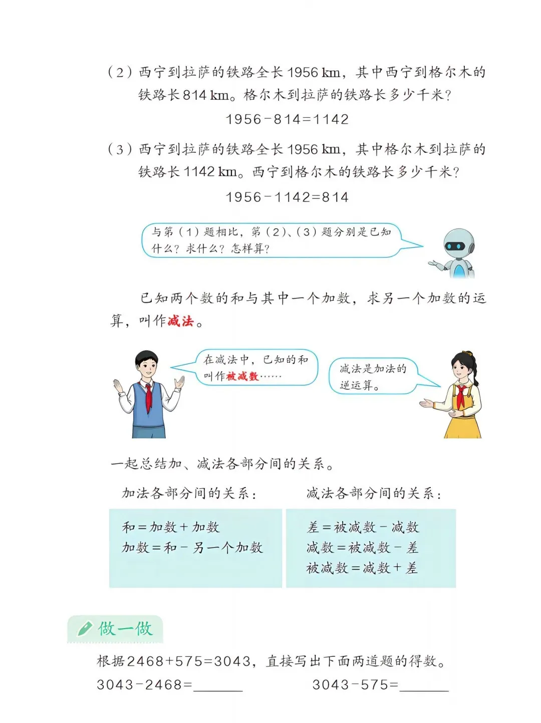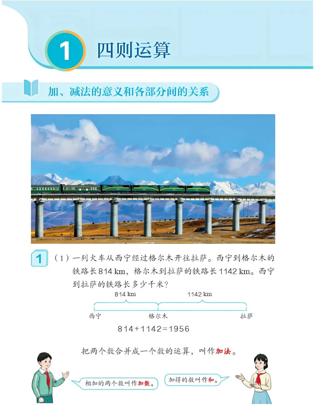 3. 调整内容呈现,贴近生活场景。例题素材更新为购物计价、铁路长度测量、环保调查等生活化情境,降低抽象难度;四则运算单元新增“西宁到拉萨铁路长度”等案例,强化运算与实际的关联;优化习题设计,减少重复题型,增加变式题。