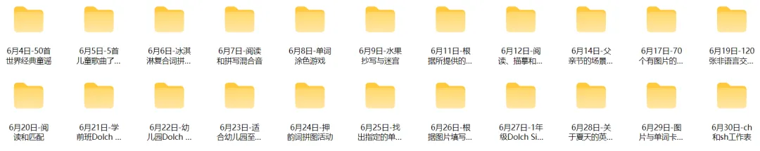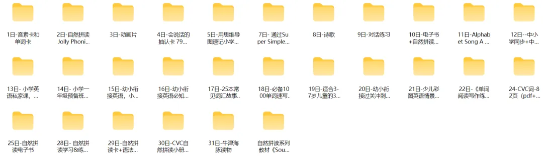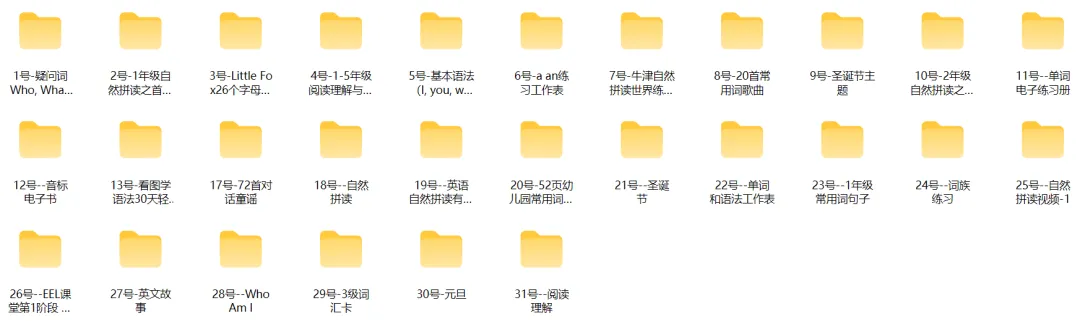 英语单词卡,26个英文字母练习册,英文儿歌与英文视频,语法练习,各种类型的电子书等等