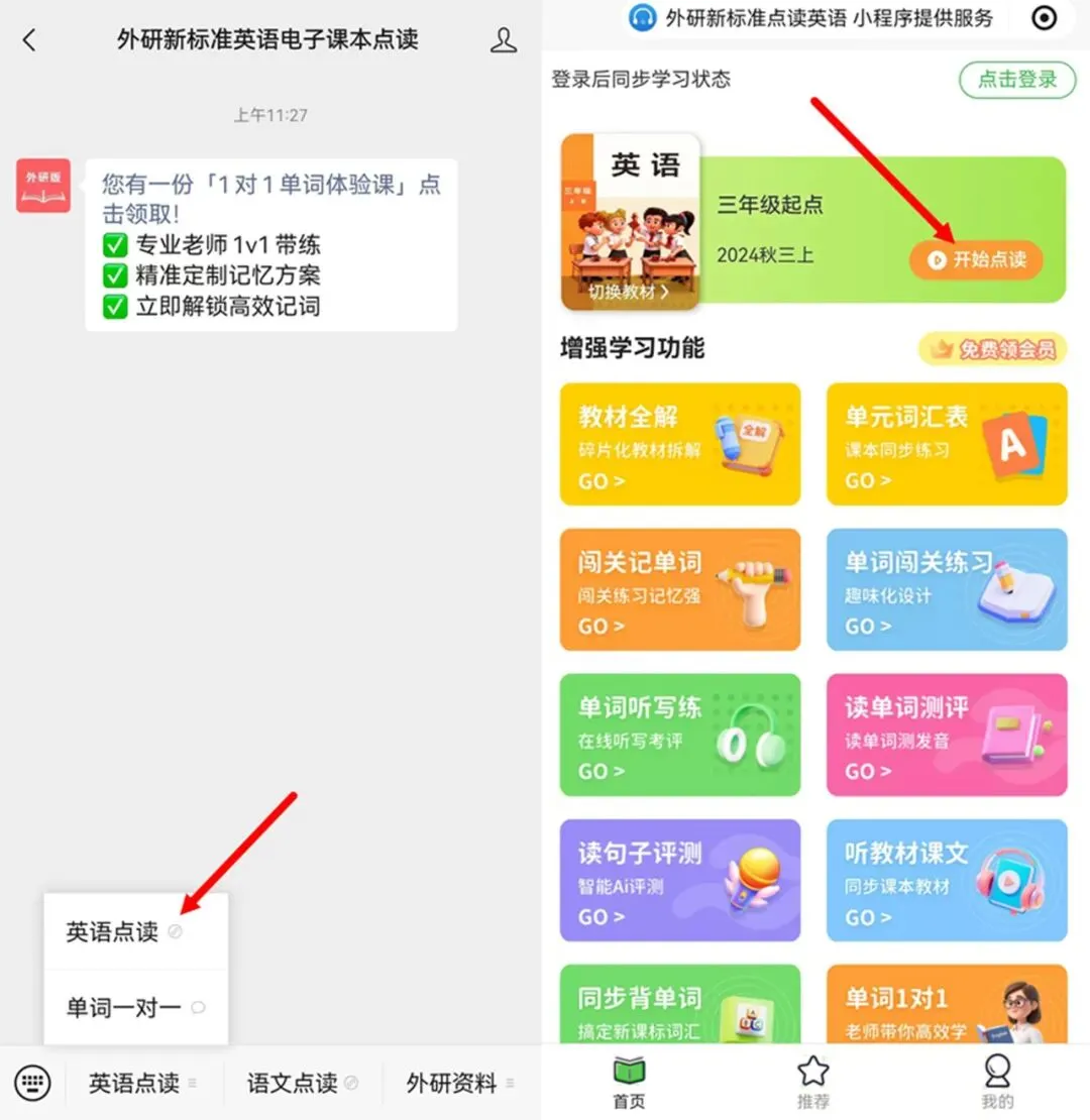 点击底部菜单英语点读免费获取新教材电子课本点读工具