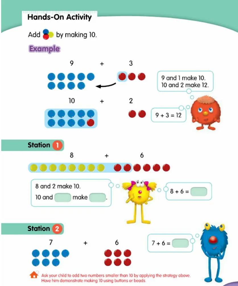 别看这小小的加减法,教材里循序渐进地讲解了四种计算方法:凑十法、拆十加法、拆十减法、破十减法。对每种方法的讲解是它的精华所在。