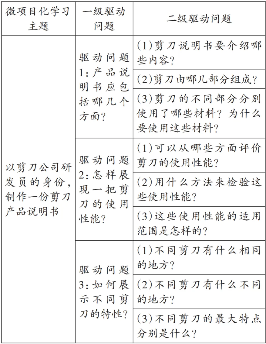 本课围绕“以剪刀公司研发员的身份,制作一份剪刀产品说明书”设计了多级驱动问题(如表1)。