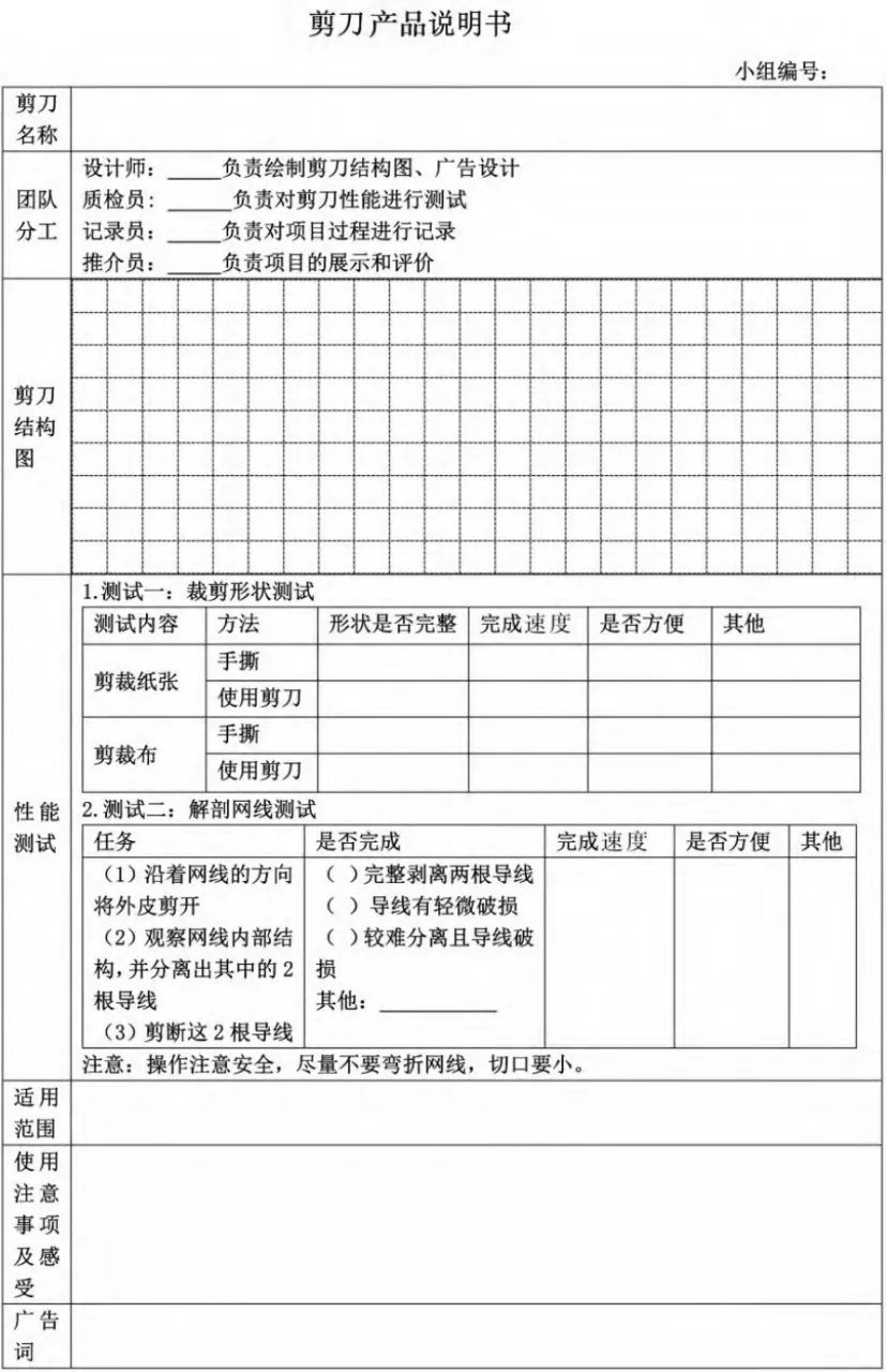 任务3:制作剪刀产品说明书。学生从适用范围和使用注意事项两个方面总结实践体会,将实践感受写入产品说明书,强调说明书的科学性和实践性,并在剪刀推介会上就剪刀产品说明书进行交流。