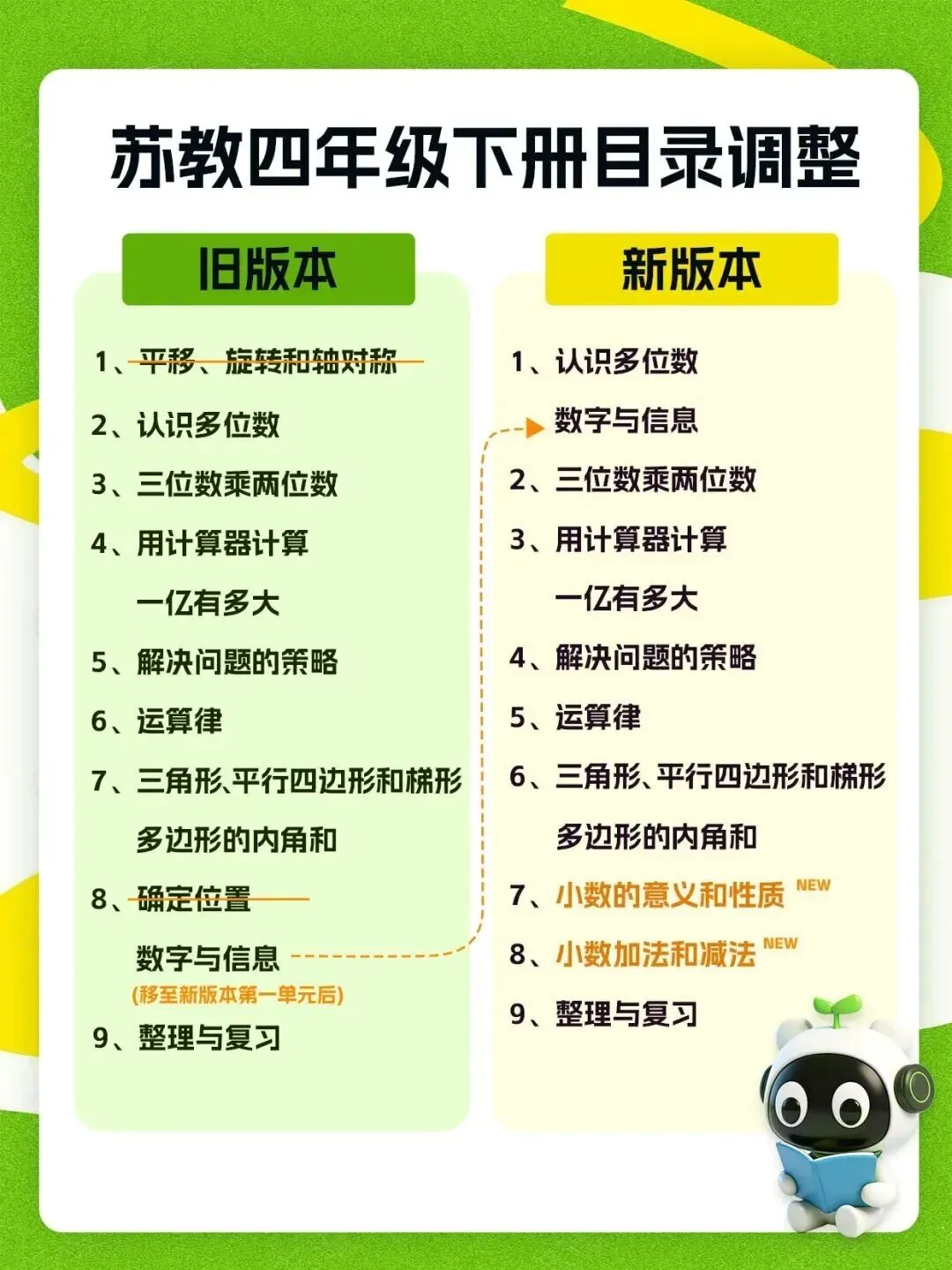 此外,为了确保教学平稳过渡,减少数学知识和技能上的断层与重复,26春学期,苏教版数学教材四、五年级也做了调整。以下为新教材目录内容的具体变化情况: