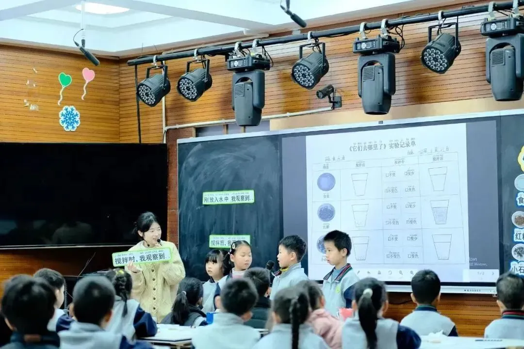 浦坝港镇浬浦中心小学陈茹老师以“驴子过河”的故事作为贯穿,对食盐、红糖、小石子在水中的变化展开讨论与探究,通过实验对比搅拌前和搅拌后的变化,逐步渗透学生对溶解这一概念的理解。