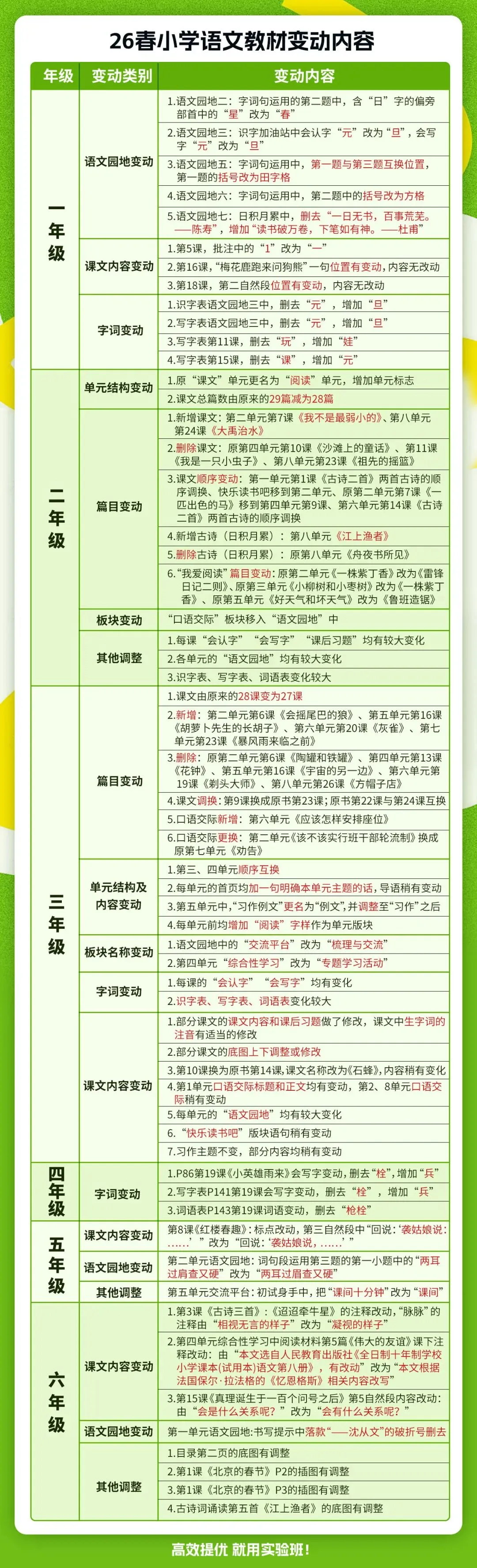 寒假临近,备受关注的2026年春季小学教材修订内容终于有了新动向!据官方资料显示,2026春一到六年级语文教材有多处调整。
