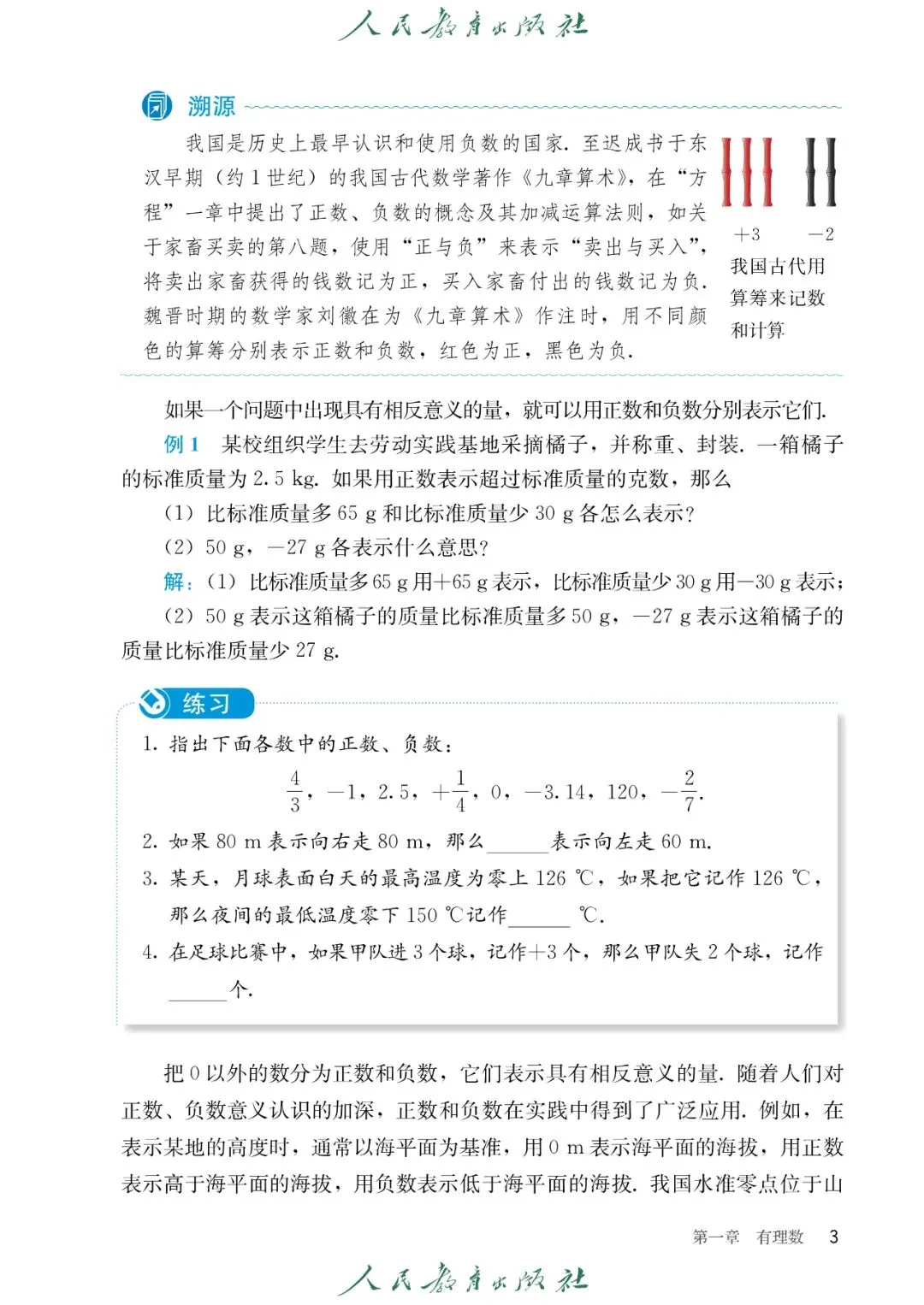 【1】第一章 有理数:正数与负数的概念;用正负数表示具有相反意义的实际量(如温度、海拔、收支等);有理数的定义及表示方法;数轴的建立与应用;有理数的大小比较(借助数轴和绝对值);绝对值的意义与性质;有理数的分类(整数、分数);负数产生的历史背景与数学意义。