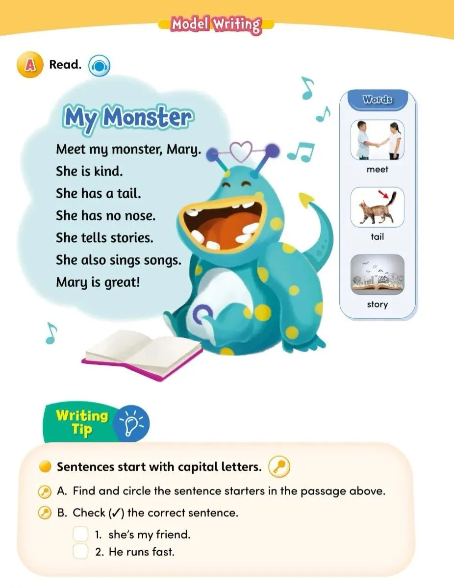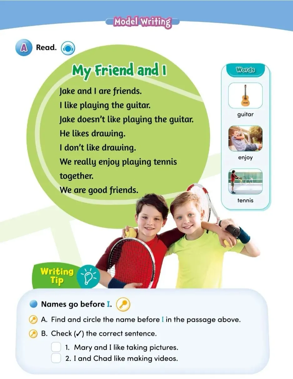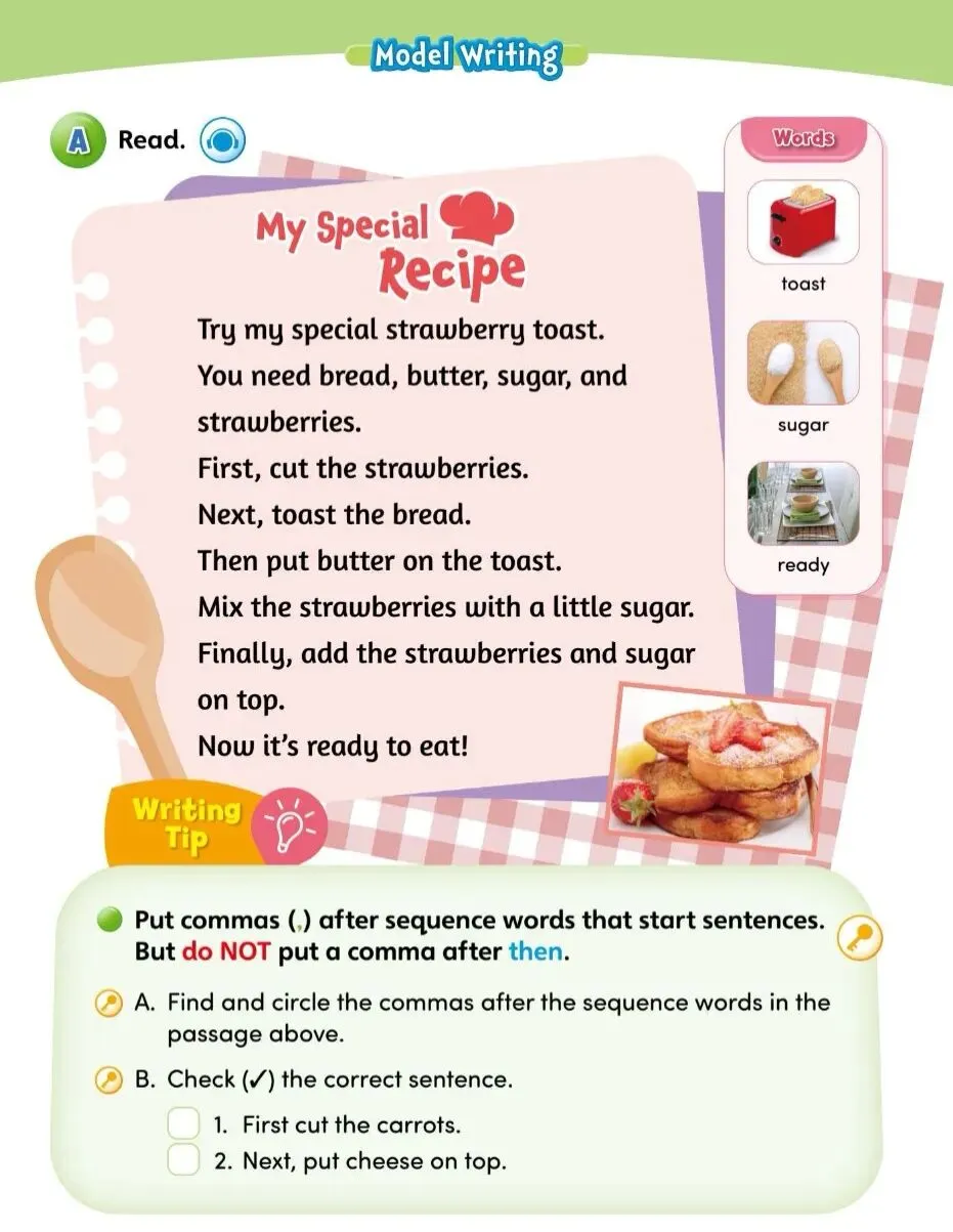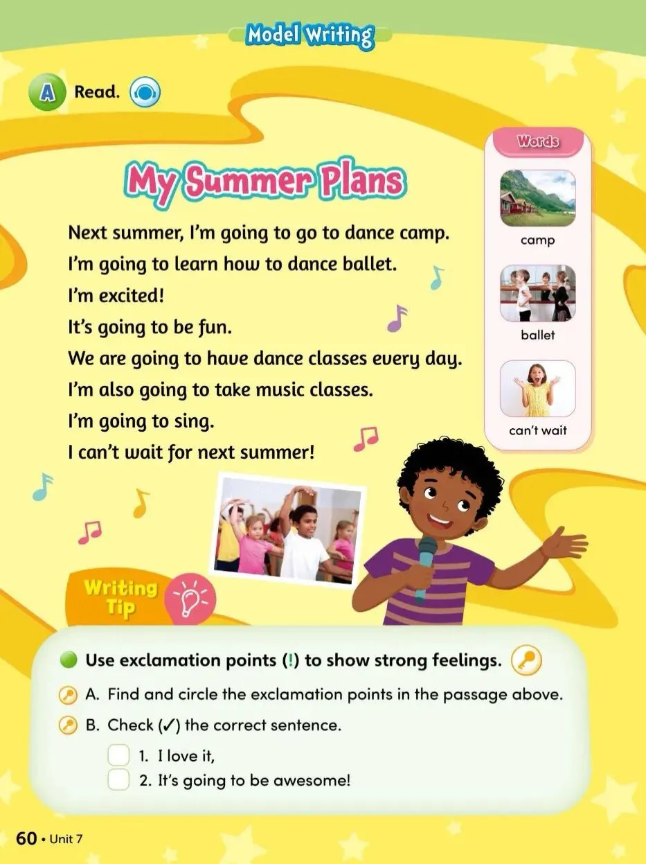 每个单元都配有原创范文,包含实用词汇和句式模板,孩子可以模仿范文创作自己的短文。