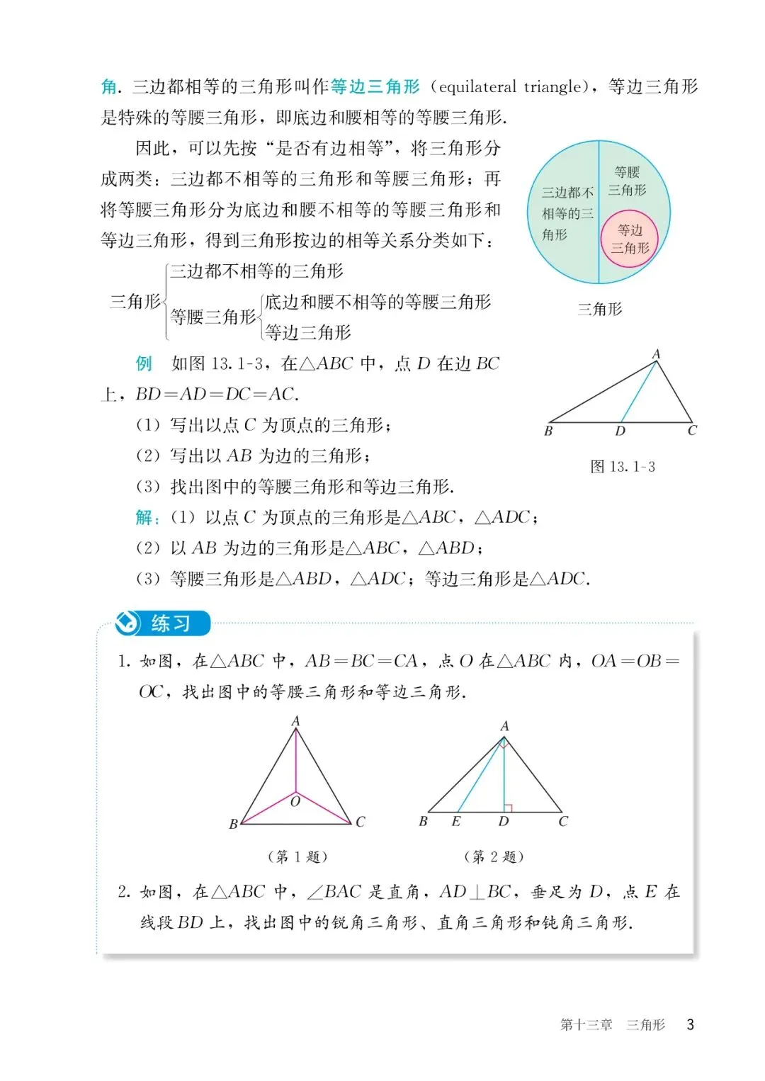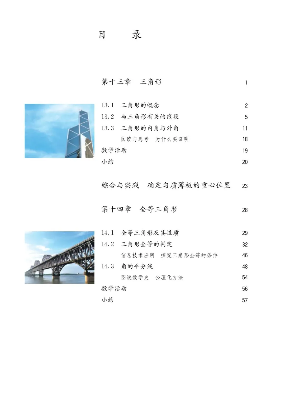 【1】第十三章 三角形:主要内容包含三角形的概念、三角形的分类、与三角形有关的线段(边、高、中线、角平分线)、三角形的内角和定理及外角性质、利用三角形确定匀质薄板的重心位置