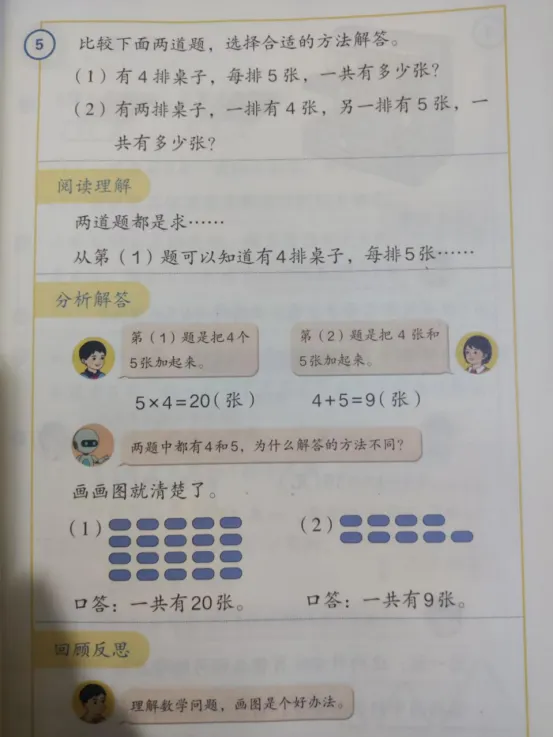 在上例中,两个算式5×4=20(张)、4+5=9(张)并列,学生可能不会明白为什么名数都是“张”,教材的设计和教师经常让学生用不完全归纳法寻找规律,这样的习惯养成当然是好的,但是就在这个例子中,会使学生发现并觉得,不管问什么,也不管是加减乘除,只要问的是“张”,最后的名数就是“张”。