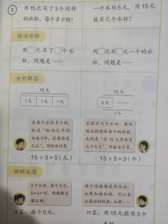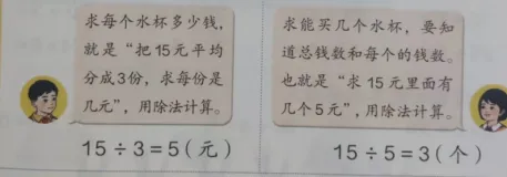 分析:求能买几个水杯,要知道总钱数和每个的钱数,也就是“求15元里有几个5元”,用除法计算。其本质含义是15里有几个5,或者把15平均分为3份,每份多少用除法。