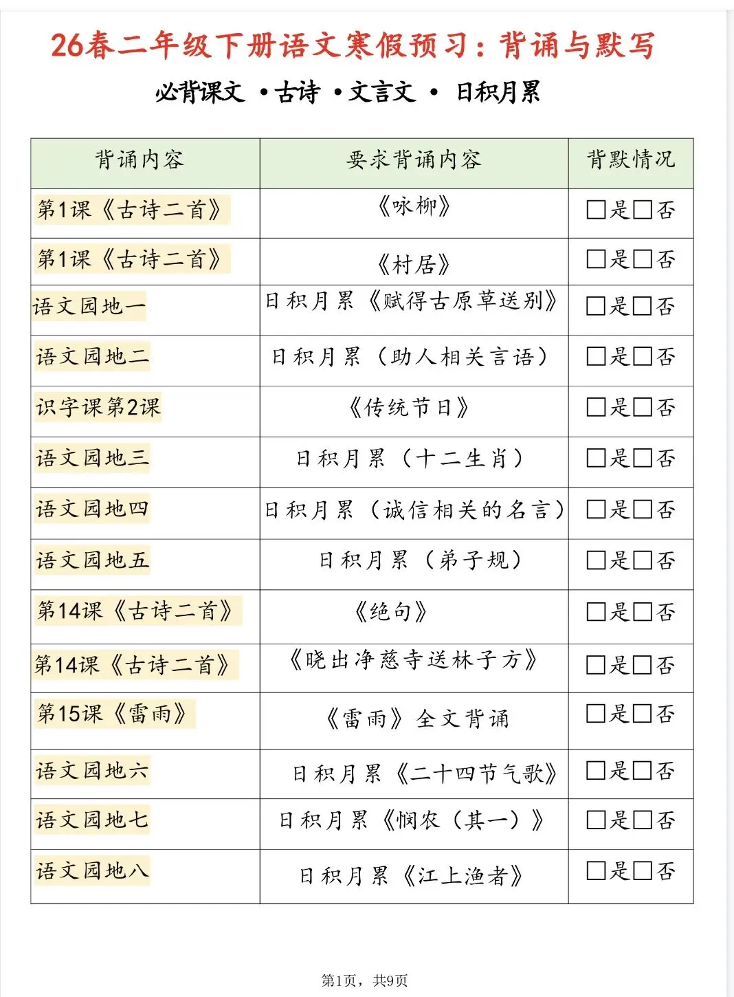 2026春新教材小学语文二年级下册寒假预习打卡手册,背诵与默写,电子版,PDF 可下载打印喜欢的家长老师们可以打印出来给孩子练练手!查漏补缺!