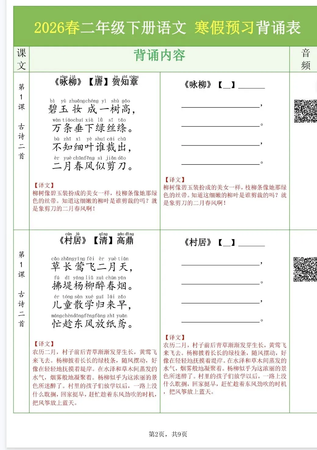 2026春新教材小学语文二年级下册寒假预习打卡手册,背诵与默写,电子版PDF 可下载打印