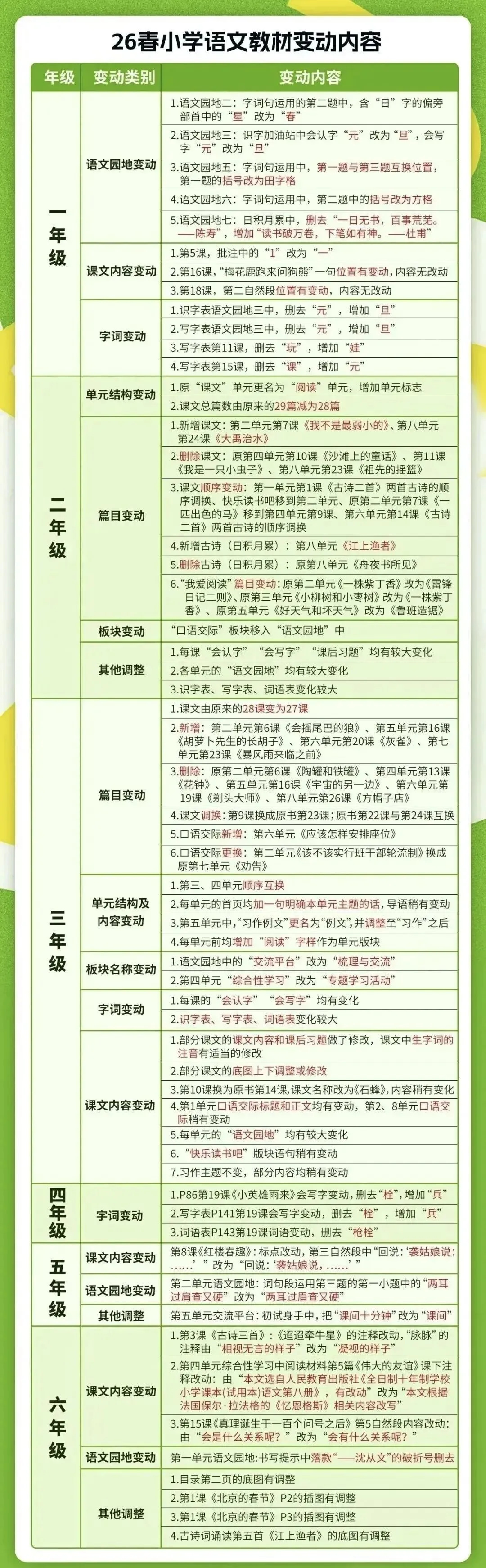 课文篇目、会认字、会写字、单元结构、语文园地等核心板块均有调整,各年级均有优化更新,具体调整幅度各有不同——其中三年级的变动尤为突出,家长和同学们可重点关注!