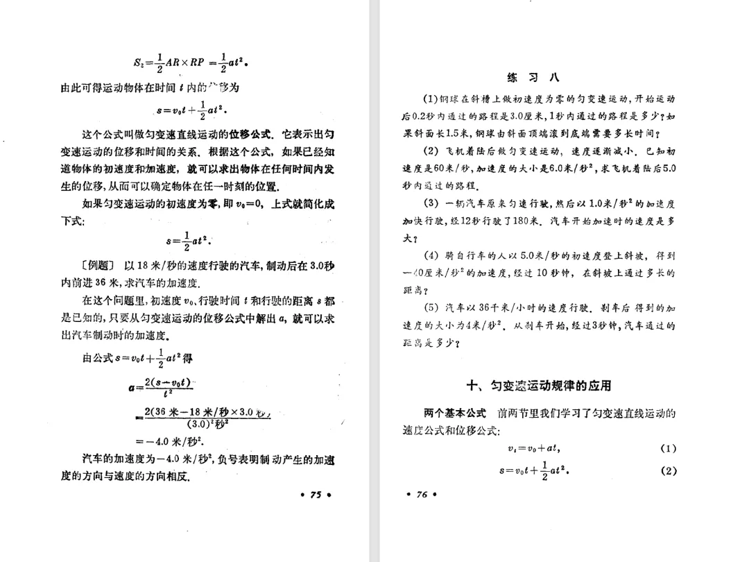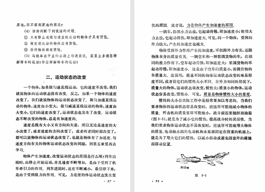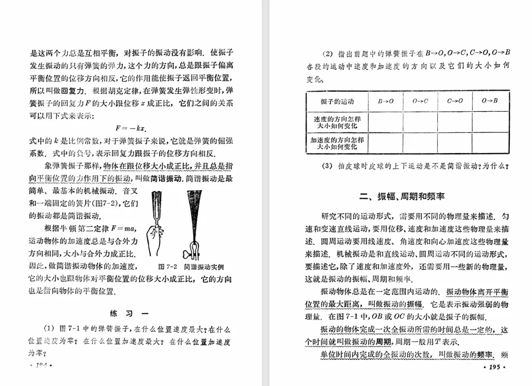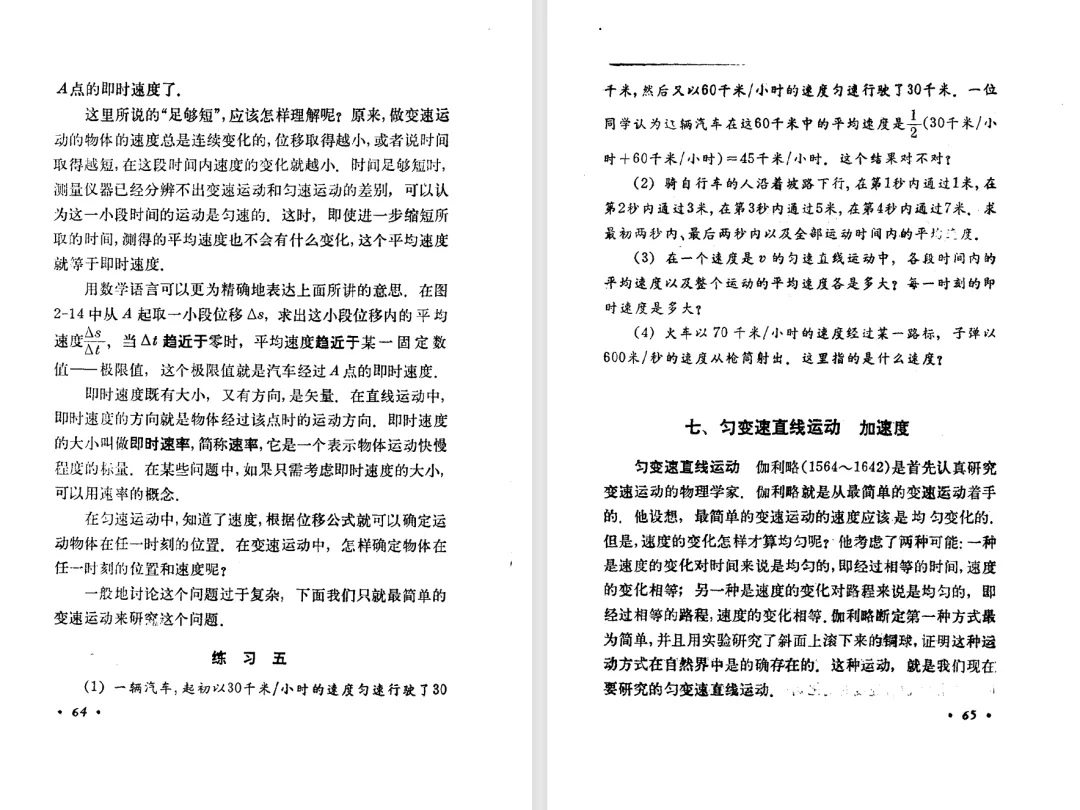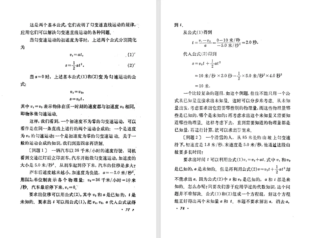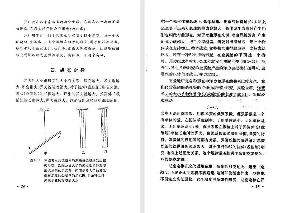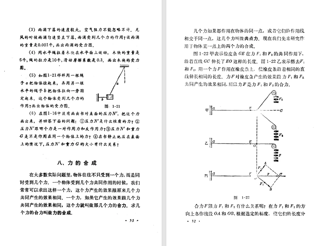 本文介绍1987年版 高级中学课本 物理 上册的详细内容。本书是八十年代 高级中学课本 物理 乙种本 上册 的第二版,在第一版的基础上进行少量修改和重新排版。为了简化称呼,本文仍将1987年版高中物理称为高中物理乙种本。接下来本文将通过对比高中物理甲种本和乙种本的方式对乙种本进行详细介绍。对比乙种本第一章和甲种本对应的内容。如下表所示,左边一列是甲种本,右边一列是乙种本。乙种本将胡克定律合并入弹力一节,将牛顿第三定律放到后面的第四章。乙种本没有专门介绍物体受力分析的小节,弱化了力学的训练,不利于应试。乙种本没有专门介绍标量和矢量、矢量运算的小节。甲种本第六章的第二节和第三节讲的都属于有固定转动轴的物体的平衡,乙种本内容少一些,只有一节。乙种本没有力偶。甲种本的平衡和种类,以及稳度,这两个小节在乙种本是选学内容。不过,甲种本没有乙种本的候风地动仪这个阅读材料。从本书开头的第一章我们就能发现乙种本的难度大幅降低。根据人民教育出版社出版的《新中国中小学教材建设史 1949-2000 研究丛书 物理卷》(简称《物理教材建设史》)的介绍,甲种本和乙种本并用时期,物理高考按甲种本命题,对于使用乙种本的学生不利。胡克定律出现在本节末尾,如下图第14页中间所示,内容很少。下面看甲种本。先看第三节 弹力。这节内容表达的意思和乙种本是相同的,但是内容要详细一些,有的例子更复杂一些。下面是第四节 胡克定律。本节不仅详细介绍了弹力与形变的关系,展示了刻画弹簧形变与弹力关系的胡克定律,还指出了胡克定律的适用范围,比乙种本详细很多。回到乙种本,看第五节 共点力的合成。本节先讲互成角度的共点力的合成,再讲共线的共点力的合成。然后,介绍矢量和标量的概念,指出矢量合成遵循平行四边形法则。下面看甲种本的内容。下图的第八节介绍力的合成,主要是互成角度的共点力的合成。教材不仅给出了力的平行四边形法则,还介绍了三角形法则。后面还有第九节介绍力的合成的计算。本节末尾,如下图第44页后半页所示,教材指出同一直线上的矢量运算也满足平行四边形法则的计算公式。有一点值得注意,甲种本有差不多两页纸介绍矢量和标量,乙种本只有短短一段话。甲种本难度大,篇幅长,乙种本难度低,篇幅短。可是,难度低就一定要对应篇幅短么?我觉得是不合适的。我反而觉得难度低的版本应该将概念解释的更详细,帮助更多的学生理解清楚概念,掌握好知识。下面看乙种本的第八节 有固定转动轴的物体的平衡。本节只有两个小标题,力矩 和 有固定转动轴的物体的平衡。本节开头有很短的两段话介绍转动的物体在什么情况下出于平衡态:静止或匀速转动。本章是第一章,教材还没有介绍运动,也没有介绍匀速圆周运动,所以教材在括号里解释了什么是匀速转动。再看甲种本对应的两个小节。下图是第二节 力对物体的转动作用。这节的第一个小标题介绍转动,转动这个概念在甲种本 第二章 直线运动 第一节 机械运动 中介绍过。段落里面有提到圆周运动的一些概念。所以,甲种本为了解释转动,使用了很多运动学的概念,这也是甲种本要把转动平衡的内容放到曲线运动之后的原因。全日制十年制高中物理,和高中物理乙种本不对转动做详细的解释,所以与物体的平衡有关的内容就和力的内容放同一章了。接下来的第三节专门讲有固定转动轴的物体的平衡,没有划分小标题,正文内容不多,乙种本还给了个例题,甲种本没有。本节末尾还有个阅读材料,候风地动仪,甲种本没有这个阅读材料。下面是甲种本的 平衡的种类 和 稳度 两个小节,比乙种本详细一些。先对比甲种本和乙种本的本章目录。甲种本有一节专门介绍机械运动的概念。乙种本把质点和位移放同一个小节,小结标题还有路程的概念,事实上甲种本也会对比位移和路程两个概念,只是没写到标题里。甲种本有一个阅读材料对比速度和加速度的区别,乙种本没有。甲种本第十节讲匀变速运动规律的应用,乙种本没有。乙种本将运动的合成放在本章末尾,甲种本放在曲线运动这章里。甲种本和乙种本的区别不仅体现在目录里,内容也有很大的差别。如下图第57页所示,乙种本借助速度计帮助读者理解即时速度,然后简单地解释物体在某一时刻或某一位置的速度叫做即时速度。前面的文章已经说过,全日制十年制高中物理对于即时速度的要求还要更高,还用位移-时间图象求即时速度。下面看乙种本第七节 匀变速直线运动的位移。这一节非常暴力,直接使用两个结论——第一,匀变速直线运动的平均速度等于初末速度的平均值;第二,匀变速直线运动的位移等于平均速度乘以时间——得出匀变速直线运动的位移公式。在页尾注解写道只有匀变速运动才能如此求平均速度。后面就是例题。接下来给出初末速度、加速度、位移的关系式,然后又是一道例题。下面看甲种本。如下图所示,甲种本采用极限思想,借助速度-时间图象求解匀变速直线运动的位移公式。接下来给出匀变速直线运动中初末速度、加速度和位移的关系。最后看红框部分,这是乙种本求解匀变速直线运动位移公式的方法。回到乙种本,看第十节 运动的合成。教材简单介绍了位移和速度的合成。如下图所示,甲种本在介绍平抛运动前介绍运动的合