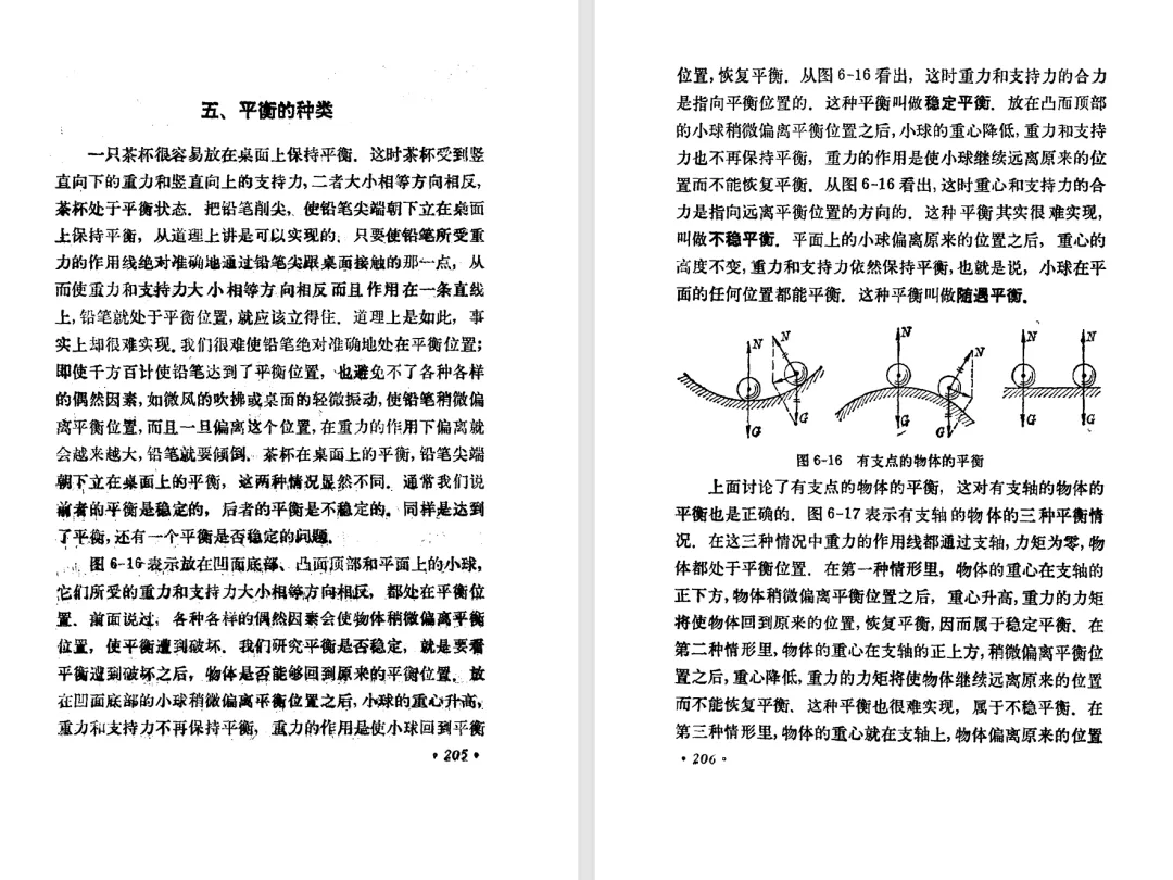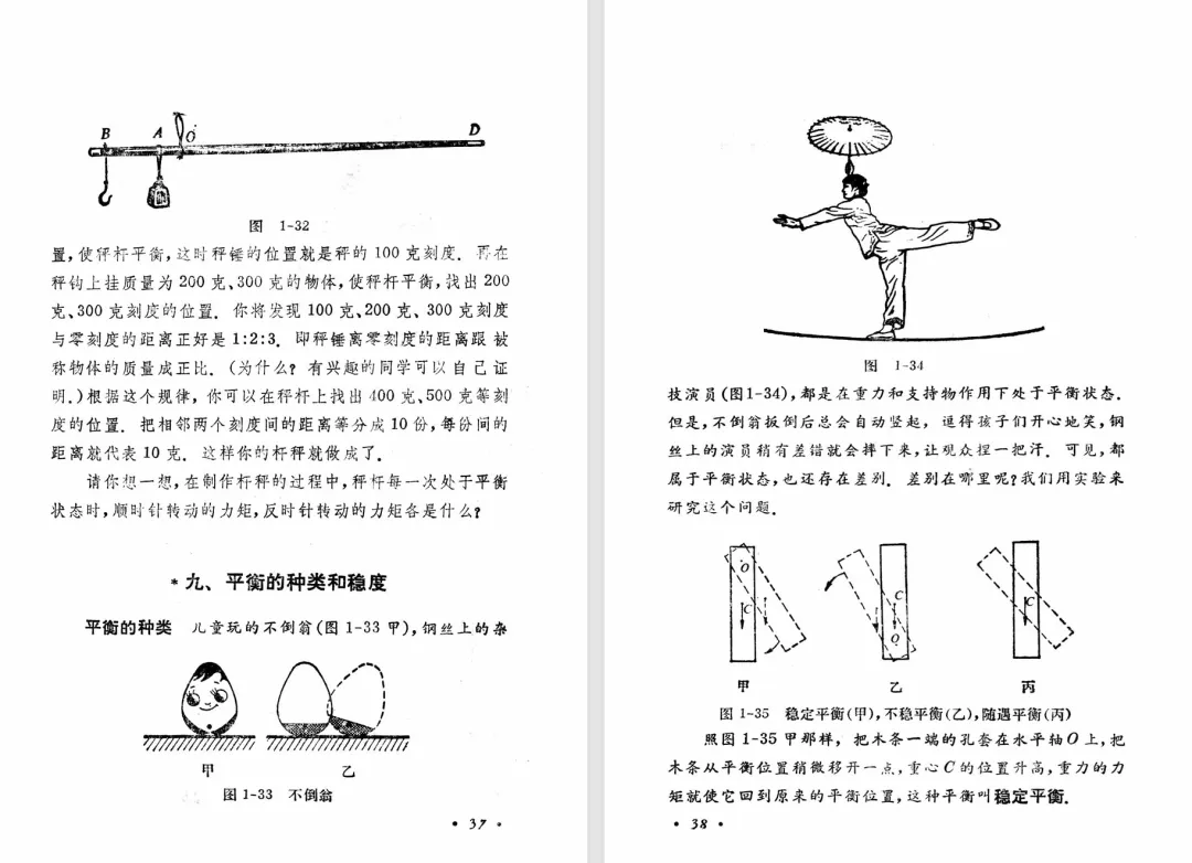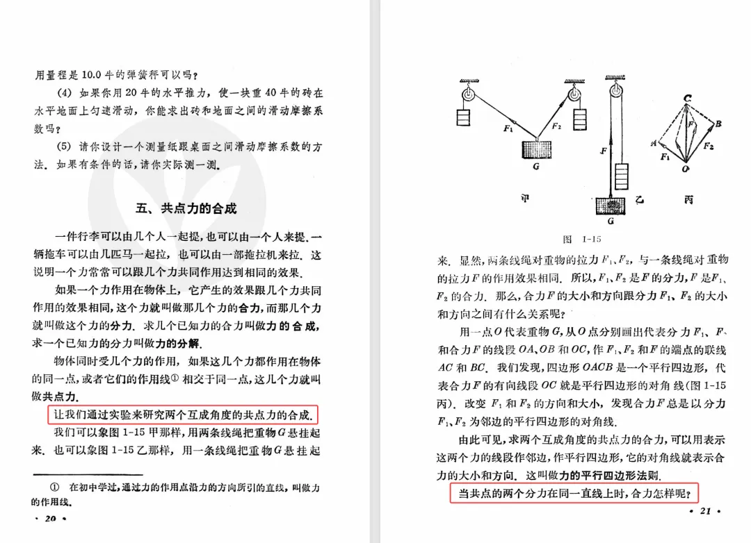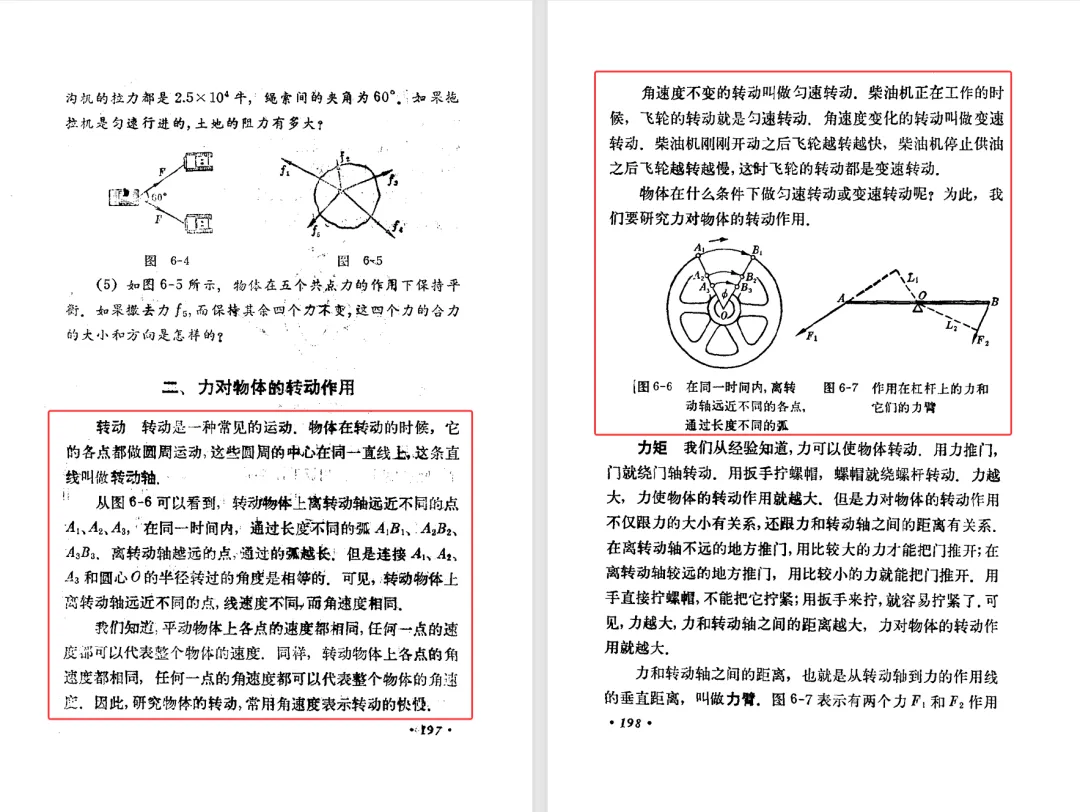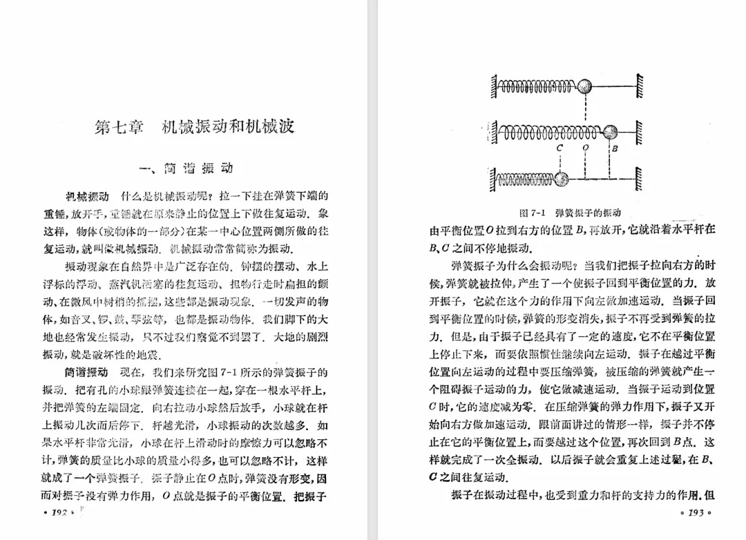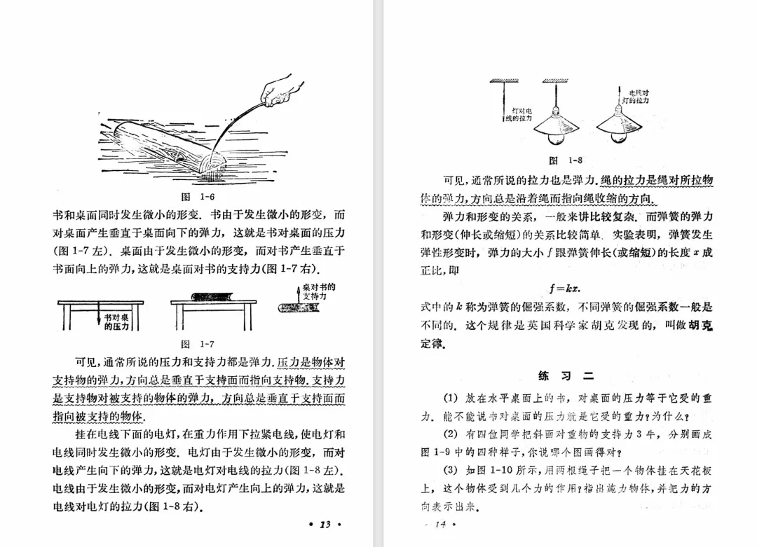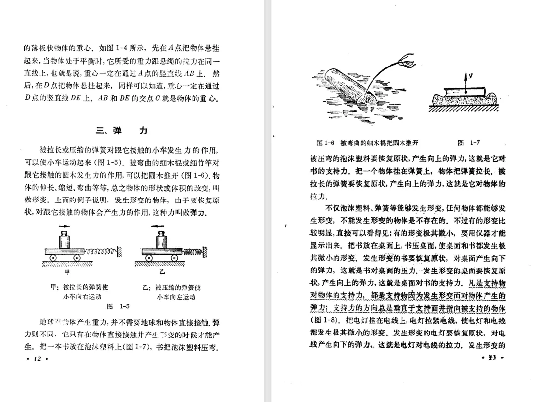 本文介绍1987年版 高级中学课本 物理 上册的详细内容。本书是八十年代 高级中学课本 物理 乙种本 上册 的第二版,在第一版的基础上进行少量修改和重新排版。为了简化称呼,本文仍将1987年版高中物理称为高中物理乙种本。接下来本文将通过对比高中物理甲种本和乙种本的方式对乙种本进行详细介绍。对比乙种本第一章和甲种本对应的内容。如下表所示,左边一列是甲种本,右边一列是乙种本。乙种本将胡克定律合并入弹力一节,将牛顿第三定律放到后面的第四章。乙种本没有专门介绍物体受力分析的小节,弱化了力学的训练,不利于应试。乙种本没有专门介绍标量和矢量、矢量运算的小节。甲种本第六章的第二节和第三节讲的都属于有固定转动轴的物体的平衡,乙种本内容少一些,只有一节。乙种本没有力偶。甲种本的平衡和种类,以及稳度,这两个小节在乙种本是选学内容。不过,甲种本没有乙种本的候风地动仪这个阅读材料。从本书开头的第一章我们就能发现乙种本的难度大幅降低。根据人民教育出版社出版的《新中国中小学教材建设史 1949-2000 研究丛书 物理卷》(简称《物理教材建设史》)的介绍,甲种本和乙种本并用时期,物理高考按甲种本命题,对于使用乙种本的学生不利。胡克定律出现在本节末尾,如下图第14页中间所示,内容很少。下面看甲种本。先看第三节 弹力。这节内容表达的意思和乙种本是相同的,但是内容要详细一些,有的例子更复杂一些。下面是第四节 胡克定律。本节不仅详细介绍了弹力与形变的关系,展示了刻画弹簧形变与弹力关系的胡克定律,还指出了胡克定律的适用范围,比乙种本详细很多。回到乙种本,看第五节 共点力的合成。本节先讲互成角度的共点力的合成,再讲共线的共点力的合成。然后,介绍矢量和标量的概念,指出矢量合成遵循平行四边形法则。下面看甲种本的内容。下图的第八节介绍力的合成,主要是互成角度的共点力的合成。教材不仅给出了力的平行四边形法则,还介绍了三角形法则。后面还有第九节介绍力的合成的计算。本节末尾,如下图第44页后半页所示,教材指出同一直线上的矢量运算也满足平行四边形法则的计算公式。有一点值得注意,甲种本有差不多两页纸介绍矢量和标量,乙种本只有短短一段话。甲种本难度大,篇幅长,乙种本难度低,篇幅短。可是,难度低就一定要对应篇幅短么?我觉得是不合适的。我反而觉得难度低的版本应该将概念解释的更详细,帮助更多的学生理解清楚概念,掌握好知识。下面看乙种本的第八节 有固定转动轴的物体的平衡。本节只有两个小标题,力矩 和 有固定转动轴的物体的平衡。本节开头有很短的两段话介绍转动的物体在什么情况下出于平衡态:静止或匀速转动。本章是第一章,教材还没有介绍运动,也没有介绍匀速圆周运动,所以教材在括号里解释了什么是匀速转动。再看甲种本对应的两个小节。下图是第二节 力对物体的转动作用。这节的第一个小标题介绍转动,转动这个概念在甲种本 第二章 直线运动 第一节 机械运动 中介绍过。段落里面有提到圆周运动的一些概念。所以,甲种本为了解释转动,使用了很多运动学的概念,这也是甲种本要把转动平衡的内容放到曲线运动之后的原因。全日制十年制高中物理,和高中物理乙种本不对转动做详细的解释,所以与物体的平衡有关的内容就和力的内容放同一章了。接下来的第三节专门讲有固定转动轴的物体的平衡,没有划分小标题,正文内容不多,乙种本还给了个例题,甲种本没有。本节末尾还有个阅读材料,候风地动仪,甲种本没有这个阅读材料。下面是甲种本的 平衡的种类 和 稳度 两个小节,比乙种本详细一些。先对比甲种本和乙种本的本章目录。甲种本有一节专门介绍机械运动的概念。乙种本把质点和位移放同一个小节,小结标题还有路程的概念,事实上甲种本也会对比位移和路程两个概念,只是没写到标题里。甲种本有一个阅读材料对比速度和加速度的区别,乙种本没有。甲种本第十节讲匀变速运动规律的应用,乙种本没有。乙种本将运动的合成放在本章末尾,甲种本放在曲线运动这章里。甲种本和乙种本的区别不仅体现在目录里,内容也有很大的差别。如下图第57页所示,乙种本借助速度计帮助读者理解即时速度,然后简单地解释物体在某一时刻或某一位置的速度叫做即时速度。前面的文章已经说过,全日制十年制高中物理对于即时速度的要求还要更高,还用位移-时间图象求即时速度。下面看乙种本第七节 匀变速直线运动的位移。这一节非常暴力,直接使用两个结论——第一,匀变速直线运动的平均速度等于初末速度的平均值;第二,匀变速直线运动的位移等于平均速度乘以时间——得出匀变速直线运动的位移公式。在页尾注解写道只有匀变速运动才能如此求平均速度。后面就是例题。接下来给出初末速度、加速度、位移的关系式,然后又是一道例题。下面看甲种本。如下图所示,甲种本采用极限思想,借助速度-时间图象求解匀变速直线运动的位移公式。接下来给出匀变速直线运动中初末速度、加速度和位移的关系。最后看红框部分,这是乙种本求解匀变速直线运动位移公式的方法。回到乙种本,看第十节 运动的合成。教材简单介绍了位移和速度的合成。如下图所示,甲种本在介绍平抛运动前介绍运动的合