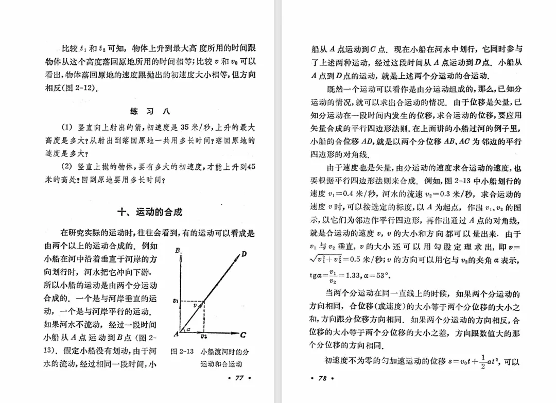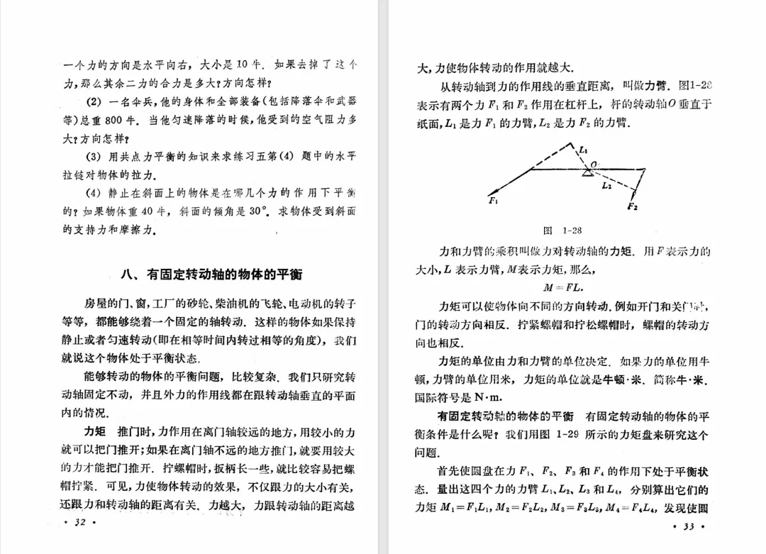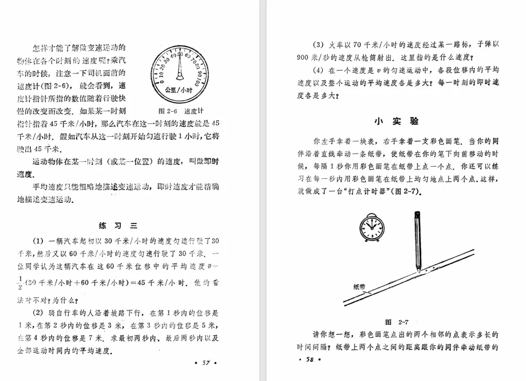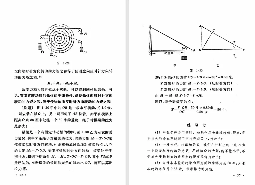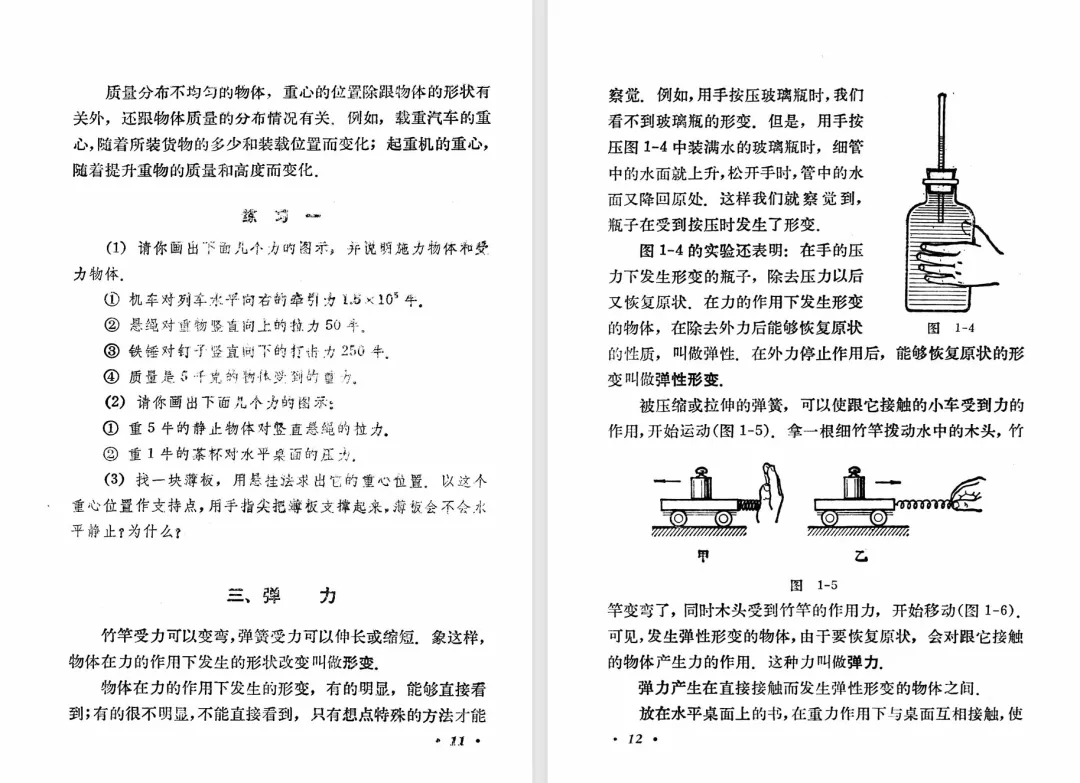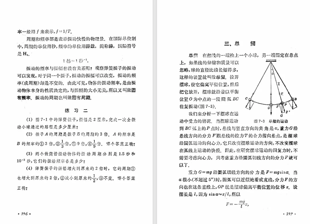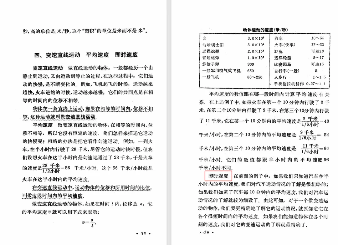 本文介绍1987年版 高级中学课本 物理 上册的详细内容。本书是八十年代 高级中学课本 物理 乙种本 上册 的第二版,在第一版的基础上进行少量修改和重新排版。为了简化称呼,本文仍将1987年版高中物理称为高中物理乙种本。接下来本文将通过对比高中物理甲种本和乙种本的方式对乙种本进行详细介绍。对比乙种本第一章和甲种本对应的内容。如下表所示,左边一列是甲种本,右边一列是乙种本。乙种本将胡克定律合并入弹力一节,将牛顿第三定律放到后面的第四章。乙种本没有专门介绍物体受力分析的小节,弱化了力学的训练,不利于应试。乙种本没有专门介绍标量和矢量、矢量运算的小节。甲种本第六章的第二节和第三节讲的都属于有固定转动轴的物体的平衡,乙种本内容少一些,只有一节。乙种本没有力偶。甲种本的平衡和种类,以及稳度,这两个小节在乙种本是选学内容。不过,甲种本没有乙种本的候风地动仪这个阅读材料。从本书开头的第一章我们就能发现乙种本的难度大幅降低。根据人民教育出版社出版的《新中国中小学教材建设史 1949-2000 研究丛书 物理卷》(简称《物理教材建设史》)的介绍,甲种本和乙种本并用时期,物理高考按甲种本命题,对于使用乙种本的学生不利。胡克定律出现在本节末尾,如下图第14页中间所示,内容很少。下面看甲种本。先看第三节 弹力。这节内容表达的意思和乙种本是相同的,但是内容要详细一些,有的例子更复杂一些。下面是第四节 胡克定律。本节不仅详细介绍了弹力与形变的关系,展示了刻画弹簧形变与弹力关系的胡克定律,还指出了胡克定律的适用范围,比乙种本详细很多。回到乙种本,看第五节 共点力的合成。本节先讲互成角度的共点力的合成,再讲共线的共点力的合成。然后,介绍矢量和标量的概念,指出矢量合成遵循平行四边形法则。下面看甲种本的内容。下图的第八节介绍力的合成,主要是互成角度的共点力的合成。教材不仅给出了力的平行四边形法则,还介绍了三角形法则。后面还有第九节介绍力的合成的计算。本节末尾,如下图第44页后半页所示,教材指出同一直线上的矢量运算也满足平行四边形法则的计算公式。有一点值得注意,甲种本有差不多两页纸介绍矢量和标量,乙种本只有短短一段话。甲种本难度大,篇幅长,乙种本难度低,篇幅短。可是,难度低就一定要对应篇幅短么?我觉得是不合适的。我反而觉得难度低的版本应该将概念解释的更详细,帮助更多的学生理解清楚概念,掌握好知识。下面看乙种本的第八节 有固定转动轴的物体的平衡。本节只有两个小标题,力矩 和 有固定转动轴的物体的平衡。本节开头有很短的两段话介绍转动的物体在什么情况下出于平衡态:静止或匀速转动。本章是第一章,教材还没有介绍运动,也没有介绍匀速圆周运动,所以教材在括号里解释了什么是匀速转动。再看甲种本对应的两个小节。下图是第二节 力对物体的转动作用。这节的第一个小标题介绍转动,转动这个概念在甲种本 第二章 直线运动 第一节 机械运动 中介绍过。段落里面有提到圆周运动的一些概念。所以,甲种本为了解释转动,使用了很多运动学的概念,这也是甲种本要把转动平衡的内容放到曲线运动之后的原因。全日制十年制高中物理,和高中物理乙种本不对转动做详细的解释,所以与物体的平衡有关的内容就和力的内容放同一章了。接下来的第三节专门讲有固定转动轴的物体的平衡,没有划分小标题,正文内容不多,乙种本还给了个例题,甲种本没有。本节末尾还有个阅读材料,候风地动仪,甲种本没有这个阅读材料。下面是甲种本的 平衡的种类 和 稳度 两个小节,比乙种本详细一些。先对比甲种本和乙种本的本章目录。甲种本有一节专门介绍机械运动的概念。乙种本把质点和位移放同一个小节,小结标题还有路程的概念,事实上甲种本也会对比位移和路程两个概念,只是没写到标题里。甲种本有一个阅读材料对比速度和加速度的区别,乙种本没有。甲种本第十节讲匀变速运动规律的应用,乙种本没有。乙种本将运动的合成放在本章末尾,甲种本放在曲线运动这章里。甲种本和乙种本的区别不仅体现在目录里,内容也有很大的差别。如下图第57页所示,乙种本借助速度计帮助读者理解即时速度,然后简单地解释物体在某一时刻或某一位置的速度叫做即时速度。前面的文章已经说过,全日制十年制高中物理对于即时速度的要求还要更高,还用位移-时间图象求即时速度。下面看乙种本第七节 匀变速直线运动的位移。这一节非常暴力,直接使用两个结论——第一,匀变速直线运动的平均速度等于初末速度的平均值;第二,匀变速直线运动的位移等于平均速度乘以时间——得出匀变速直线运动的位移公式。在页尾注解写道只有匀变速运动才能如此求平均速度。后面就是例题。接下来给出初末速度、加速度、位移的关系式,然后又是一道例题。下面看甲种本。如下图所示,甲种本采用极限思想,借助速度-时间图象求解匀变速直线运动的位移公式。接下来给出匀变速直线运动中初末速度、加速度和位移的关系。最后看红框部分,这是乙种本求解匀变速直线运动位移公式的方法。回到乙种本,看第十节 运动的合成。教材简单介绍了位移和速度的合成。如下图所示,甲种本在介绍平抛运动前介绍运动的合