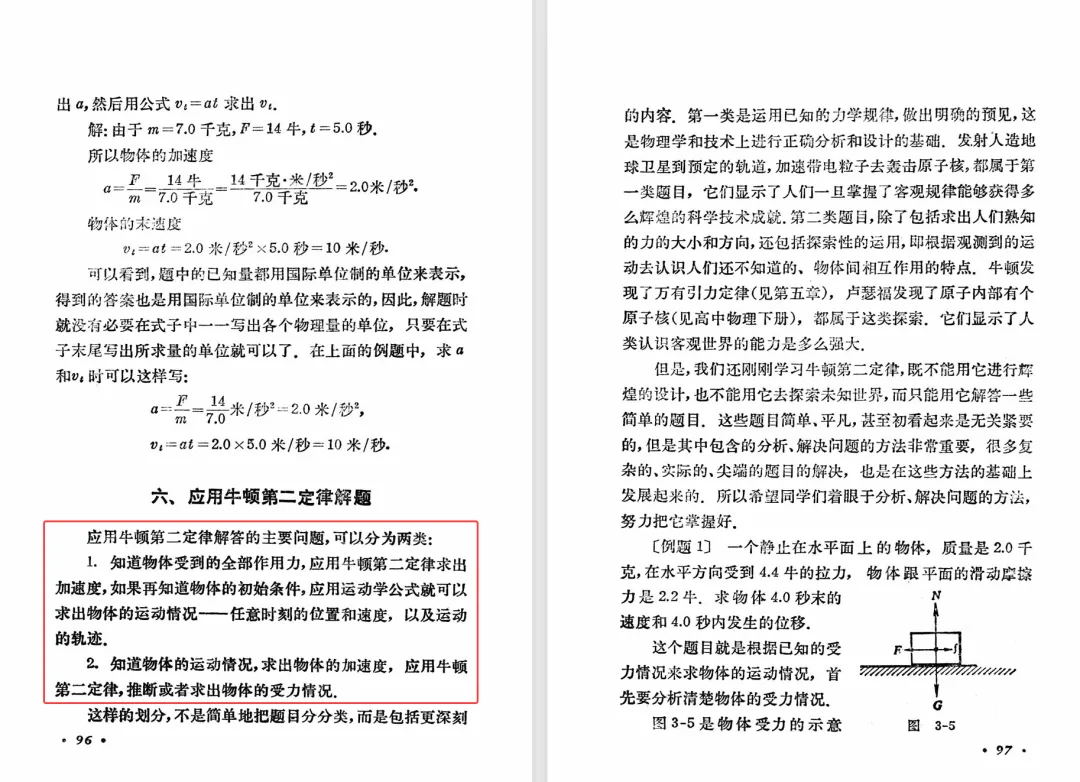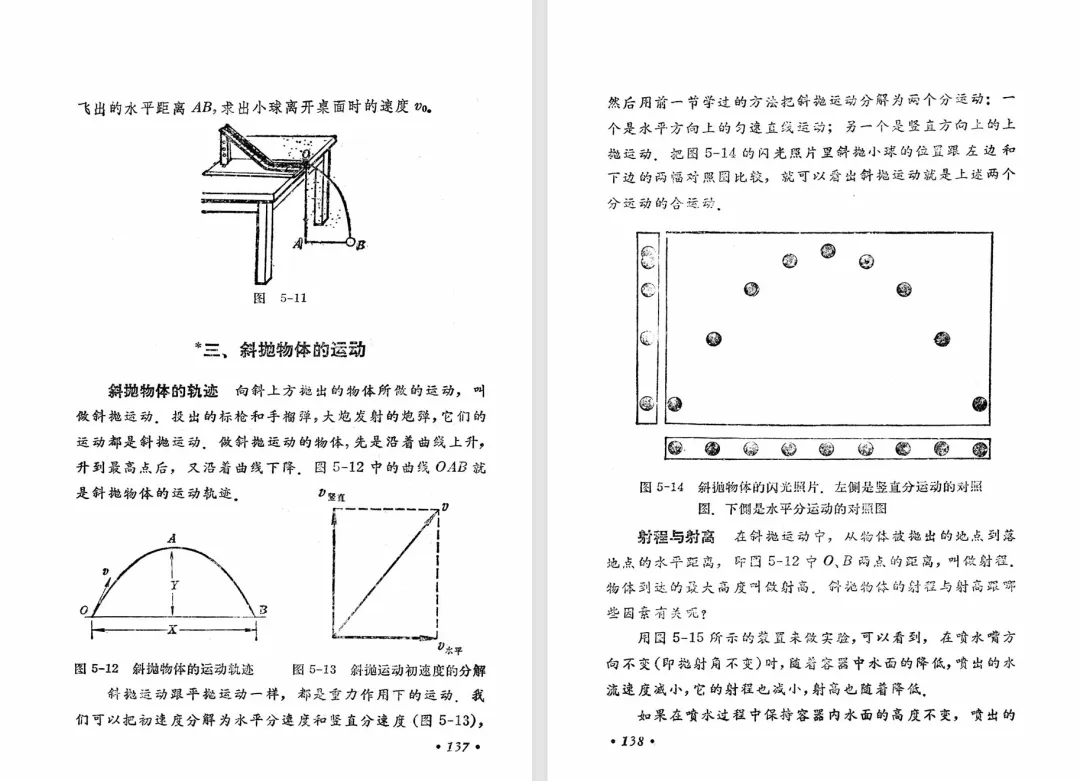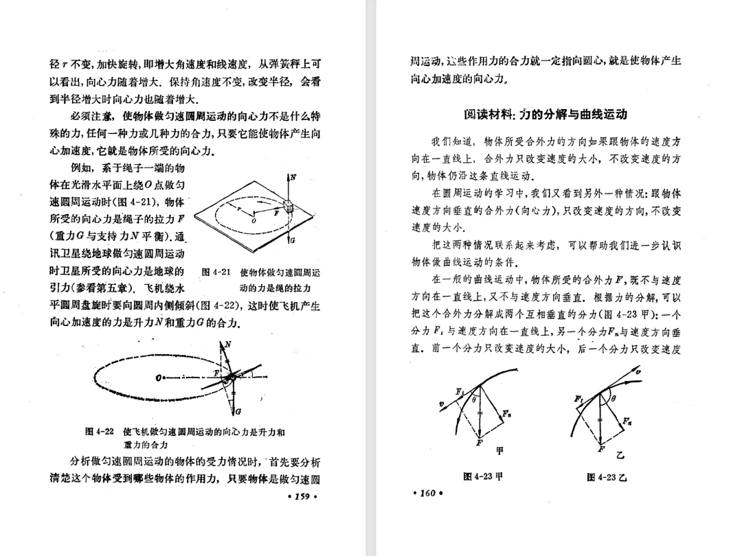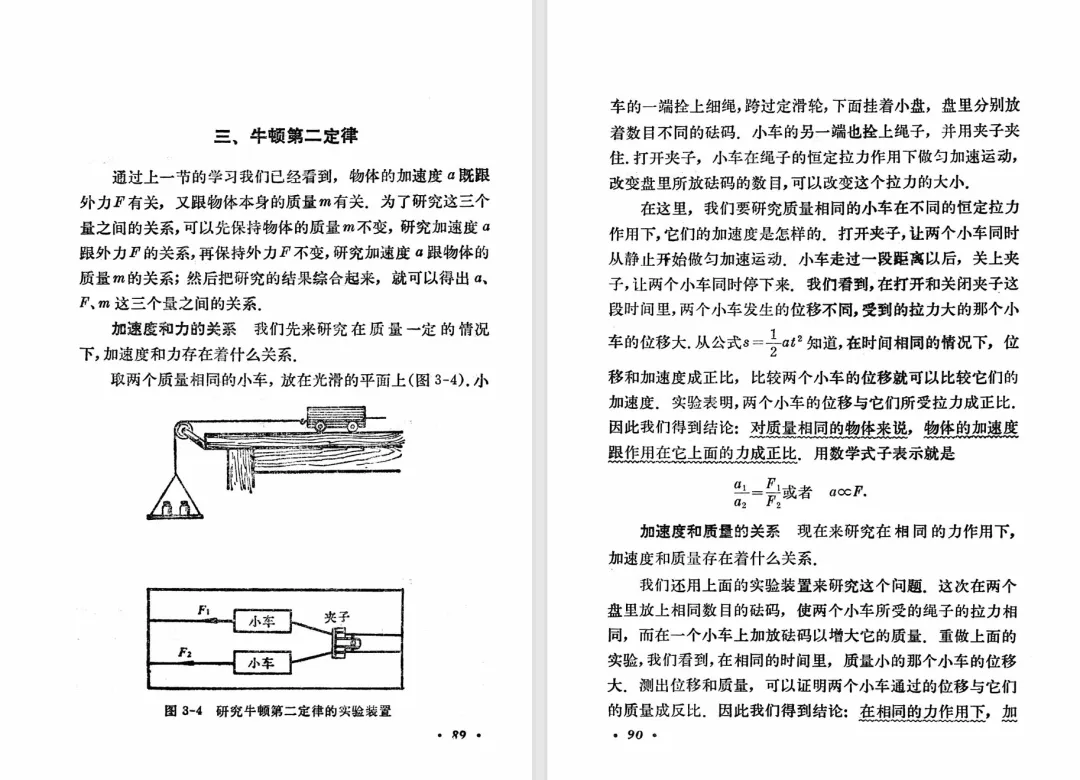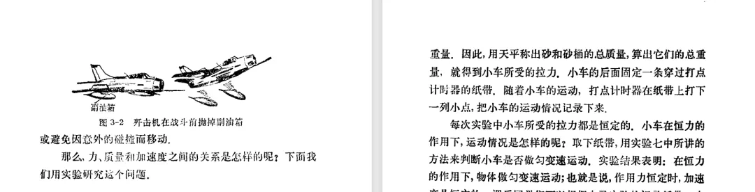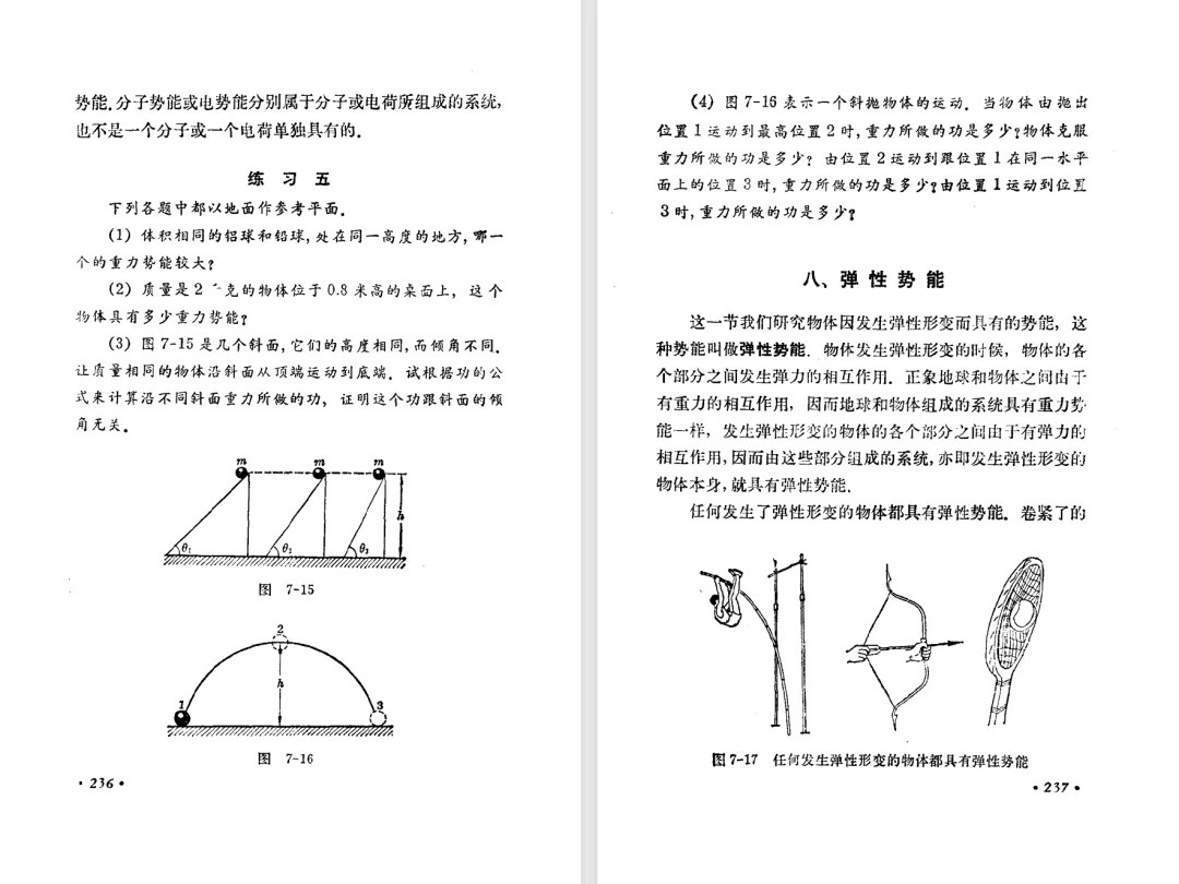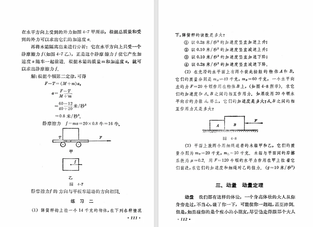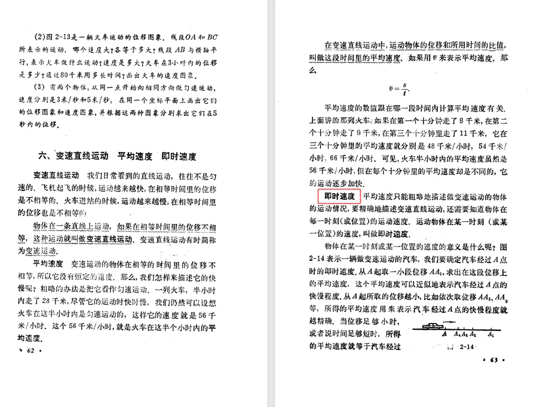本文介绍1987年版 高级中学课本 物理 上册的详细内容。本书是八十年代 高级中学课本 物理 乙种本 上册 的第二版,在第一版的基础上进行少量修改和重新排版。为了简化称呼,本文仍将1987年版高中物理称为高中物理乙种本。接下来本文将通过对比高中物理甲种本和乙种本的方式对乙种本进行详细介绍。对比乙种本第一章和甲种本对应的内容。如下表所示,左边一列是甲种本,右边一列是乙种本。乙种本将胡克定律合并入弹力一节,将牛顿第三定律放到后面的第四章。乙种本没有专门介绍物体受力分析的小节,弱化了力学的训练,不利于应试。乙种本没有专门介绍标量和矢量、矢量运算的小节。甲种本第六章的第二节和第三节讲的都属于有固定转动轴的物体的平衡,乙种本内容少一些,只有一节。乙种本没有力偶。甲种本的平衡和种类,以及稳度,这两个小节在乙种本是选学内容。不过,甲种本没有乙种本的候风地动仪这个阅读材料。从本书开头的第一章我们就能发现乙种本的难度大幅降低。根据人民教育出版社出版的《新中国中小学教材建设史 1949-2000 研究丛书 物理卷》(简称《物理教材建设史》)的介绍,甲种本和乙种本并用时期,物理高考按甲种本命题,对于使用乙种本的学生不利。胡克定律出现在本节末尾,如下图第14页中间所示,内容很少。下面看甲种本。先看第三节 弹力。这节内容表达的意思和乙种本是相同的,但是内容要详细一些,有的例子更复杂一些。下面是第四节 胡克定律。本节不仅详细介绍了弹力与形变的关系,展示了刻画弹簧形变与弹力关系的胡克定律,还指出了胡克定律的适用范围,比乙种本详细很多。回到乙种本,看第五节 共点力的合成。本节先讲互成角度的共点力的合成,再讲共线的共点力的合成。然后,介绍矢量和标量的概念,指出矢量合成遵循平行四边形法则。下面看甲种本的内容。下图的第八节介绍力的合成,主要是互成角度的共点力的合成。教材不仅给出了力的平行四边形法则,还介绍了三角形法则。后面还有第九节介绍力的合成的计算。本节末尾,如下图第44页后半页所示,教材指出同一直线上的矢量运算也满足平行四边形法则的计算公式。有一点值得注意,甲种本有差不多两页纸介绍矢量和标量,乙种本只有短短一段话。甲种本难度大,篇幅长,乙种本难度低,篇幅短。可是,难度低就一定要对应篇幅短么?我觉得是不合适的。我反而觉得难度低的版本应该将概念解释的更详细,帮助更多的学生理解清楚概念,掌握好知识。下面看乙种本的第八节 有固定转动轴的物体的平衡。本节只有两个小标题,力矩 和 有固定转动轴的物体的平衡。本节开头有很短的两段话介绍转动的物体在什么情况下出于平衡态:静止或匀速转动。本章是第一章,教材还没有介绍运动,也没有介绍匀速圆周运动,所以教材在括号里解释了什么是匀速转动。再看甲种本对应的两个小节。下图是第二节 力对物体的转动作用。这节的第一个小标题介绍转动,转动这个概念在甲种本 第二章 直线运动 第一节 机械运动 中介绍过。段落里面有提到圆周运动的一些概念。所以,甲种本为了解释转动,使用了很多运动学的概念,这也是甲种本要把转动平衡的内容放到曲线运动之后的原因。全日制十年制高中物理,和高中物理乙种本不对转动做详细的解释,所以与物体的平衡有关的内容就和力的内容放同一章了。接下来的第三节专门讲有固定转动轴的物体的平衡,没有划分小标题,正文内容不多,乙种本还给了个例题,甲种本没有。本节末尾还有个阅读材料,候风地动仪,甲种本没有这个阅读材料。下面是甲种本的 平衡的种类 和 稳度 两个小节,比乙种本详细一些。先对比甲种本和乙种本的本章目录。甲种本有一节专门介绍机械运动的概念。乙种本把质点和位移放同一个小节,小结标题还有路程的概念,事实上甲种本也会对比位移和路程两个概念,只是没写到标题里。甲种本有一个阅读材料对比速度和加速度的区别,乙种本没有。甲种本第十节讲匀变速运动规律的应用,乙种本没有。乙种本将运动的合成放在本章末尾,甲种本放在曲线运动这章里。甲种本和乙种本的区别不仅体现在目录里,内容也有很大的差别。如下图第57页所示,乙种本借助速度计帮助读者理解即时速度,然后简单地解释物体在某一时刻或某一位置的速度叫做即时速度。前面的文章已经说过,全日制十年制高中物理对于即时速度的要求还要更高,还用位移-时间图象求即时速度。下面看乙种本第七节 匀变速直线运动的位移。这一节非常暴力,直接使用两个结论——第一,匀变速直线运动的平均速度等于初末速度的平均值;第二,匀变速直线运动的位移等于平均速度乘以时间——得出匀变速直线运动的位移公式。在页尾注解写道只有匀变速运动才能如此求平均速度。后面就是例题。接下来给出初末速度、加速度、位移的关系式,然后又是一道例题。下面看甲种本。如下图所示,甲种本采用极限思想,借助速度-时间图象求解匀变速直线运动的位移公式。接下来给出匀变速直线运动中初末速度、加速度和位移的关系。最后看红框部分,这是乙种本求解匀变速直线运动位移公式的方法。回到乙种本,看第十节 运动的合成。教材简单介绍了位移和速度的合成。如下图所示,甲种本在介绍平抛运动前介绍运动的合