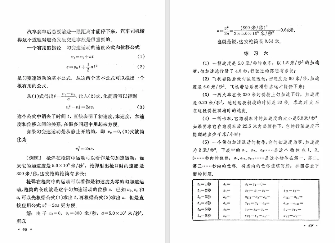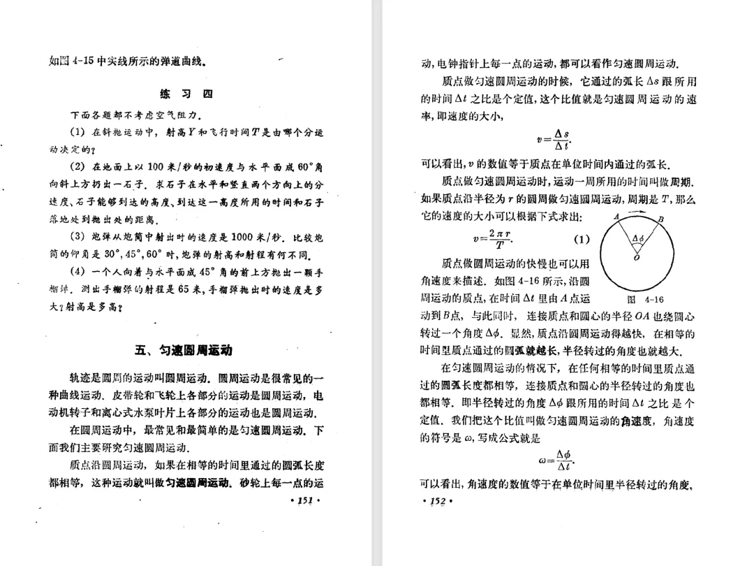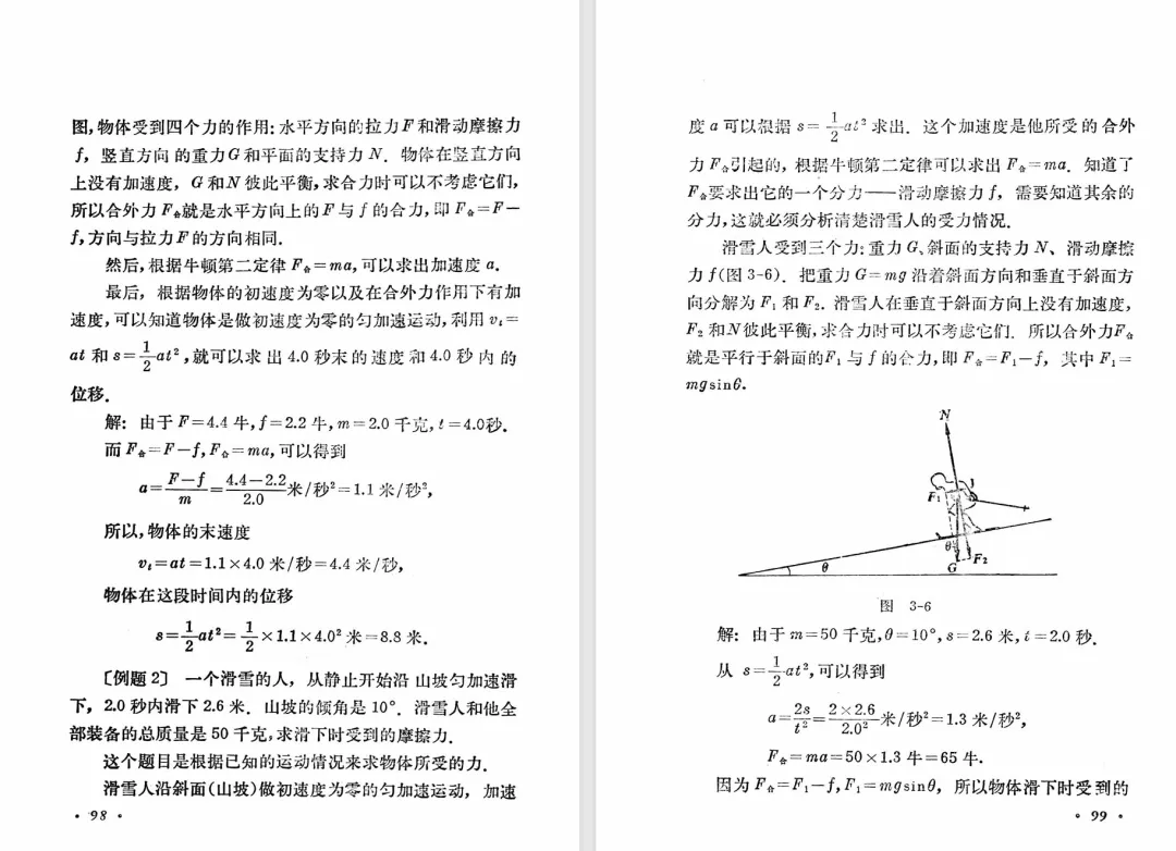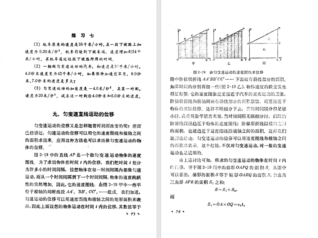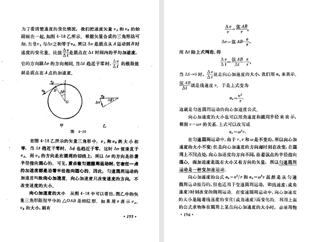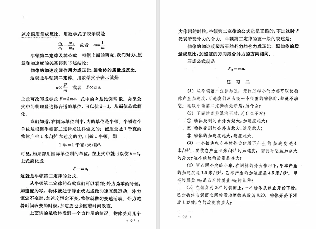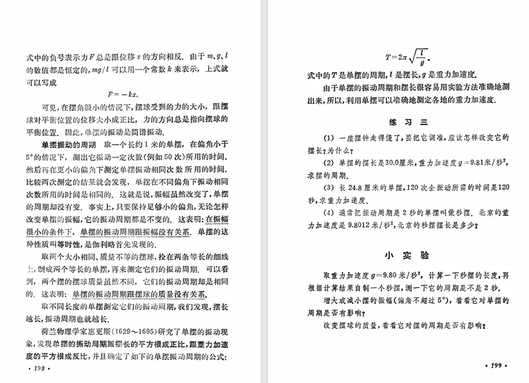 本文介绍1987年版 高级中学课本 物理 上册的详细内容。本书是八十年代 高级中学课本 物理 乙种本 上册 的第二版,在第一版的基础上进行少量修改和重新排版。为了简化称呼,本文仍将1987年版高中物理称为高中物理乙种本。接下来本文将通过对比高中物理甲种本和乙种本的方式对乙种本进行详细介绍。对比乙种本第一章和甲种本对应的内容。如下表所示,左边一列是甲种本,右边一列是乙种本。乙种本将胡克定律合并入弹力一节,将牛顿第三定律放到后面的第四章。乙种本没有专门介绍物体受力分析的小节,弱化了力学的训练,不利于应试。乙种本没有专门介绍标量和矢量、矢量运算的小节。甲种本第六章的第二节和第三节讲的都属于有固定转动轴的物体的平衡,乙种本内容少一些,只有一节。乙种本没有力偶。甲种本的平衡和种类,以及稳度,这两个小节在乙种本是选学内容。不过,甲种本没有乙种本的候风地动仪这个阅读材料。从本书开头的第一章我们就能发现乙种本的难度大幅降低。根据人民教育出版社出版的《新中国中小学教材建设史 1949-2000 研究丛书 物理卷》(简称《物理教材建设史》)的介绍,甲种本和乙种本并用时期,物理高考按甲种本命题,对于使用乙种本的学生不利。胡克定律出现在本节末尾,如下图第14页中间所示,内容很少。下面看甲种本。先看第三节 弹力。这节内容表达的意思和乙种本是相同的,但是内容要详细一些,有的例子更复杂一些。下面是第四节 胡克定律。本节不仅详细介绍了弹力与形变的关系,展示了刻画弹簧形变与弹力关系的胡克定律,还指出了胡克定律的适用范围,比乙种本详细很多。回到乙种本,看第五节 共点力的合成。本节先讲互成角度的共点力的合成,再讲共线的共点力的合成。然后,介绍矢量和标量的概念,指出矢量合成遵循平行四边形法则。下面看甲种本的内容。下图的第八节介绍力的合成,主要是互成角度的共点力的合成。教材不仅给出了力的平行四边形法则,还介绍了三角形法则。后面还有第九节介绍力的合成的计算。本节末尾,如下图第44页后半页所示,教材指出同一直线上的矢量运算也满足平行四边形法则的计算公式。有一点值得注意,甲种本有差不多两页纸介绍矢量和标量,乙种本只有短短一段话。甲种本难度大,篇幅长,乙种本难度低,篇幅短。可是,难度低就一定要对应篇幅短么?我觉得是不合适的。我反而觉得难度低的版本应该将概念解释的更详细,帮助更多的学生理解清楚概念,掌握好知识。下面看乙种本的第八节 有固定转动轴的物体的平衡。本节只有两个小标题,力矩 和 有固定转动轴的物体的平衡。本节开头有很短的两段话介绍转动的物体在什么情况下出于平衡态:静止或匀速转动。本章是第一章,教材还没有介绍运动,也没有介绍匀速圆周运动,所以教材在括号里解释了什么是匀速转动。再看甲种本对应的两个小节。下图是第二节 力对物体的转动作用。这节的第一个小标题介绍转动,转动这个概念在甲种本 第二章 直线运动 第一节 机械运动 中介绍过。段落里面有提到圆周运动的一些概念。所以,甲种本为了解释转动,使用了很多运动学的概念,这也是甲种本要把转动平衡的内容放到曲线运动之后的原因。全日制十年制高中物理,和高中物理乙种本不对转动做详细的解释,所以与物体的平衡有关的内容就和力的内容放同一章了。接下来的第三节专门讲有固定转动轴的物体的平衡,没有划分小标题,正文内容不多,乙种本还给了个例题,甲种本没有。本节末尾还有个阅读材料,候风地动仪,甲种本没有这个阅读材料。下面是甲种本的 平衡的种类 和 稳度 两个小节,比乙种本详细一些。先对比甲种本和乙种本的本章目录。甲种本有一节专门介绍机械运动的概念。乙种本把质点和位移放同一个小节,小结标题还有路程的概念,事实上甲种本也会对比位移和路程两个概念,只是没写到标题里。甲种本有一个阅读材料对比速度和加速度的区别,乙种本没有。甲种本第十节讲匀变速运动规律的应用,乙种本没有。乙种本将运动的合成放在本章末尾,甲种本放在曲线运动这章里。甲种本和乙种本的区别不仅体现在目录里,内容也有很大的差别。如下图第57页所示,乙种本借助速度计帮助读者理解即时速度,然后简单地解释物体在某一时刻或某一位置的速度叫做即时速度。前面的文章已经说过,全日制十年制高中物理对于即时速度的要求还要更高,还用位移-时间图象求即时速度。下面看乙种本第七节 匀变速直线运动的位移。这一节非常暴力,直接使用两个结论——第一,匀变速直线运动的平均速度等于初末速度的平均值;第二,匀变速直线运动的位移等于平均速度乘以时间——得出匀变速直线运动的位移公式。在页尾注解写道只有匀变速运动才能如此求平均速度。后面就是例题。接下来给出初末速度、加速度、位移的关系式,然后又是一道例题。下面看甲种本。如下图所示,甲种本采用极限思想,借助速度-时间图象求解匀变速直线运动的位移公式。接下来给出匀变速直线运动中初末速度、加速度和位移的关系。最后看红框部分,这是乙种本求解匀变速直线运动位移公式的方法。回到乙种本,看第十节 运动的合成。教材简单介绍了位移和速度的合成。如下图所示,甲种本在介绍平抛运动前介绍运动的合