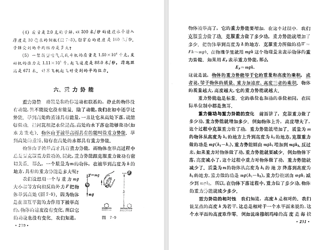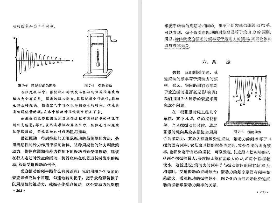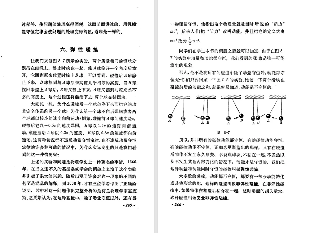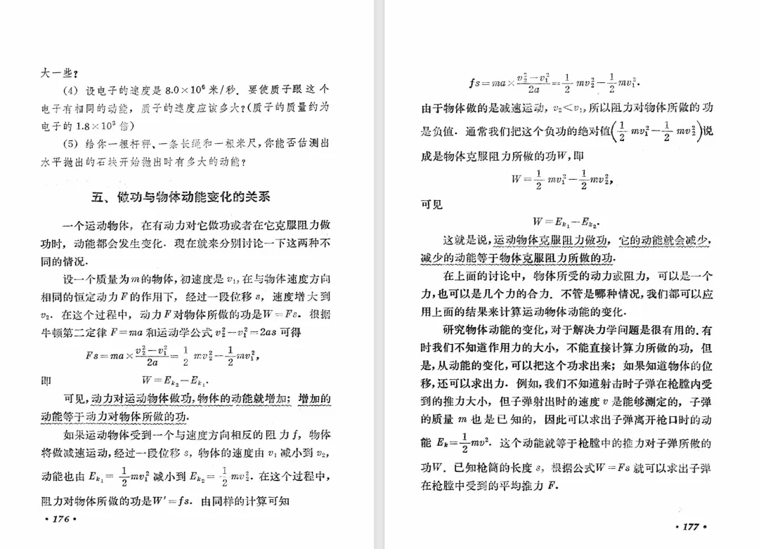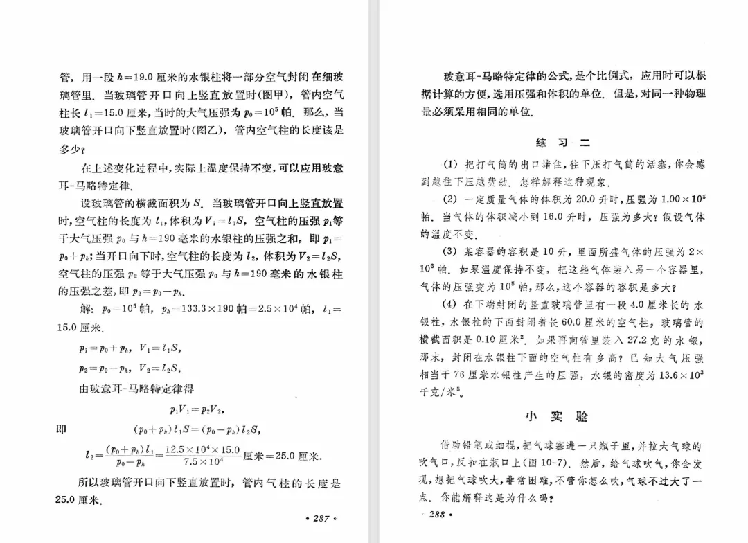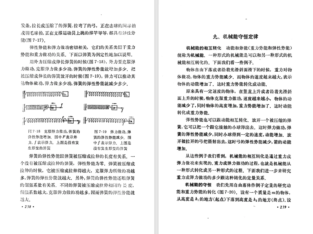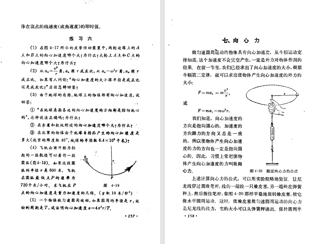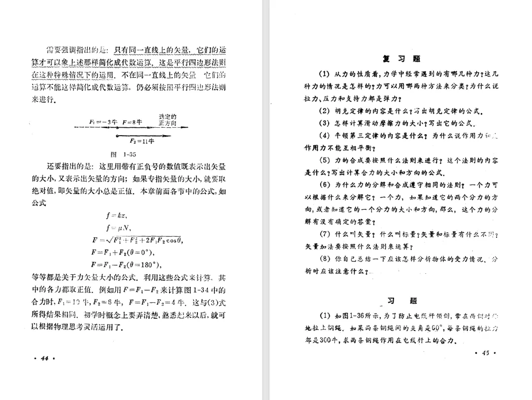 本文介绍1987年版 高级中学课本 物理 上册的详细内容。本书是八十年代 高级中学课本 物理 乙种本 上册 的第二版,在第一版的基础上进行少量修改和重新排版。为了简化称呼,本文仍将1987年版高中物理称为高中物理乙种本。接下来本文将通过对比高中物理甲种本和乙种本的方式对乙种本进行详细介绍。对比乙种本第一章和甲种本对应的内容。如下表所示,左边一列是甲种本,右边一列是乙种本。乙种本将胡克定律合并入弹力一节,将牛顿第三定律放到后面的第四章。乙种本没有专门介绍物体受力分析的小节,弱化了力学的训练,不利于应试。乙种本没有专门介绍标量和矢量、矢量运算的小节。甲种本第六章的第二节和第三节讲的都属于有固定转动轴的物体的平衡,乙种本内容少一些,只有一节。乙种本没有力偶。甲种本的平衡和种类,以及稳度,这两个小节在乙种本是选学内容。不过,甲种本没有乙种本的候风地动仪这个阅读材料。从本书开头的第一章我们就能发现乙种本的难度大幅降低。根据人民教育出版社出版的《新中国中小学教材建设史 1949-2000 研究丛书 物理卷》(简称《物理教材建设史》)的介绍,甲种本和乙种本并用时期,物理高考按甲种本命题,对于使用乙种本的学生不利。胡克定律出现在本节末尾,如下图第14页中间所示,内容很少。下面看甲种本。先看第三节 弹力。这节内容表达的意思和乙种本是相同的,但是内容要详细一些,有的例子更复杂一些。下面是第四节 胡克定律。本节不仅详细介绍了弹力与形变的关系,展示了刻画弹簧形变与弹力关系的胡克定律,还指出了胡克定律的适用范围,比乙种本详细很多。回到乙种本,看第五节 共点力的合成。本节先讲互成角度的共点力的合成,再讲共线的共点力的合成。然后,介绍矢量和标量的概念,指出矢量合成遵循平行四边形法则。下面看甲种本的内容。下图的第八节介绍力的合成,主要是互成角度的共点力的合成。教材不仅给出了力的平行四边形法则,还介绍了三角形法则。后面还有第九节介绍力的合成的计算。本节末尾,如下图第44页后半页所示,教材指出同一直线上的矢量运算也满足平行四边形法则的计算公式。有一点值得注意,甲种本有差不多两页纸介绍矢量和标量,乙种本只有短短一段话。甲种本难度大,篇幅长,乙种本难度低,篇幅短。可是,难度低就一定要对应篇幅短么?我觉得是不合适的。我反而觉得难度低的版本应该将概念解释的更详细,帮助更多的学生理解清楚概念,掌握好知识。下面看乙种本的第八节 有固定转动轴的物体的平衡。本节只有两个小标题,力矩 和 有固定转动轴的物体的平衡。本节开头有很短的两段话介绍转动的物体在什么情况下出于平衡态:静止或匀速转动。本章是第一章,教材还没有介绍运动,也没有介绍匀速圆周运动,所以教材在括号里解释了什么是匀速转动。再看甲种本对应的两个小节。下图是第二节 力对物体的转动作用。这节的第一个小标题介绍转动,转动这个概念在甲种本 第二章 直线运动 第一节 机械运动 中介绍过。段落里面有提到圆周运动的一些概念。所以,甲种本为了解释转动,使用了很多运动学的概念,这也是甲种本要把转动平衡的内容放到曲线运动之后的原因。全日制十年制高中物理,和高中物理乙种本不对转动做详细的解释,所以与物体的平衡有关的内容就和力的内容放同一章了。接下来的第三节专门讲有固定转动轴的物体的平衡,没有划分小标题,正文内容不多,乙种本还给了个例题,甲种本没有。本节末尾还有个阅读材料,候风地动仪,甲种本没有这个阅读材料。下面是甲种本的 平衡的种类 和 稳度 两个小节,比乙种本详细一些。先对比甲种本和乙种本的本章目录。甲种本有一节专门介绍机械运动的概念。乙种本把质点和位移放同一个小节,小结标题还有路程的概念,事实上甲种本也会对比位移和路程两个概念,只是没写到标题里。甲种本有一个阅读材料对比速度和加速度的区别,乙种本没有。甲种本第十节讲匀变速运动规律的应用,乙种本没有。乙种本将运动的合成放在本章末尾,甲种本放在曲线运动这章里。甲种本和乙种本的区别不仅体现在目录里,内容也有很大的差别。如下图第57页所示,乙种本借助速度计帮助读者理解即时速度,然后简单地解释物体在某一时刻或某一位置的速度叫做即时速度。前面的文章已经说过,全日制十年制高中物理对于即时速度的要求还要更高,还用位移-时间图象求即时速度。下面看乙种本第七节 匀变速直线运动的位移。这一节非常暴力,直接使用两个结论——第一,匀变速直线运动的平均速度等于初末速度的平均值;第二,匀变速直线运动的位移等于平均速度乘以时间——得出匀变速直线运动的位移公式。在页尾注解写道只有匀变速运动才能如此求平均速度。后面就是例题。接下来给出初末速度、加速度、位移的关系式,然后又是一道例题。下面看甲种本。如下图所示,甲种本采用极限思想,借助速度-时间图象求解匀变速直线运动的位移公式。接下来给出匀变速直线运动中初末速度、加速度和位移的关系。最后看红框部分,这是乙种本求解匀变速直线运动位移公式的方法。回到乙种本,看第十节 运动的合成。教材简单介绍了位移和速度的合成。如下图所示,甲种本在介绍平抛运动前介绍运动的合