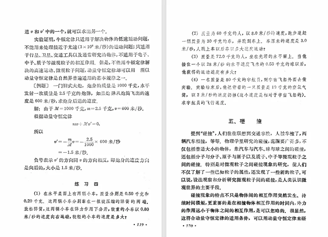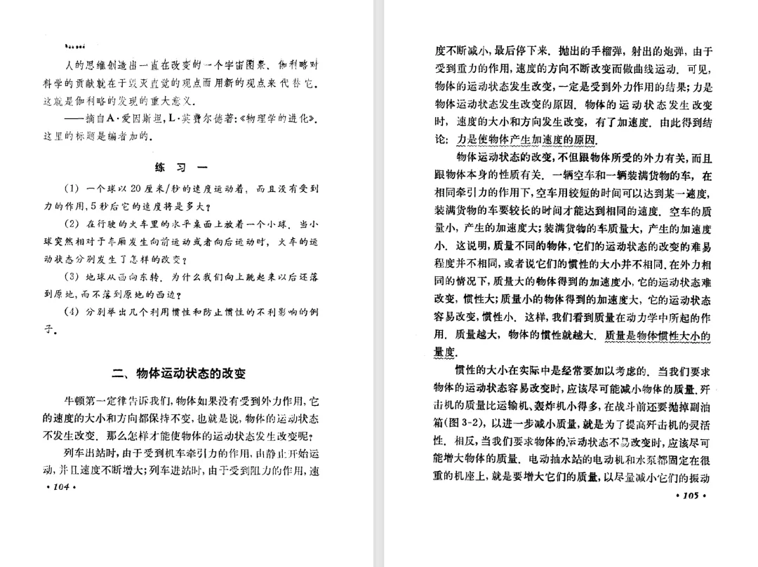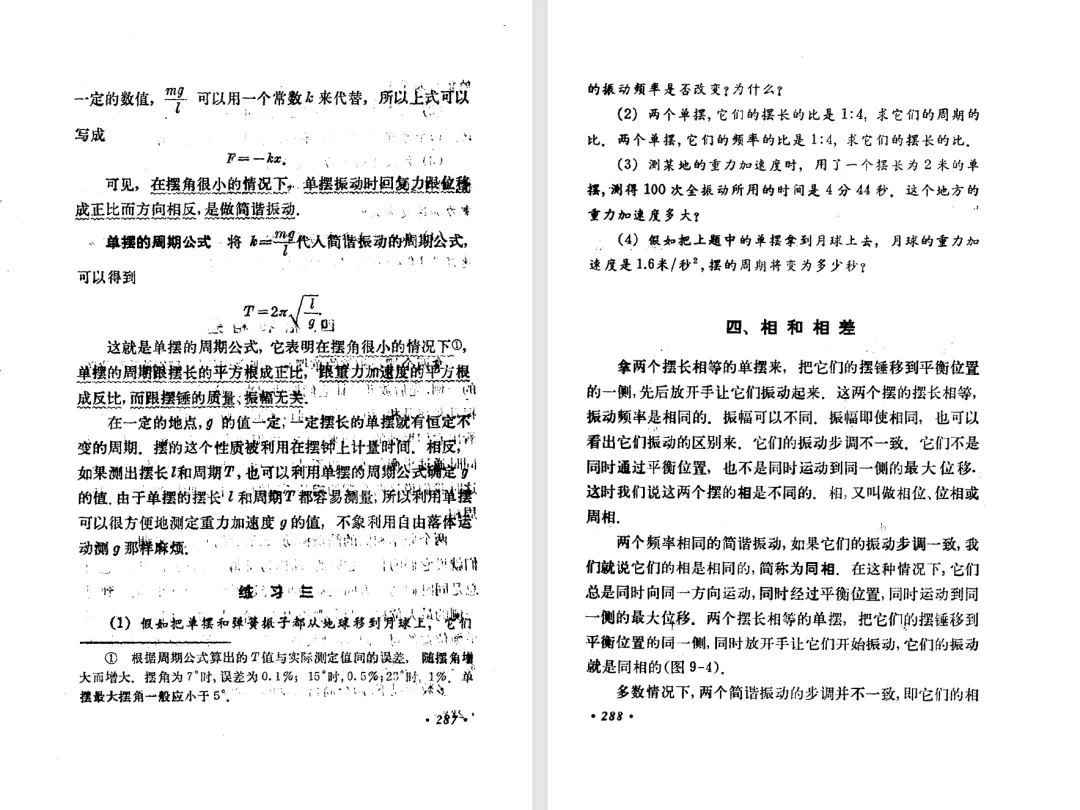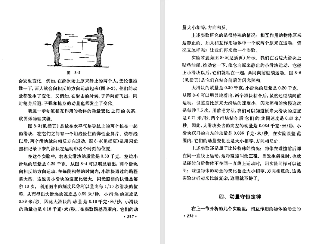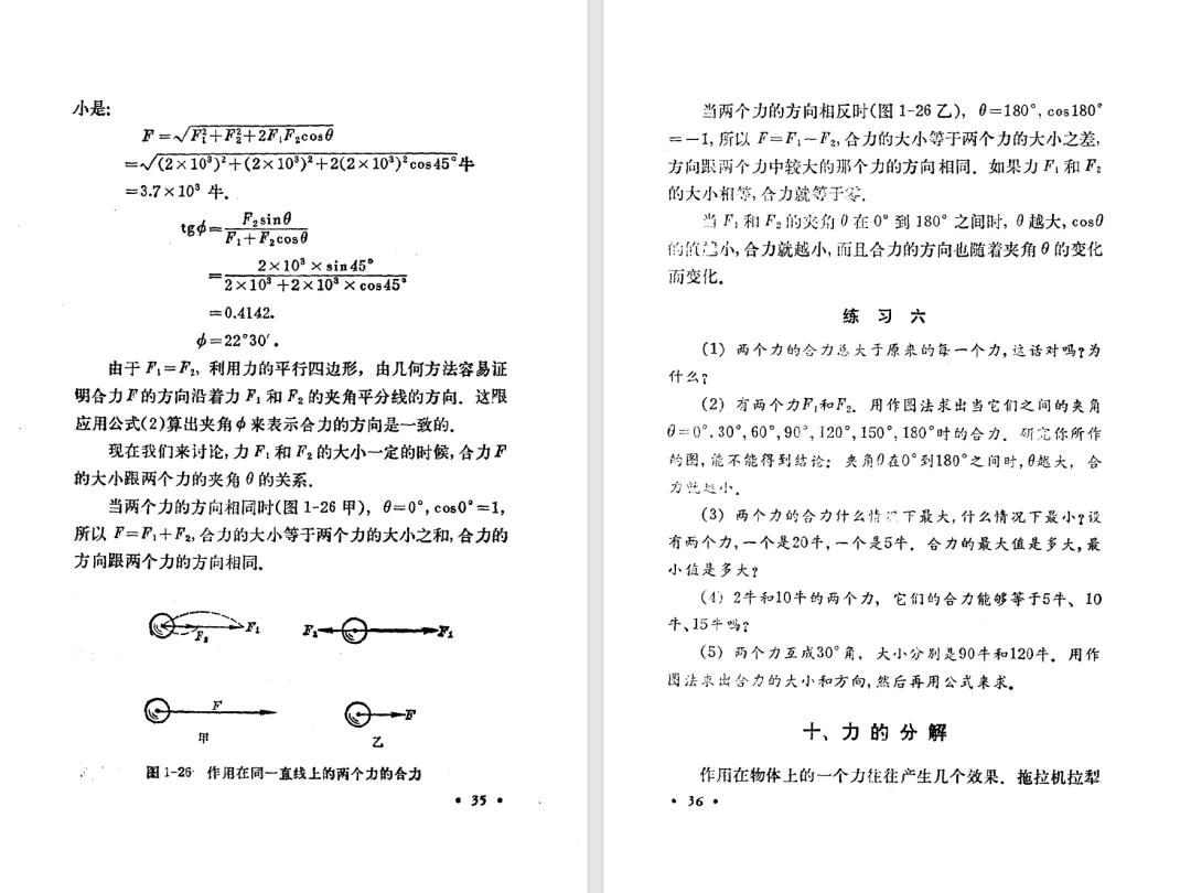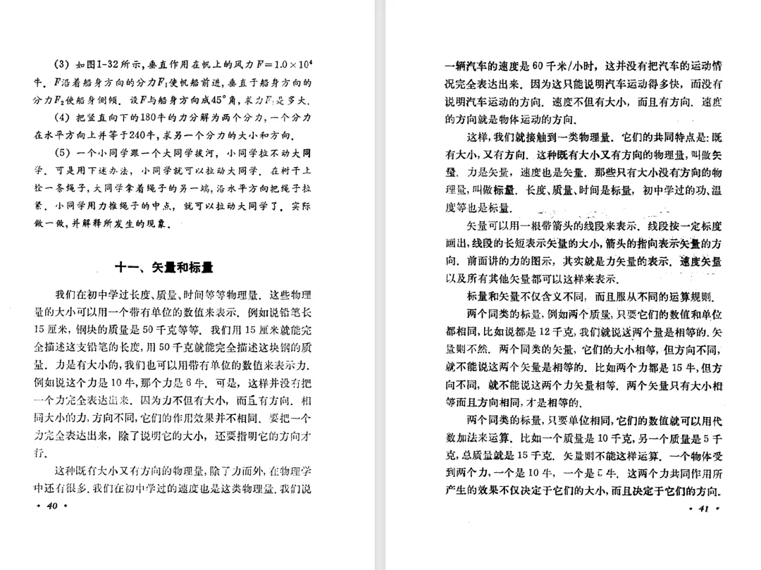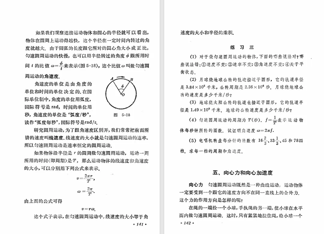 本文介绍1987年版 高级中学课本 物理 上册的详细内容。本书是八十年代 高级中学课本 物理 乙种本 上册 的第二版,在第一版的基础上进行少量修改和重新排版。为了简化称呼,本文仍将1987年版高中物理称为高中物理乙种本。接下来本文将通过对比高中物理甲种本和乙种本的方式对乙种本进行详细介绍。对比乙种本第一章和甲种本对应的内容。如下表所示,左边一列是甲种本,右边一列是乙种本。乙种本将胡克定律合并入弹力一节,将牛顿第三定律放到后面的第四章。乙种本没有专门介绍物体受力分析的小节,弱化了力学的训练,不利于应试。乙种本没有专门介绍标量和矢量、矢量运算的小节。甲种本第六章的第二节和第三节讲的都属于有固定转动轴的物体的平衡,乙种本内容少一些,只有一节。乙种本没有力偶。甲种本的平衡和种类,以及稳度,这两个小节在乙种本是选学内容。不过,甲种本没有乙种本的候风地动仪这个阅读材料。从本书开头的第一章我们就能发现乙种本的难度大幅降低。根据人民教育出版社出版的《新中国中小学教材建设史 1949-2000 研究丛书 物理卷》(简称《物理教材建设史》)的介绍,甲种本和乙种本并用时期,物理高考按甲种本命题,对于使用乙种本的学生不利。胡克定律出现在本节末尾,如下图第14页中间所示,内容很少。下面看甲种本。先看第三节 弹力。这节内容表达的意思和乙种本是相同的,但是内容要详细一些,有的例子更复杂一些。下面是第四节 胡克定律。本节不仅详细介绍了弹力与形变的关系,展示了刻画弹簧形变与弹力关系的胡克定律,还指出了胡克定律的适用范围,比乙种本详细很多。回到乙种本,看第五节 共点力的合成。本节先讲互成角度的共点力的合成,再讲共线的共点力的合成。然后,介绍矢量和标量的概念,指出矢量合成遵循平行四边形法则。下面看甲种本的内容。下图的第八节介绍力的合成,主要是互成角度的共点力的合成。教材不仅给出了力的平行四边形法则,还介绍了三角形法则。后面还有第九节介绍力的合成的计算。本节末尾,如下图第44页后半页所示,教材指出同一直线上的矢量运算也满足平行四边形法则的计算公式。有一点值得注意,甲种本有差不多两页纸介绍矢量和标量,乙种本只有短短一段话。甲种本难度大,篇幅长,乙种本难度低,篇幅短。可是,难度低就一定要对应篇幅短么?我觉得是不合适的。我反而觉得难度低的版本应该将概念解释的更详细,帮助更多的学生理解清楚概念,掌握好知识。下面看乙种本的第八节 有固定转动轴的物体的平衡。本节只有两个小标题,力矩 和 有固定转动轴的物体的平衡。本节开头有很短的两段话介绍转动的物体在什么情况下出于平衡态:静止或匀速转动。本章是第一章,教材还没有介绍运动,也没有介绍匀速圆周运动,所以教材在括号里解释了什么是匀速转动。再看甲种本对应的两个小节。下图是第二节 力对物体的转动作用。这节的第一个小标题介绍转动,转动这个概念在甲种本 第二章 直线运动 第一节 机械运动 中介绍过。段落里面有提到圆周运动的一些概念。所以,甲种本为了解释转动,使用了很多运动学的概念,这也是甲种本要把转动平衡的内容放到曲线运动之后的原因。全日制十年制高中物理,和高中物理乙种本不对转动做详细的解释,所以与物体的平衡有关的内容就和力的内容放同一章了。接下来的第三节专门讲有固定转动轴的物体的平衡,没有划分小标题,正文内容不多,乙种本还给了个例题,甲种本没有。本节末尾还有个阅读材料,候风地动仪,甲种本没有这个阅读材料。下面是甲种本的 平衡的种类 和 稳度 两个小节,比乙种本详细一些。先对比甲种本和乙种本的本章目录。甲种本有一节专门介绍机械运动的概念。乙种本把质点和位移放同一个小节,小结标题还有路程的概念,事实上甲种本也会对比位移和路程两个概念,只是没写到标题里。甲种本有一个阅读材料对比速度和加速度的区别,乙种本没有。甲种本第十节讲匀变速运动规律的应用,乙种本没有。乙种本将运动的合成放在本章末尾,甲种本放在曲线运动这章里。甲种本和乙种本的区别不仅体现在目录里,内容也有很大的差别。如下图第57页所示,乙种本借助速度计帮助读者理解即时速度,然后简单地解释物体在某一时刻或某一位置的速度叫做即时速度。前面的文章已经说过,全日制十年制高中物理对于即时速度的要求还要更高,还用位移-时间图象求即时速度。下面看乙种本第七节 匀变速直线运动的位移。这一节非常暴力,直接使用两个结论——第一,匀变速直线运动的平均速度等于初末速度的平均值;第二,匀变速直线运动的位移等于平均速度乘以时间——得出匀变速直线运动的位移公式。在页尾注解写道只有匀变速运动才能如此求平均速度。后面就是例题。接下来给出初末速度、加速度、位移的关系式,然后又是一道例题。下面看甲种本。如下图所示,甲种本采用极限思想,借助速度-时间图象求解匀变速直线运动的位移公式。接下来给出匀变速直线运动中初末速度、加速度和位移的关系。最后看红框部分,这是乙种本求解匀变速直线运动位移公式的方法。回到乙种本,看第十节 运动的合成。教材简单介绍了位移和速度的合成。如下图所示,甲种本在介绍平抛运动前介绍运动的合