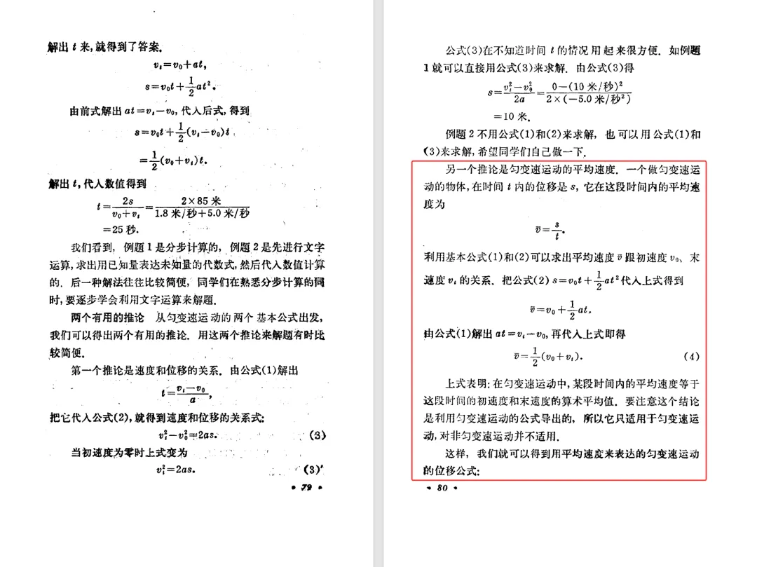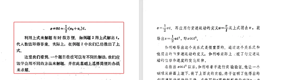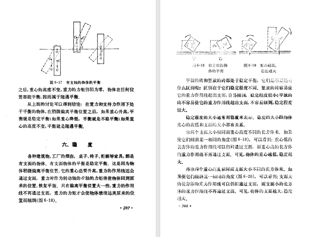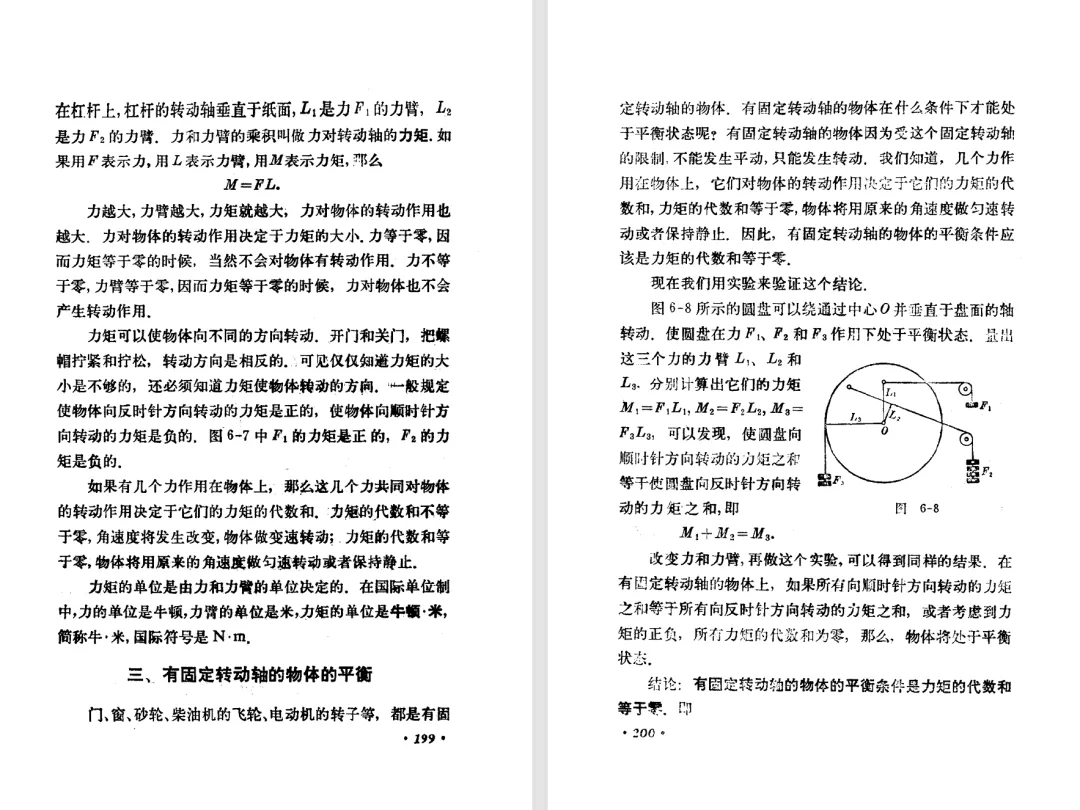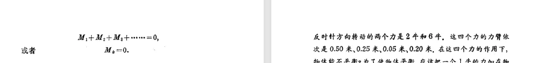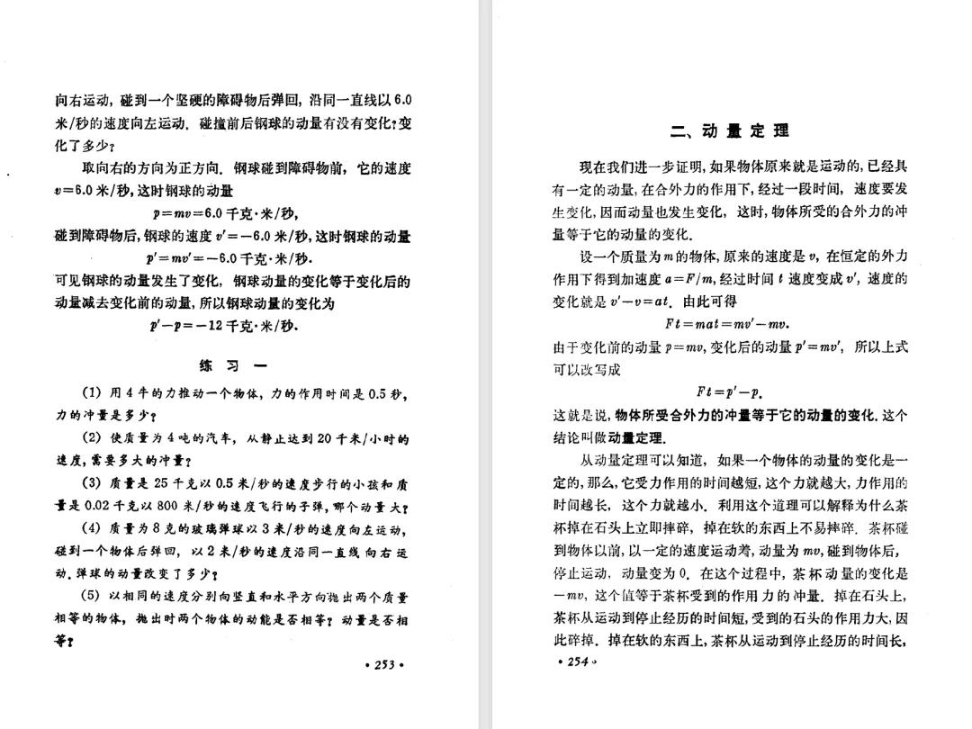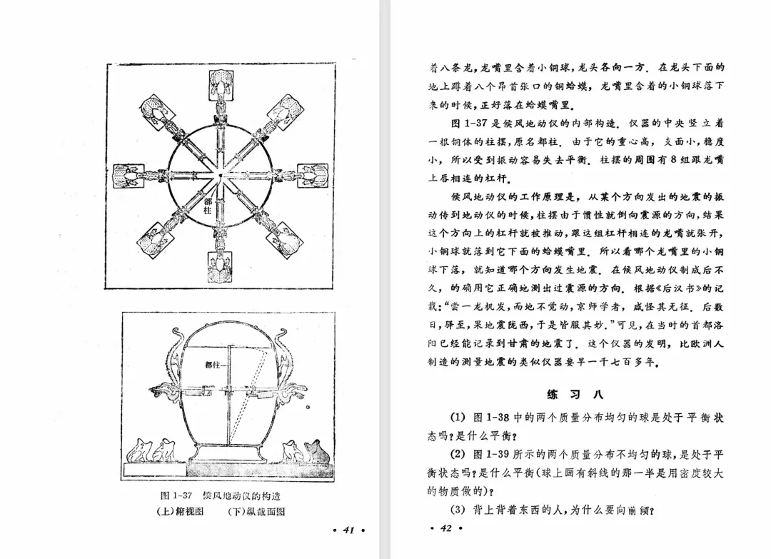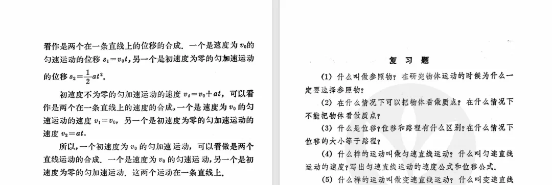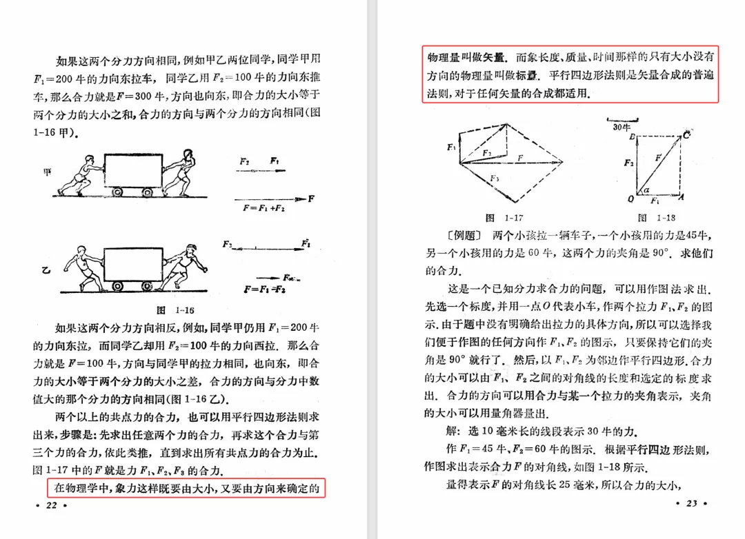 本文介绍1987年版 高级中学课本 物理 上册的详细内容。本书是八十年代 高级中学课本 物理 乙种本 上册 的第二版,在第一版的基础上进行少量修改和重新排版。为了简化称呼,本文仍将1987年版高中物理称为高中物理乙种本。接下来本文将通过对比高中物理甲种本和乙种本的方式对乙种本进行详细介绍。对比乙种本第一章和甲种本对应的内容。如下表所示,左边一列是甲种本,右边一列是乙种本。乙种本将胡克定律合并入弹力一节,将牛顿第三定律放到后面的第四章。乙种本没有专门介绍物体受力分析的小节,弱化了力学的训练,不利于应试。乙种本没有专门介绍标量和矢量、矢量运算的小节。甲种本第六章的第二节和第三节讲的都属于有固定转动轴的物体的平衡,乙种本内容少一些,只有一节。乙种本没有力偶。甲种本的平衡和种类,以及稳度,这两个小节在乙种本是选学内容。不过,甲种本没有乙种本的候风地动仪这个阅读材料。从本书开头的第一章我们就能发现乙种本的难度大幅降低。根据人民教育出版社出版的《新中国中小学教材建设史 1949-2000 研究丛书 物理卷》(简称《物理教材建设史》)的介绍,甲种本和乙种本并用时期,物理高考按甲种本命题,对于使用乙种本的学生不利。胡克定律出现在本节末尾,如下图第14页中间所示,内容很少。下面看甲种本。先看第三节 弹力。这节内容表达的意思和乙种本是相同的,但是内容要详细一些,有的例子更复杂一些。下面是第四节 胡克定律。本节不仅详细介绍了弹力与形变的关系,展示了刻画弹簧形变与弹力关系的胡克定律,还指出了胡克定律的适用范围,比乙种本详细很多。回到乙种本,看第五节 共点力的合成。本节先讲互成角度的共点力的合成,再讲共线的共点力的合成。然后,介绍矢量和标量的概念,指出矢量合成遵循平行四边形法则。下面看甲种本的内容。下图的第八节介绍力的合成,主要是互成角度的共点力的合成。教材不仅给出了力的平行四边形法则,还介绍了三角形法则。后面还有第九节介绍力的合成的计算。本节末尾,如下图第44页后半页所示,教材指出同一直线上的矢量运算也满足平行四边形法则的计算公式。有一点值得注意,甲种本有差不多两页纸介绍矢量和标量,乙种本只有短短一段话。甲种本难度大,篇幅长,乙种本难度低,篇幅短。可是,难度低就一定要对应篇幅短么?我觉得是不合适的。我反而觉得难度低的版本应该将概念解释的更详细,帮助更多的学生理解清楚概念,掌握好知识。下面看乙种本的第八节 有固定转动轴的物体的平衡。本节只有两个小标题,力矩 和 有固定转动轴的物体的平衡。本节开头有很短的两段话介绍转动的物体在什么情况下出于平衡态:静止或匀速转动。本章是第一章,教材还没有介绍运动,也没有介绍匀速圆周运动,所以教材在括号里解释了什么是匀速转动。再看甲种本对应的两个小节。下图是第二节 力对物体的转动作用。这节的第一个小标题介绍转动,转动这个概念在甲种本 第二章 直线运动 第一节 机械运动 中介绍过。段落里面有提到圆周运动的一些概念。所以,甲种本为了解释转动,使用了很多运动学的概念,这也是甲种本要把转动平衡的内容放到曲线运动之后的原因。全日制十年制高中物理,和高中物理乙种本不对转动做详细的解释,所以与物体的平衡有关的内容就和力的内容放同一章了。接下来的第三节专门讲有固定转动轴的物体的平衡,没有划分小标题,正文内容不多,乙种本还给了个例题,甲种本没有。本节末尾还有个阅读材料,候风地动仪,甲种本没有这个阅读材料。下面是甲种本的 平衡的种类 和 稳度 两个小节,比乙种本详细一些。先对比甲种本和乙种本的本章目录。甲种本有一节专门介绍机械运动的概念。乙种本把质点和位移放同一个小节,小结标题还有路程的概念,事实上甲种本也会对比位移和路程两个概念,只是没写到标题里。甲种本有一个阅读材料对比速度和加速度的区别,乙种本没有。甲种本第十节讲匀变速运动规律的应用,乙种本没有。乙种本将运动的合成放在本章末尾,甲种本放在曲线运动这章里。甲种本和乙种本的区别不仅体现在目录里,内容也有很大的差别。如下图第57页所示,乙种本借助速度计帮助读者理解即时速度,然后简单地解释物体在某一时刻或某一位置的速度叫做即时速度。前面的文章已经说过,全日制十年制高中物理对于即时速度的要求还要更高,还用位移-时间图象求即时速度。下面看乙种本第七节 匀变速直线运动的位移。这一节非常暴力,直接使用两个结论——第一,匀变速直线运动的平均速度等于初末速度的平均值;第二,匀变速直线运动的位移等于平均速度乘以时间——得出匀变速直线运动的位移公式。在页尾注解写道只有匀变速运动才能如此求平均速度。后面就是例题。接下来给出初末速度、加速度、位移的关系式,然后又是一道例题。下面看甲种本。如下图所示,甲种本采用极限思想,借助速度-时间图象求解匀变速直线运动的位移公式。接下来给出匀变速直线运动中初末速度、加速度和位移的关系。最后看红框部分,这是乙种本求解匀变速直线运动位移公式的方法。回到乙种本,看第十节 运动的合成。教材简单介绍了位移和速度的合成。如下图所示,甲种本在介绍平抛运动前介绍运动的合