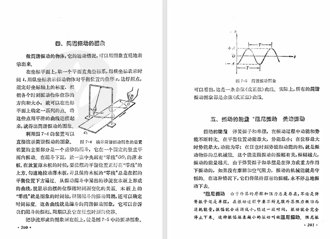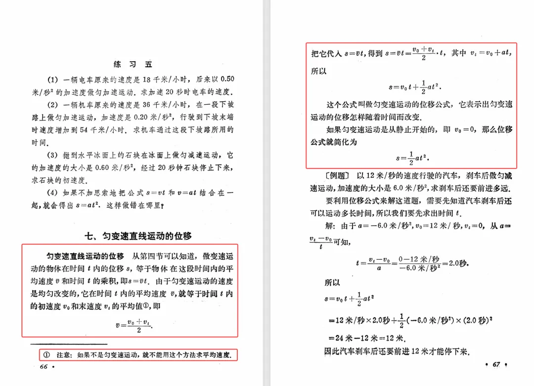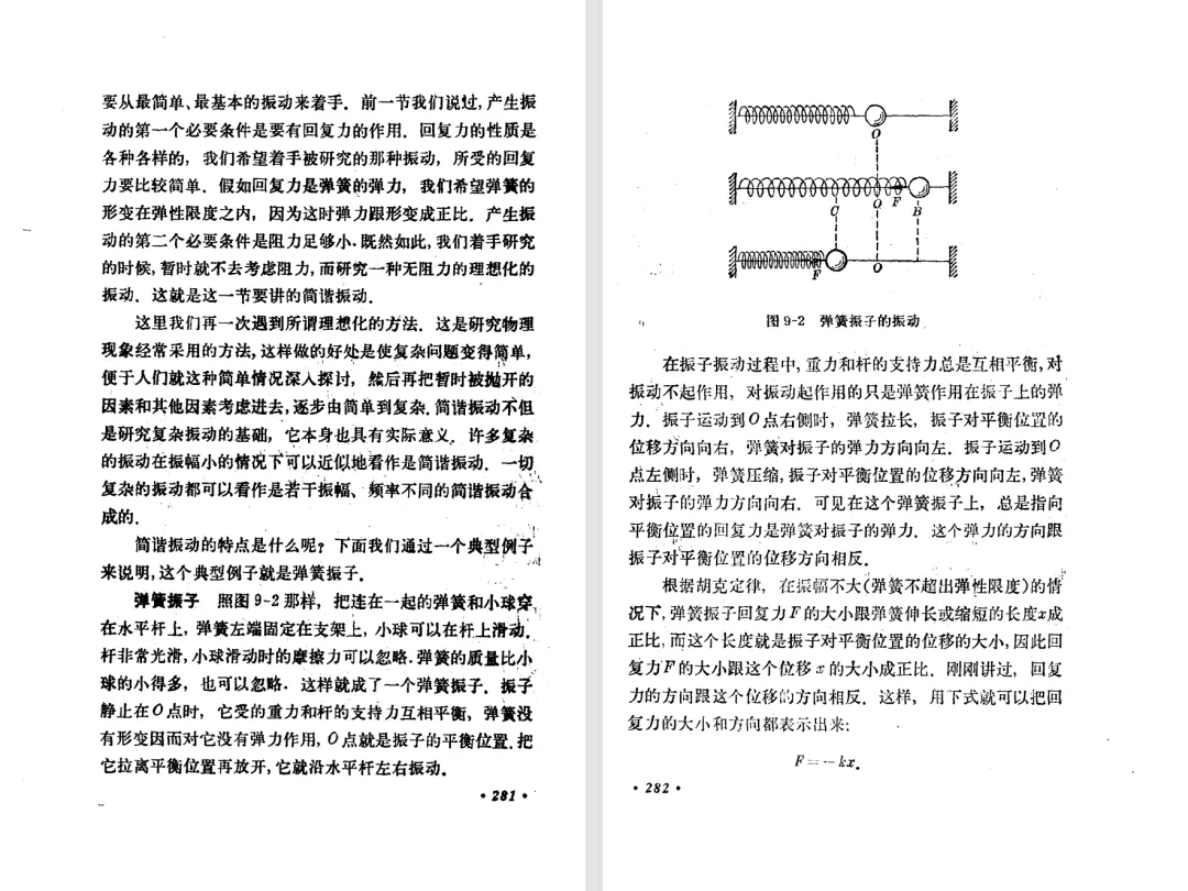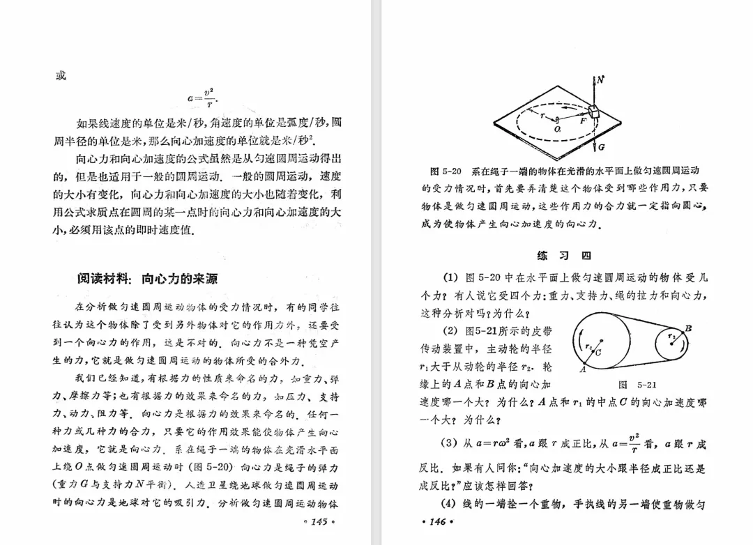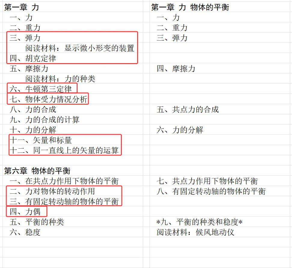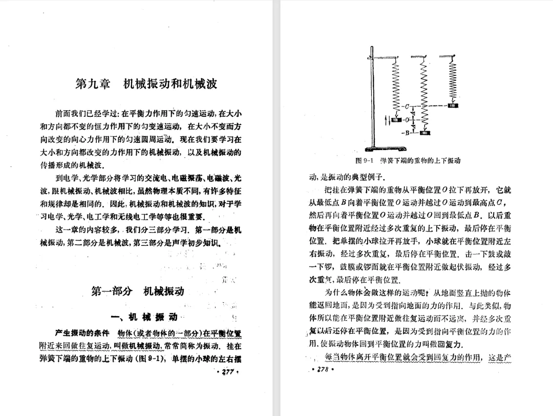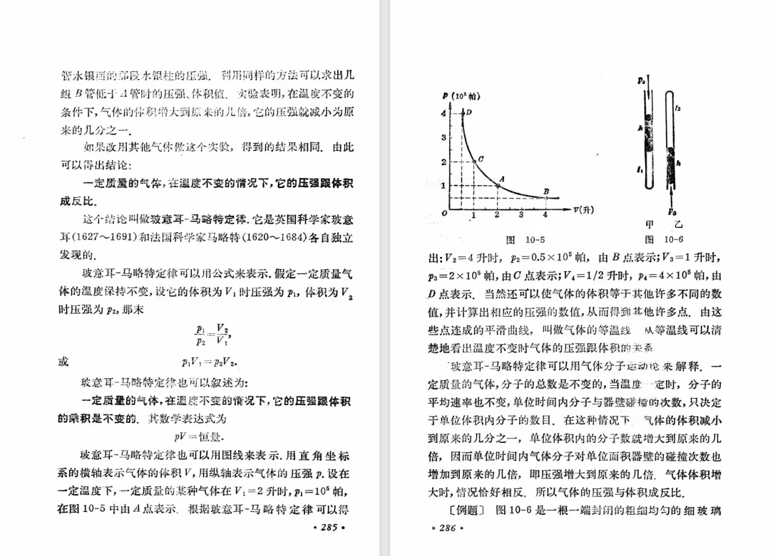 本文介绍1987年版 高级中学课本 物理 上册的详细内容。本书是八十年代 高级中学课本 物理 乙种本 上册 的第二版,在第一版的基础上进行少量修改和重新排版。为了简化称呼,本文仍将1987年版高中物理称为高中物理乙种本。接下来本文将通过对比高中物理甲种本和乙种本的方式对乙种本进行详细介绍。对比乙种本第一章和甲种本对应的内容。如下表所示,左边一列是甲种本,右边一列是乙种本。乙种本将胡克定律合并入弹力一节,将牛顿第三定律放到后面的第四章。乙种本没有专门介绍物体受力分析的小节,弱化了力学的训练,不利于应试。乙种本没有专门介绍标量和矢量、矢量运算的小节。甲种本第六章的第二节和第三节讲的都属于有固定转动轴的物体的平衡,乙种本内容少一些,只有一节。乙种本没有力偶。甲种本的平衡和种类,以及稳度,这两个小节在乙种本是选学内容。不过,甲种本没有乙种本的候风地动仪这个阅读材料。从本书开头的第一章我们就能发现乙种本的难度大幅降低。根据人民教育出版社出版的《新中国中小学教材建设史 1949-2000 研究丛书 物理卷》(简称《物理教材建设史》)的介绍,甲种本和乙种本并用时期,物理高考按甲种本命题,对于使用乙种本的学生不利。胡克定律出现在本节末尾,如下图第14页中间所示,内容很少。下面看甲种本。先看第三节 弹力。这节内容表达的意思和乙种本是相同的,但是内容要详细一些,有的例子更复杂一些。下面是第四节 胡克定律。本节不仅详细介绍了弹力与形变的关系,展示了刻画弹簧形变与弹力关系的胡克定律,还指出了胡克定律的适用范围,比乙种本详细很多。回到乙种本,看第五节 共点力的合成。本节先讲互成角度的共点力的合成,再讲共线的共点力的合成。然后,介绍矢量和标量的概念,指出矢量合成遵循平行四边形法则。下面看甲种本的内容。下图的第八节介绍力的合成,主要是互成角度的共点力的合成。教材不仅给出了力的平行四边形法则,还介绍了三角形法则。后面还有第九节介绍力的合成的计算。本节末尾,如下图第44页后半页所示,教材指出同一直线上的矢量运算也满足平行四边形法则的计算公式。有一点值得注意,甲种本有差不多两页纸介绍矢量和标量,乙种本只有短短一段话。甲种本难度大,篇幅长,乙种本难度低,篇幅短。可是,难度低就一定要对应篇幅短么?我觉得是不合适的。我反而觉得难度低的版本应该将概念解释的更详细,帮助更多的学生理解清楚概念,掌握好知识。下面看乙种本的第八节 有固定转动轴的物体的平衡。本节只有两个小标题,力矩 和 有固定转动轴的物体的平衡。本节开头有很短的两段话介绍转动的物体在什么情况下出于平衡态:静止或匀速转动。本章是第一章,教材还没有介绍运动,也没有介绍匀速圆周运动,所以教材在括号里解释了什么是匀速转动。再看甲种本对应的两个小节。下图是第二节 力对物体的转动作用。这节的第一个小标题介绍转动,转动这个概念在甲种本 第二章 直线运动 第一节 机械运动 中介绍过。段落里面有提到圆周运动的一些概念。所以,甲种本为了解释转动,使用了很多运动学的概念,这也是甲种本要把转动平衡的内容放到曲线运动之后的原因。全日制十年制高中物理,和高中物理乙种本不对转动做详细的解释,所以与物体的平衡有关的内容就和力的内容放同一章了。接下来的第三节专门讲有固定转动轴的物体的平衡,没有划分小标题,正文内容不多,乙种本还给了个例题,甲种本没有。本节末尾还有个阅读材料,候风地动仪,甲种本没有这个阅读材料。下面是甲种本的 平衡的种类 和 稳度 两个小节,比乙种本详细一些。先对比甲种本和乙种本的本章目录。甲种本有一节专门介绍机械运动的概念。乙种本把质点和位移放同一个小节,小结标题还有路程的概念,事实上甲种本也会对比位移和路程两个概念,只是没写到标题里。甲种本有一个阅读材料对比速度和加速度的区别,乙种本没有。甲种本第十节讲匀变速运动规律的应用,乙种本没有。乙种本将运动的合成放在本章末尾,甲种本放在曲线运动这章里。甲种本和乙种本的区别不仅体现在目录里,内容也有很大的差别。如下图第57页所示,乙种本借助速度计帮助读者理解即时速度,然后简单地解释物体在某一时刻或某一位置的速度叫做即时速度。前面的文章已经说过,全日制十年制高中物理对于即时速度的要求还要更高,还用位移-时间图象求即时速度。下面看乙种本第七节 匀变速直线运动的位移。这一节非常暴力,直接使用两个结论——第一,匀变速直线运动的平均速度等于初末速度的平均值;第二,匀变速直线运动的位移等于平均速度乘以时间——得出匀变速直线运动的位移公式。在页尾注解写道只有匀变速运动才能如此求平均速度。后面就是例题。接下来给出初末速度、加速度、位移的关系式,然后又是一道例题。下面看甲种本。如下图所示,甲种本采用极限思想,借助速度-时间图象求解匀变速直线运动的位移公式。接下来给出匀变速直线运动中初末速度、加速度和位移的关系。最后看红框部分,这是乙种本求解匀变速直线运动位移公式的方法。回到乙种本,看第十节 运动的合成。教材简单介绍了位移和速度的合成。如下图所示,甲种本在介绍平抛运动前介绍运动的合