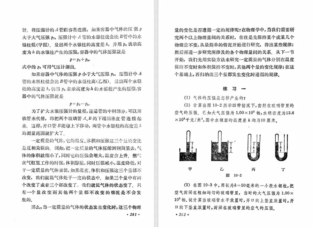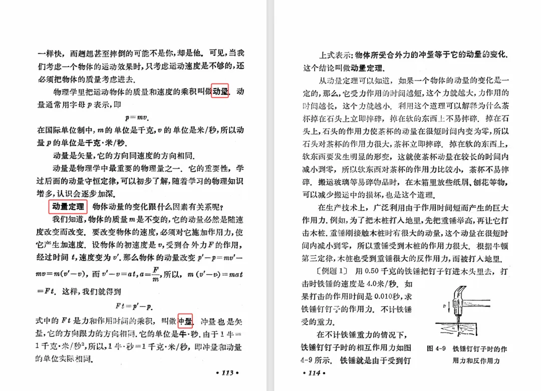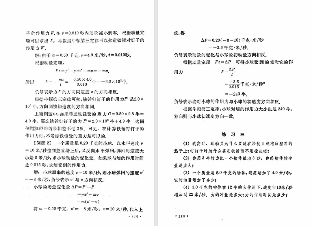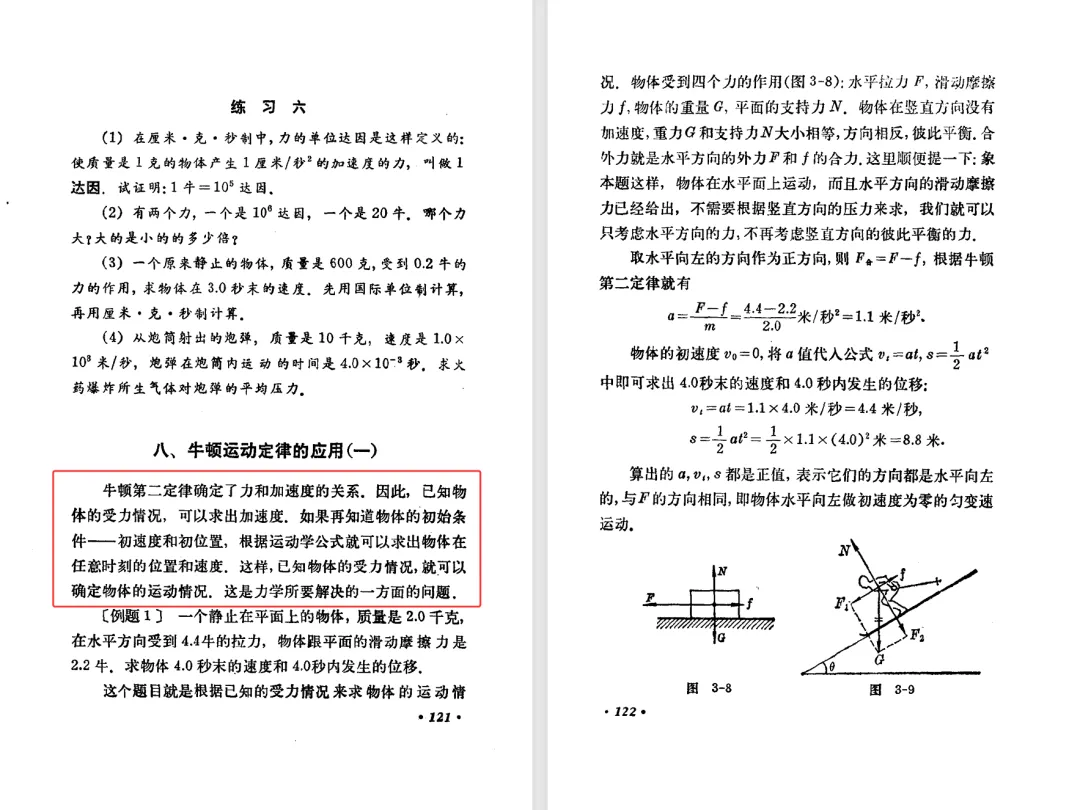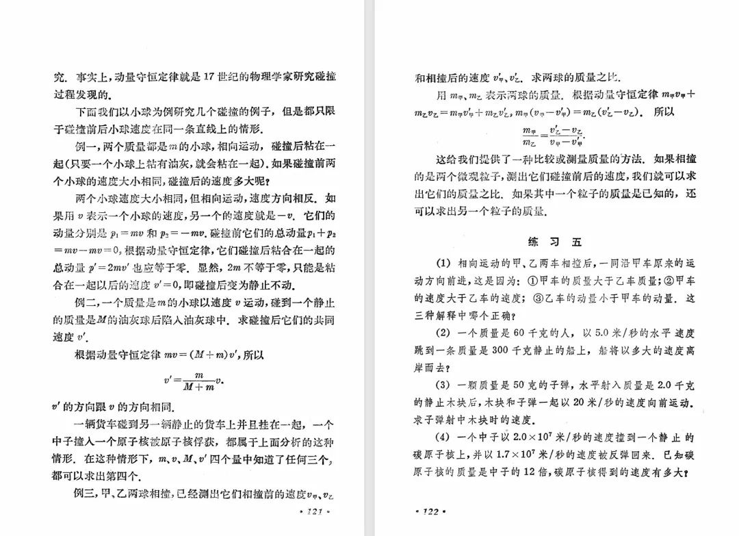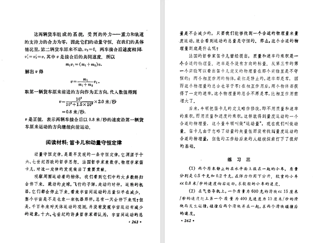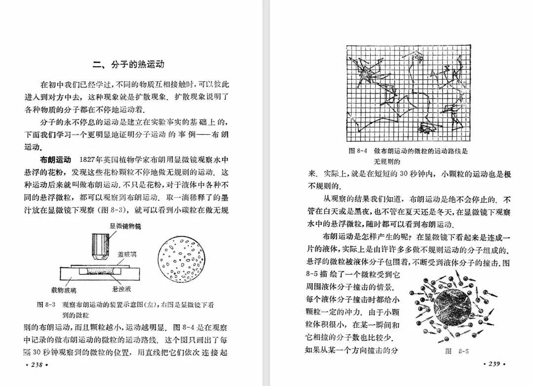本文介绍1987年版 高级中学课本 物理 上册的详细内容。本书是八十年代 高级中学课本 物理 乙种本 上册 的第二版,在第一版的基础上进行少量修改和重新排版。为了简化称呼,本文仍将1987年版高中物理称为高中物理乙种本。接下来本文将通过对比高中物理甲种本和乙种本的方式对乙种本进行详细介绍。对比乙种本第一章和甲种本对应的内容。如下表所示,左边一列是甲种本,右边一列是乙种本。乙种本将胡克定律合并入弹力一节,将牛顿第三定律放到后面的第四章。乙种本没有专门介绍物体受力分析的小节,弱化了力学的训练,不利于应试。乙种本没有专门介绍标量和矢量、矢量运算的小节。甲种本第六章的第二节和第三节讲的都属于有固定转动轴的物体的平衡,乙种本内容少一些,只有一节。乙种本没有力偶。甲种本的平衡和种类,以及稳度,这两个小节在乙种本是选学内容。不过,甲种本没有乙种本的候风地动仪这个阅读材料。从本书开头的第一章我们就能发现乙种本的难度大幅降低。根据人民教育出版社出版的《新中国中小学教材建设史 1949-2000 研究丛书 物理卷》(简称《物理教材建设史》)的介绍,甲种本和乙种本并用时期,物理高考按甲种本命题,对于使用乙种本的学生不利。胡克定律出现在本节末尾,如下图第14页中间所示,内容很少。下面看甲种本。先看第三节 弹力。这节内容表达的意思和乙种本是相同的,但是内容要详细一些,有的例子更复杂一些。下面是第四节 胡克定律。本节不仅详细介绍了弹力与形变的关系,展示了刻画弹簧形变与弹力关系的胡克定律,还指出了胡克定律的适用范围,比乙种本详细很多。回到乙种本,看第五节 共点力的合成。本节先讲互成角度的共点力的合成,再讲共线的共点力的合成。然后,介绍矢量和标量的概念,指出矢量合成遵循平行四边形法则。下面看甲种本的内容。下图的第八节介绍力的合成,主要是互成角度的共点力的合成。教材不仅给出了力的平行四边形法则,还介绍了三角形法则。后面还有第九节介绍力的合成的计算。本节末尾,如下图第44页后半页所示,教材指出同一直线上的矢量运算也满足平行四边形法则的计算公式。有一点值得注意,甲种本有差不多两页纸介绍矢量和标量,乙种本只有短短一段话。甲种本难度大,篇幅长,乙种本难度低,篇幅短。可是,难度低就一定要对应篇幅短么?我觉得是不合适的。我反而觉得难度低的版本应该将概念解释的更详细,帮助更多的学生理解清楚概念,掌握好知识。下面看乙种本的第八节 有固定转动轴的物体的平衡。本节只有两个小标题,力矩 和 有固定转动轴的物体的平衡。本节开头有很短的两段话介绍转动的物体在什么情况下出于平衡态:静止或匀速转动。本章是第一章,教材还没有介绍运动,也没有介绍匀速圆周运动,所以教材在括号里解释了什么是匀速转动。再看甲种本对应的两个小节。下图是第二节 力对物体的转动作用。这节的第一个小标题介绍转动,转动这个概念在甲种本 第二章 直线运动 第一节 机械运动 中介绍过。段落里面有提到圆周运动的一些概念。所以,甲种本为了解释转动,使用了很多运动学的概念,这也是甲种本要把转动平衡的内容放到曲线运动之后的原因。全日制十年制高中物理,和高中物理乙种本不对转动做详细的解释,所以与物体的平衡有关的内容就和力的内容放同一章了。接下来的第三节专门讲有固定转动轴的物体的平衡,没有划分小标题,正文内容不多,乙种本还给了个例题,甲种本没有。本节末尾还有个阅读材料,候风地动仪,甲种本没有这个阅读材料。下面是甲种本的 平衡的种类 和 稳度 两个小节,比乙种本详细一些。先对比甲种本和乙种本的本章目录。甲种本有一节专门介绍机械运动的概念。乙种本把质点和位移放同一个小节,小结标题还有路程的概念,事实上甲种本也会对比位移和路程两个概念,只是没写到标题里。甲种本有一个阅读材料对比速度和加速度的区别,乙种本没有。甲种本第十节讲匀变速运动规律的应用,乙种本没有。乙种本将运动的合成放在本章末尾,甲种本放在曲线运动这章里。甲种本和乙种本的区别不仅体现在目录里,内容也有很大的差别。如下图第57页所示,乙种本借助速度计帮助读者理解即时速度,然后简单地解释物体在某一时刻或某一位置的速度叫做即时速度。前面的文章已经说过,全日制十年制高中物理对于即时速度的要求还要更高,还用位移-时间图象求即时速度。下面看乙种本第七节 匀变速直线运动的位移。这一节非常暴力,直接使用两个结论——第一,匀变速直线运动的平均速度等于初末速度的平均值;第二,匀变速直线运动的位移等于平均速度乘以时间——得出匀变速直线运动的位移公式。在页尾注解写道只有匀变速运动才能如此求平均速度。后面就是例题。接下来给出初末速度、加速度、位移的关系式,然后又是一道例题。下面看甲种本。如下图所示,甲种本采用极限思想,借助速度-时间图象求解匀变速直线运动的位移公式。接下来给出匀变速直线运动中初末速度、加速度和位移的关系。最后看红框部分,这是乙种本求解匀变速直线运动位移公式的方法。回到乙种本,看第十节 运动的合成。教材简单介绍了位移和速度的合成。如下图所示,甲种本在介绍平抛运动前介绍运动的合