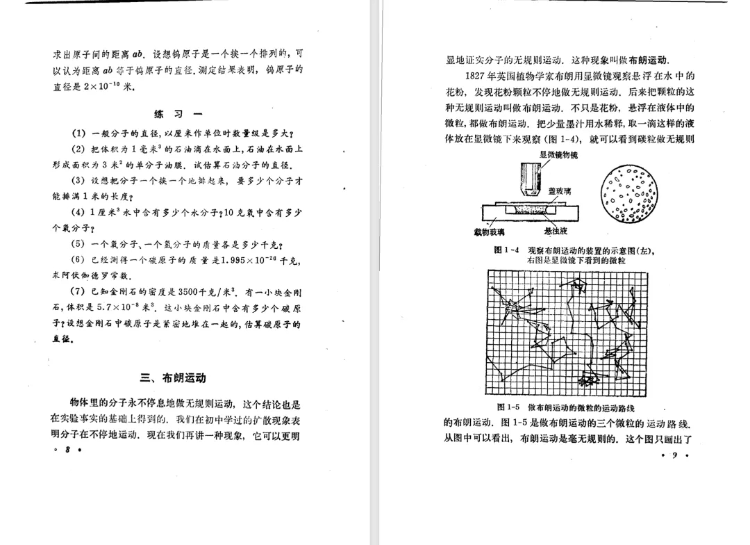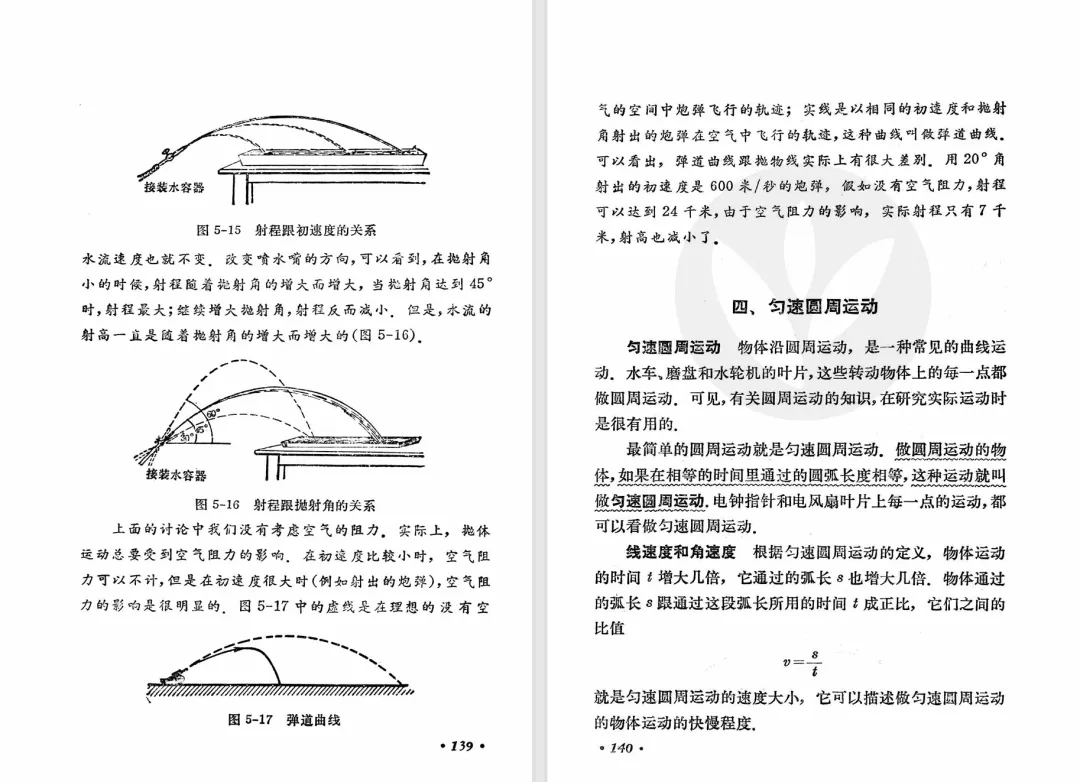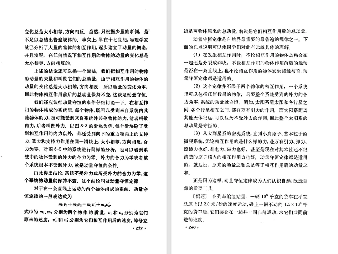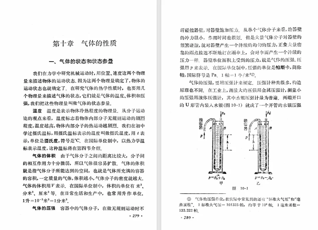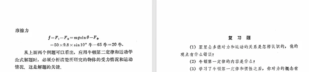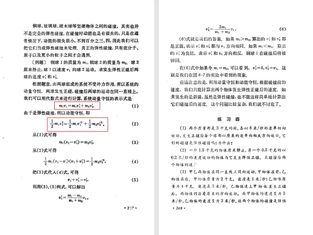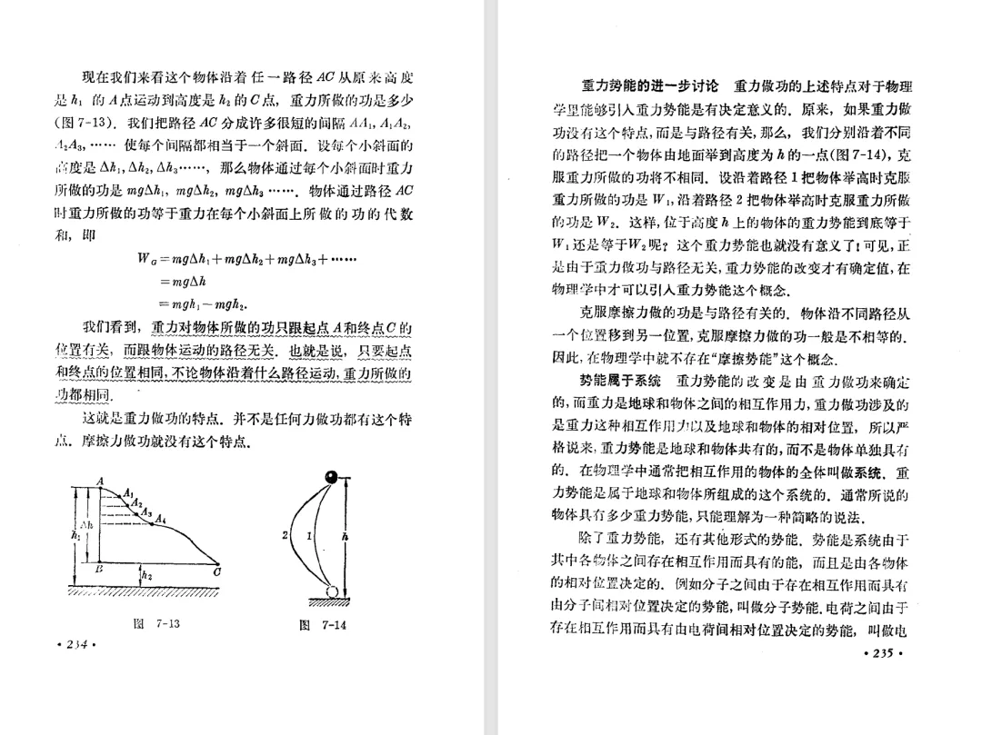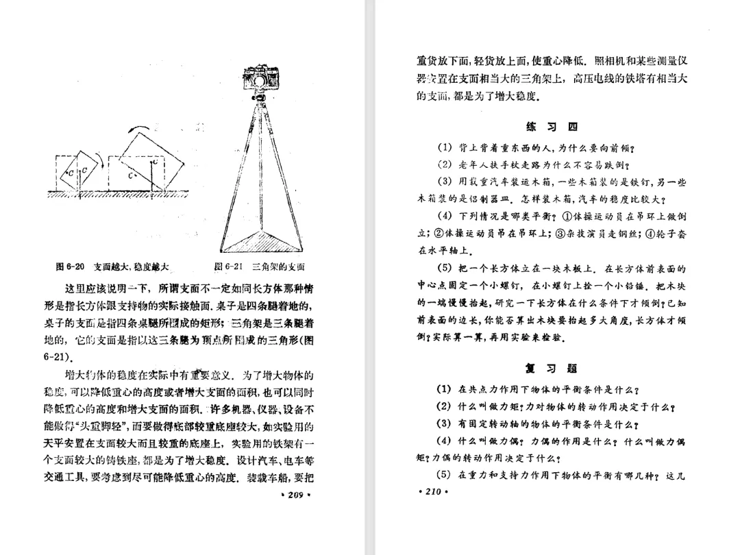 本文介绍1987年版 高级中学课本 物理 上册的详细内容。本书是八十年代 高级中学课本 物理 乙种本 上册 的第二版,在第一版的基础上进行少量修改和重新排版。为了简化称呼,本文仍将1987年版高中物理称为高中物理乙种本。接下来本文将通过对比高中物理甲种本和乙种本的方式对乙种本进行详细介绍。对比乙种本第一章和甲种本对应的内容。如下表所示,左边一列是甲种本,右边一列是乙种本。乙种本将胡克定律合并入弹力一节,将牛顿第三定律放到后面的第四章。乙种本没有专门介绍物体受力分析的小节,弱化了力学的训练,不利于应试。乙种本没有专门介绍标量和矢量、矢量运算的小节。甲种本第六章的第二节和第三节讲的都属于有固定转动轴的物体的平衡,乙种本内容少一些,只有一节。乙种本没有力偶。甲种本的平衡和种类,以及稳度,这两个小节在乙种本是选学内容。不过,甲种本没有乙种本的候风地动仪这个阅读材料。从本书开头的第一章我们就能发现乙种本的难度大幅降低。根据人民教育出版社出版的《新中国中小学教材建设史 1949-2000 研究丛书 物理卷》(简称《物理教材建设史》)的介绍,甲种本和乙种本并用时期,物理高考按甲种本命题,对于使用乙种本的学生不利。胡克定律出现在本节末尾,如下图第14页中间所示,内容很少。下面看甲种本。先看第三节 弹力。这节内容表达的意思和乙种本是相同的,但是内容要详细一些,有的例子更复杂一些。下面是第四节 胡克定律。本节不仅详细介绍了弹力与形变的关系,展示了刻画弹簧形变与弹力关系的胡克定律,还指出了胡克定律的适用范围,比乙种本详细很多。回到乙种本,看第五节 共点力的合成。本节先讲互成角度的共点力的合成,再讲共线的共点力的合成。然后,介绍矢量和标量的概念,指出矢量合成遵循平行四边形法则。下面看甲种本的内容。下图的第八节介绍力的合成,主要是互成角度的共点力的合成。教材不仅给出了力的平行四边形法则,还介绍了三角形法则。后面还有第九节介绍力的合成的计算。本节末尾,如下图第44页后半页所示,教材指出同一直线上的矢量运算也满足平行四边形法则的计算公式。有一点值得注意,甲种本有差不多两页纸介绍矢量和标量,乙种本只有短短一段话。甲种本难度大,篇幅长,乙种本难度低,篇幅短。可是,难度低就一定要对应篇幅短么?我觉得是不合适的。我反而觉得难度低的版本应该将概念解释的更详细,帮助更多的学生理解清楚概念,掌握好知识。下面看乙种本的第八节 有固定转动轴的物体的平衡。本节只有两个小标题,力矩 和 有固定转动轴的物体的平衡。本节开头有很短的两段话介绍转动的物体在什么情况下出于平衡态:静止或匀速转动。本章是第一章,教材还没有介绍运动,也没有介绍匀速圆周运动,所以教材在括号里解释了什么是匀速转动。再看甲种本对应的两个小节。下图是第二节 力对物体的转动作用。这节的第一个小标题介绍转动,转动这个概念在甲种本 第二章 直线运动 第一节 机械运动 中介绍过。段落里面有提到圆周运动的一些概念。所以,甲种本为了解释转动,使用了很多运动学的概念,这也是甲种本要把转动平衡的内容放到曲线运动之后的原因。全日制十年制高中物理,和高中物理乙种本不对转动做详细的解释,所以与物体的平衡有关的内容就和力的内容放同一章了。接下来的第三节专门讲有固定转动轴的物体的平衡,没有划分小标题,正文内容不多,乙种本还给了个例题,甲种本没有。本节末尾还有个阅读材料,候风地动仪,甲种本没有这个阅读材料。下面是甲种本的 平衡的种类 和 稳度 两个小节,比乙种本详细一些。先对比甲种本和乙种本的本章目录。甲种本有一节专门介绍机械运动的概念。乙种本把质点和位移放同一个小节,小结标题还有路程的概念,事实上甲种本也会对比位移和路程两个概念,只是没写到标题里。甲种本有一个阅读材料对比速度和加速度的区别,乙种本没有。甲种本第十节讲匀变速运动规律的应用,乙种本没有。乙种本将运动的合成放在本章末尾,甲种本放在曲线运动这章里。甲种本和乙种本的区别不仅体现在目录里,内容也有很大的差别。如下图第57页所示,乙种本借助速度计帮助读者理解即时速度,然后简单地解释物体在某一时刻或某一位置的速度叫做即时速度。前面的文章已经说过,全日制十年制高中物理对于即时速度的要求还要更高,还用位移-时间图象求即时速度。下面看乙种本第七节 匀变速直线运动的位移。这一节非常暴力,直接使用两个结论——第一,匀变速直线运动的平均速度等于初末速度的平均值;第二,匀变速直线运动的位移等于平均速度乘以时间——得出匀变速直线运动的位移公式。在页尾注解写道只有匀变速运动才能如此求平均速度。后面就是例题。接下来给出初末速度、加速度、位移的关系式,然后又是一道例题。下面看甲种本。如下图所示,甲种本采用极限思想,借助速度-时间图象求解匀变速直线运动的位移公式。接下来给出匀变速直线运动中初末速度、加速度和位移的关系。最后看红框部分,这是乙种本求解匀变速直线运动位移公式的方法。回到乙种本,看第十节 运动的合成。教材简单介绍了位移和速度的合成。如下图所示,甲种本在介绍平抛运动前介绍运动的合