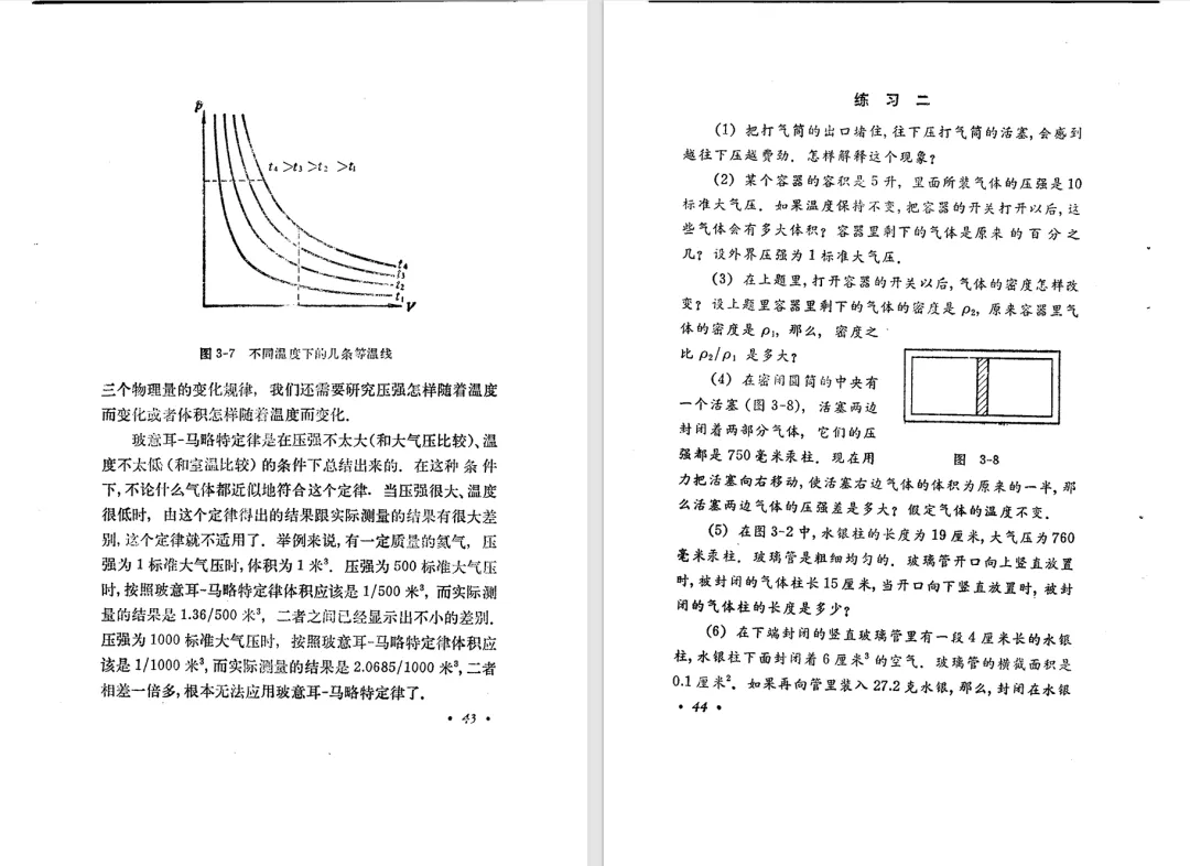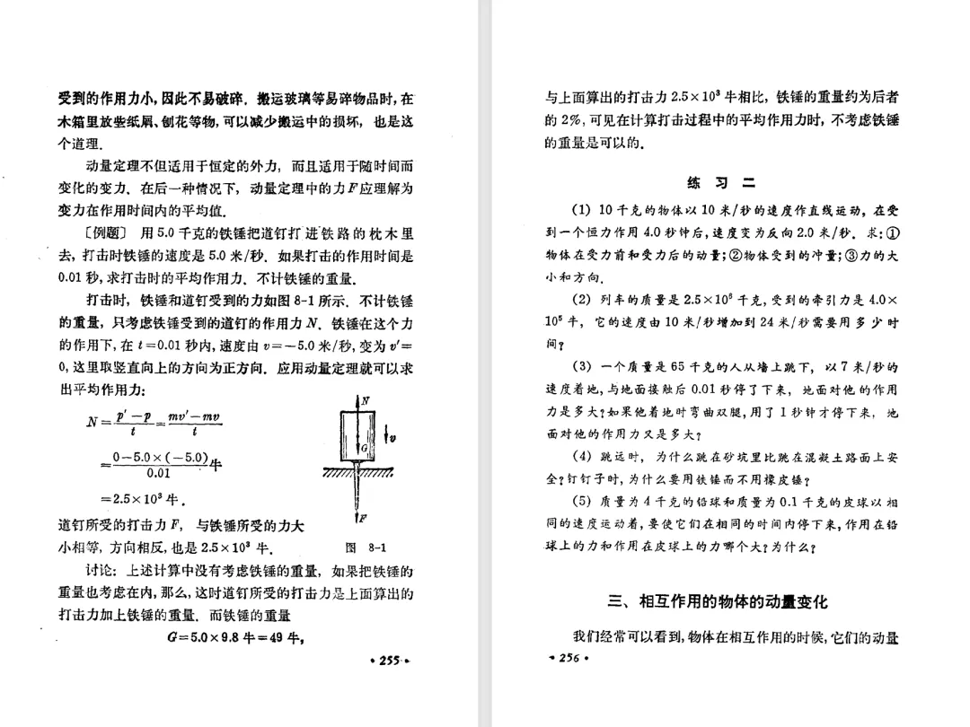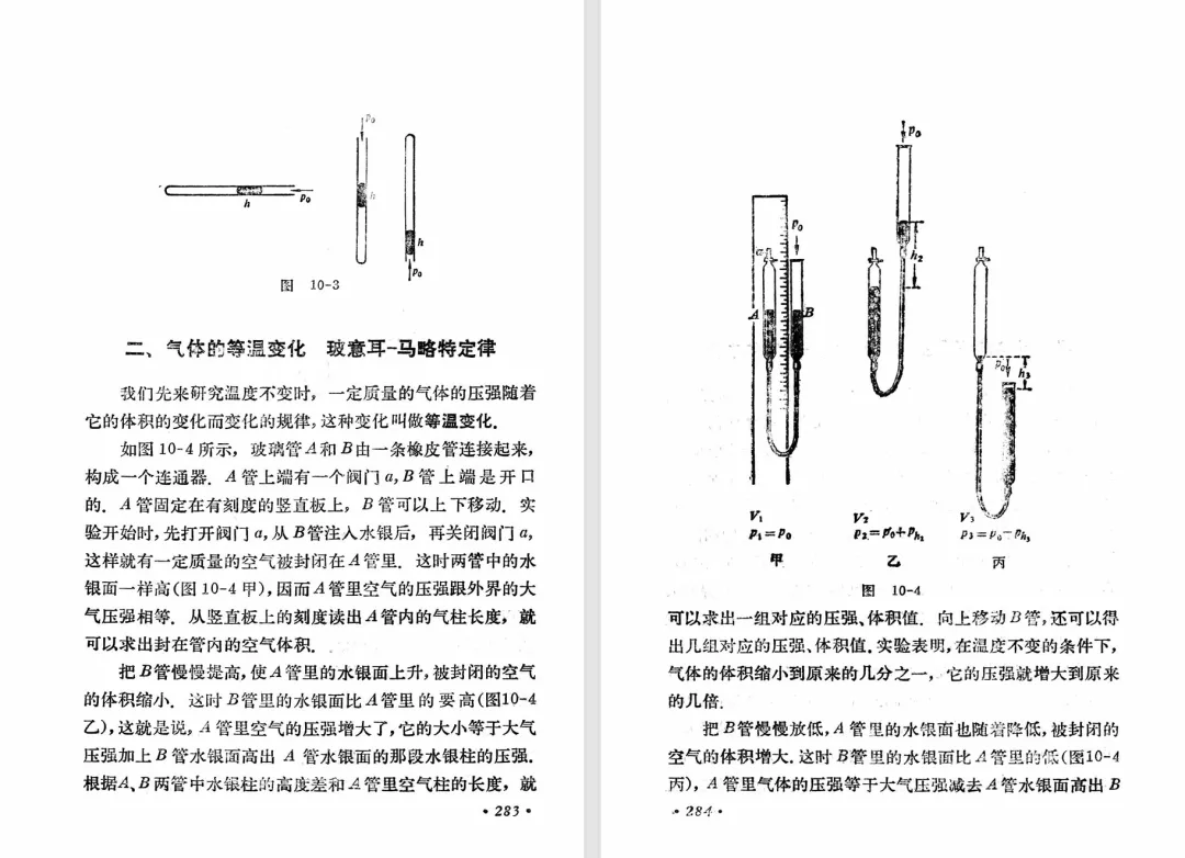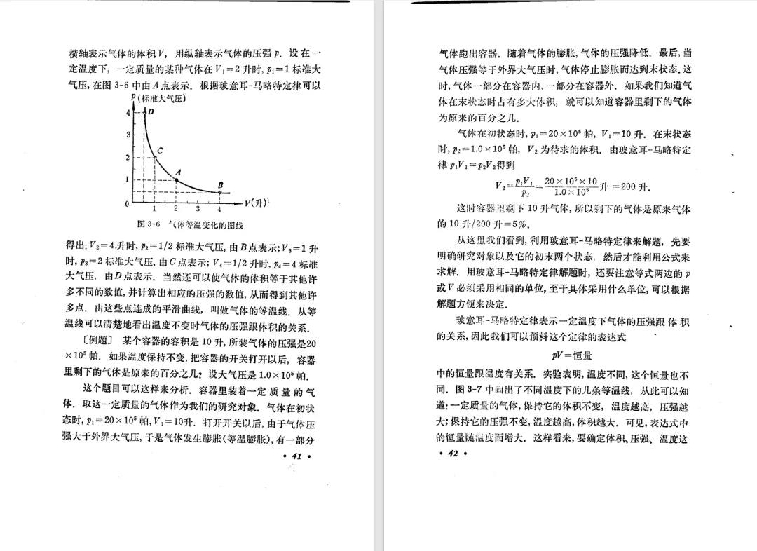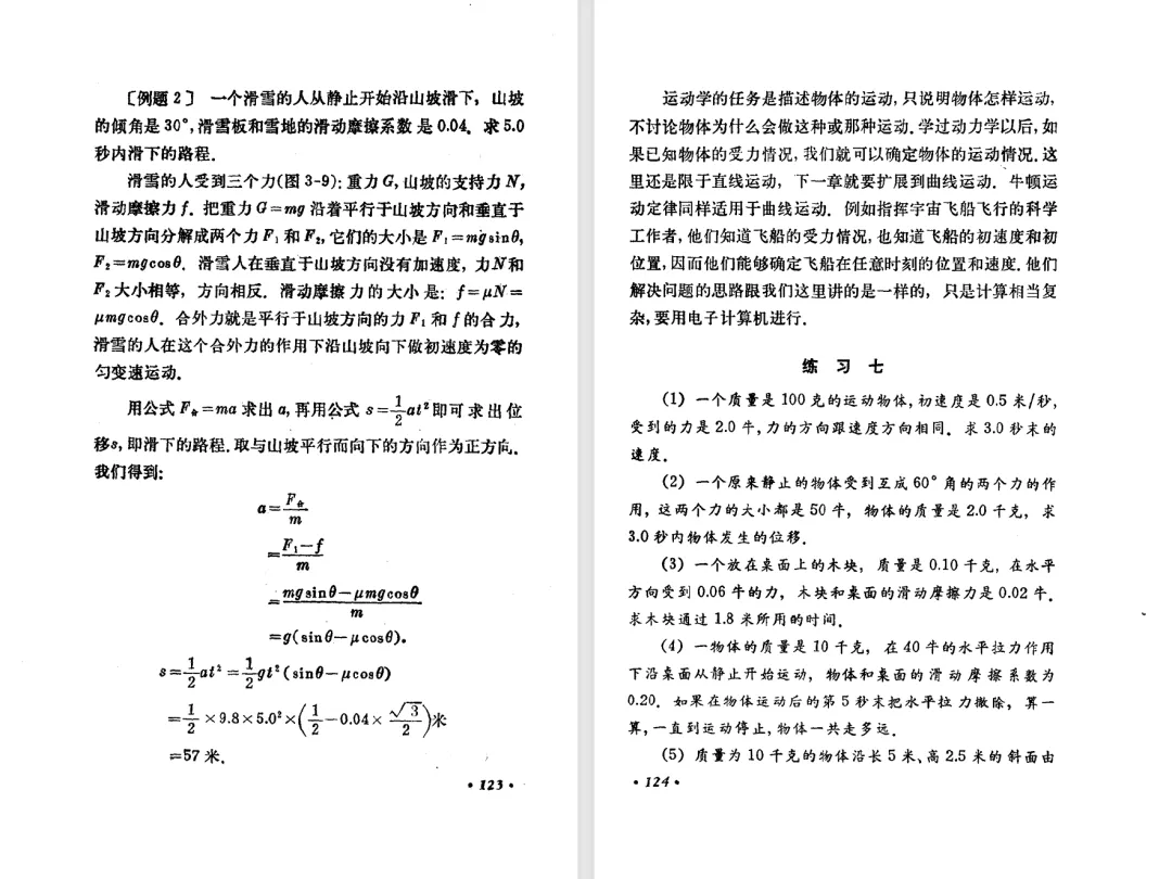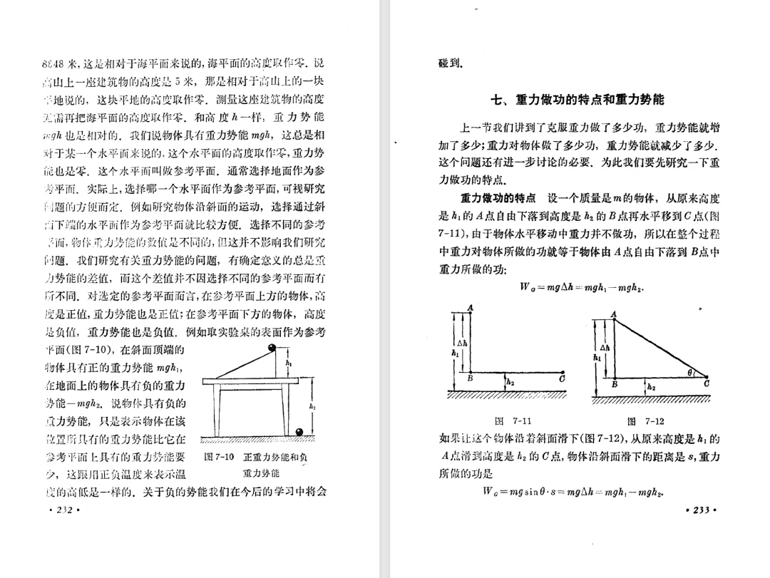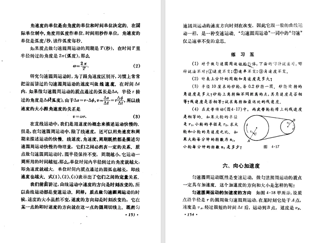 本文介绍1987年版 高级中学课本 物理 上册的详细内容。本书是八十年代 高级中学课本 物理 乙种本 上册 的第二版,在第一版的基础上进行少量修改和重新排版。为了简化称呼,本文仍将1987年版高中物理称为高中物理乙种本。接下来本文将通过对比高中物理甲种本和乙种本的方式对乙种本进行详细介绍。对比乙种本第一章和甲种本对应的内容。如下表所示,左边一列是甲种本,右边一列是乙种本。乙种本将胡克定律合并入弹力一节,将牛顿第三定律放到后面的第四章。乙种本没有专门介绍物体受力分析的小节,弱化了力学的训练,不利于应试。乙种本没有专门介绍标量和矢量、矢量运算的小节。甲种本第六章的第二节和第三节讲的都属于有固定转动轴的物体的平衡,乙种本内容少一些,只有一节。乙种本没有力偶。甲种本的平衡和种类,以及稳度,这两个小节在乙种本是选学内容。不过,甲种本没有乙种本的候风地动仪这个阅读材料。从本书开头的第一章我们就能发现乙种本的难度大幅降低。根据人民教育出版社出版的《新中国中小学教材建设史 1949-2000 研究丛书 物理卷》(简称《物理教材建设史》)的介绍,甲种本和乙种本并用时期,物理高考按甲种本命题,对于使用乙种本的学生不利。胡克定律出现在本节末尾,如下图第14页中间所示,内容很少。下面看甲种本。先看第三节 弹力。这节内容表达的意思和乙种本是相同的,但是内容要详细一些,有的例子更复杂一些。下面是第四节 胡克定律。本节不仅详细介绍了弹力与形变的关系,展示了刻画弹簧形变与弹力关系的胡克定律,还指出了胡克定律的适用范围,比乙种本详细很多。回到乙种本,看第五节 共点力的合成。本节先讲互成角度的共点力的合成,再讲共线的共点力的合成。然后,介绍矢量和标量的概念,指出矢量合成遵循平行四边形法则。下面看甲种本的内容。下图的第八节介绍力的合成,主要是互成角度的共点力的合成。教材不仅给出了力的平行四边形法则,还介绍了三角形法则。后面还有第九节介绍力的合成的计算。本节末尾,如下图第44页后半页所示,教材指出同一直线上的矢量运算也满足平行四边形法则的计算公式。有一点值得注意,甲种本有差不多两页纸介绍矢量和标量,乙种本只有短短一段话。甲种本难度大,篇幅长,乙种本难度低,篇幅短。可是,难度低就一定要对应篇幅短么?我觉得是不合适的。我反而觉得难度低的版本应该将概念解释的更详细,帮助更多的学生理解清楚概念,掌握好知识。下面看乙种本的第八节 有固定转动轴的物体的平衡。本节只有两个小标题,力矩 和 有固定转动轴的物体的平衡。本节开头有很短的两段话介绍转动的物体在什么情况下出于平衡态:静止或匀速转动。本章是第一章,教材还没有介绍运动,也没有介绍匀速圆周运动,所以教材在括号里解释了什么是匀速转动。再看甲种本对应的两个小节。下图是第二节 力对物体的转动作用。这节的第一个小标题介绍转动,转动这个概念在甲种本 第二章 直线运动 第一节 机械运动 中介绍过。段落里面有提到圆周运动的一些概念。所以,甲种本为了解释转动,使用了很多运动学的概念,这也是甲种本要把转动平衡的内容放到曲线运动之后的原因。全日制十年制高中物理,和高中物理乙种本不对转动做详细的解释,所以与物体的平衡有关的内容就和力的内容放同一章了。接下来的第三节专门讲有固定转动轴的物体的平衡,没有划分小标题,正文内容不多,乙种本还给了个例题,甲种本没有。本节末尾还有个阅读材料,候风地动仪,甲种本没有这个阅读材料。下面是甲种本的 平衡的种类 和 稳度 两个小节,比乙种本详细一些。先对比甲种本和乙种本的本章目录。甲种本有一节专门介绍机械运动的概念。乙种本把质点和位移放同一个小节,小结标题还有路程的概念,事实上甲种本也会对比位移和路程两个概念,只是没写到标题里。甲种本有一个阅读材料对比速度和加速度的区别,乙种本没有。甲种本第十节讲匀变速运动规律的应用,乙种本没有。乙种本将运动的合成放在本章末尾,甲种本放在曲线运动这章里。甲种本和乙种本的区别不仅体现在目录里,内容也有很大的差别。如下图第57页所示,乙种本借助速度计帮助读者理解即时速度,然后简单地解释物体在某一时刻或某一位置的速度叫做即时速度。前面的文章已经说过,全日制十年制高中物理对于即时速度的要求还要更高,还用位移-时间图象求即时速度。下面看乙种本第七节 匀变速直线运动的位移。这一节非常暴力,直接使用两个结论——第一,匀变速直线运动的平均速度等于初末速度的平均值;第二,匀变速直线运动的位移等于平均速度乘以时间——得出匀变速直线运动的位移公式。在页尾注解写道只有匀变速运动才能如此求平均速度。后面就是例题。接下来给出初末速度、加速度、位移的关系式,然后又是一道例题。下面看甲种本。如下图所示,甲种本采用极限思想,借助速度-时间图象求解匀变速直线运动的位移公式。接下来给出匀变速直线运动中初末速度、加速度和位移的关系。最后看红框部分,这是乙种本求解匀变速直线运动位移公式的方法。回到乙种本,看第十节 运动的合成。教材简单介绍了位移和速度的合成。如下图所示,甲种本在介绍平抛运动前介绍运动的合