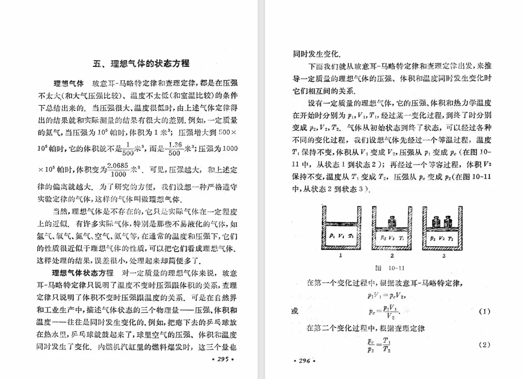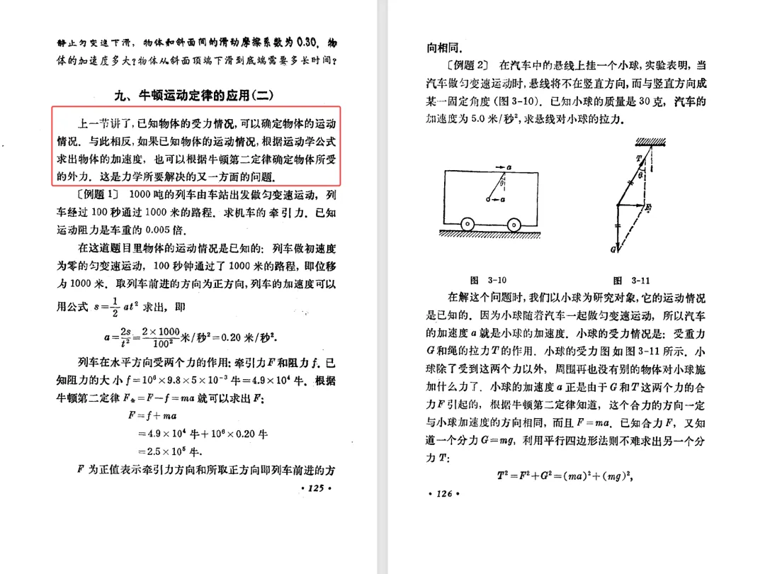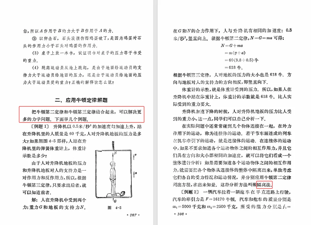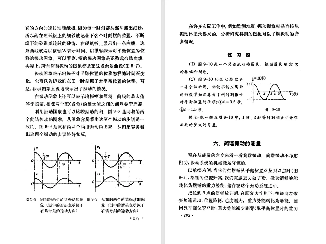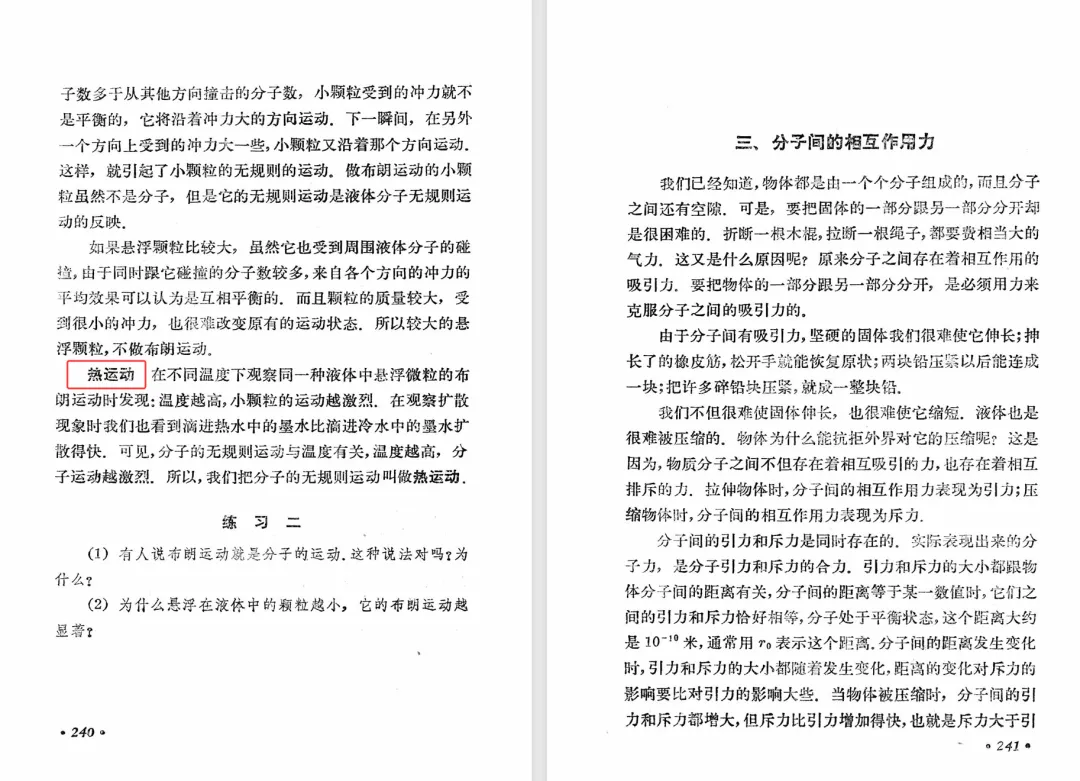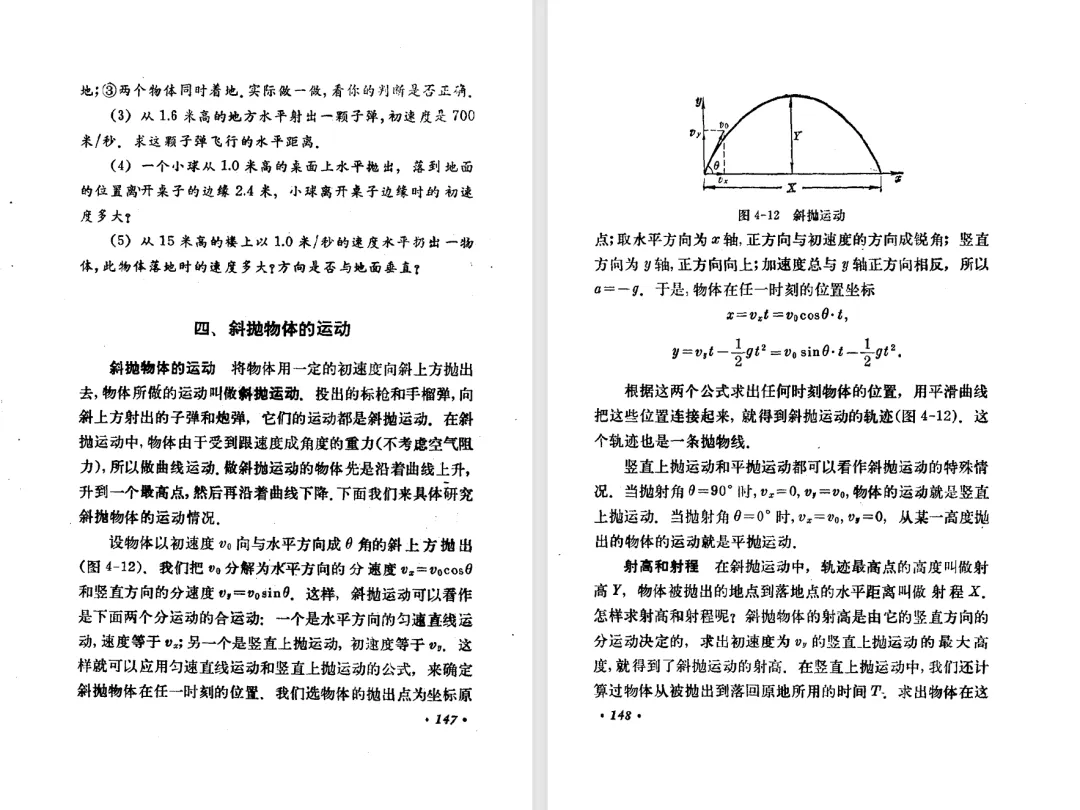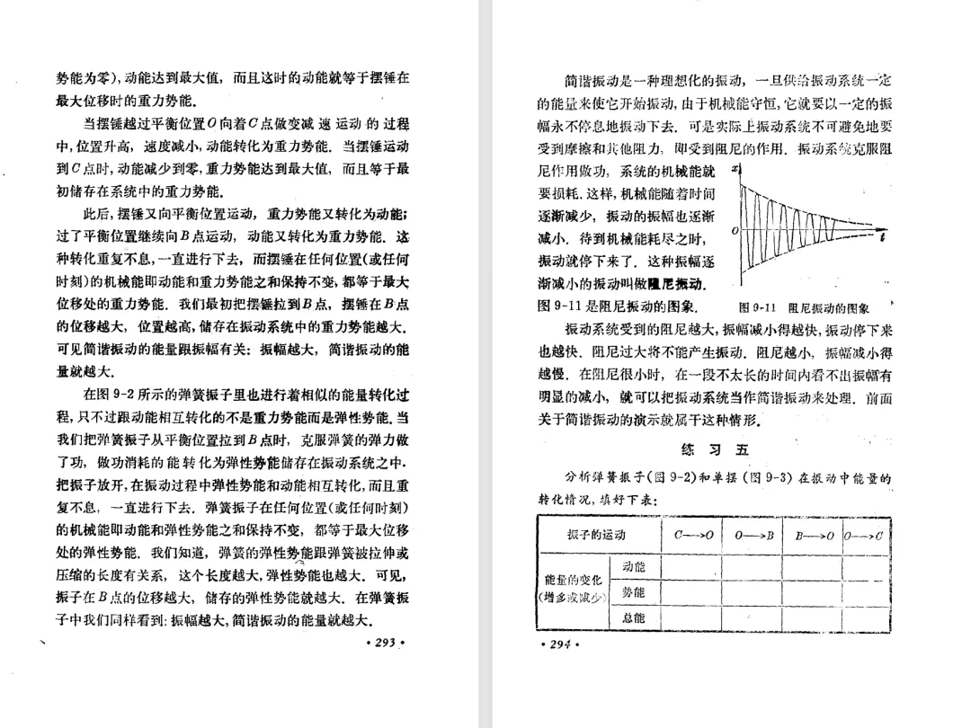 本文介绍1987年版 高级中学课本 物理 上册的详细内容。本书是八十年代 高级中学课本 物理 乙种本 上册 的第二版,在第一版的基础上进行少量修改和重新排版。为了简化称呼,本文仍将1987年版高中物理称为高中物理乙种本。接下来本文将通过对比高中物理甲种本和乙种本的方式对乙种本进行详细介绍。对比乙种本第一章和甲种本对应的内容。如下表所示,左边一列是甲种本,右边一列是乙种本。乙种本将胡克定律合并入弹力一节,将牛顿第三定律放到后面的第四章。乙种本没有专门介绍物体受力分析的小节,弱化了力学的训练,不利于应试。乙种本没有专门介绍标量和矢量、矢量运算的小节。甲种本第六章的第二节和第三节讲的都属于有固定转动轴的物体的平衡,乙种本内容少一些,只有一节。乙种本没有力偶。甲种本的平衡和种类,以及稳度,这两个小节在乙种本是选学内容。不过,甲种本没有乙种本的候风地动仪这个阅读材料。从本书开头的第一章我们就能发现乙种本的难度大幅降低。根据人民教育出版社出版的《新中国中小学教材建设史 1949-2000 研究丛书 物理卷》(简称《物理教材建设史》)的介绍,甲种本和乙种本并用时期,物理高考按甲种本命题,对于使用乙种本的学生不利。胡克定律出现在本节末尾,如下图第14页中间所示,内容很少。下面看甲种本。先看第三节 弹力。这节内容表达的意思和乙种本是相同的,但是内容要详细一些,有的例子更复杂一些。下面是第四节 胡克定律。本节不仅详细介绍了弹力与形变的关系,展示了刻画弹簧形变与弹力关系的胡克定律,还指出了胡克定律的适用范围,比乙种本详细很多。回到乙种本,看第五节 共点力的合成。本节先讲互成角度的共点力的合成,再讲共线的共点力的合成。然后,介绍矢量和标量的概念,指出矢量合成遵循平行四边形法则。下面看甲种本的内容。下图的第八节介绍力的合成,主要是互成角度的共点力的合成。教材不仅给出了力的平行四边形法则,还介绍了三角形法则。后面还有第九节介绍力的合成的计算。本节末尾,如下图第44页后半页所示,教材指出同一直线上的矢量运算也满足平行四边形法则的计算公式。有一点值得注意,甲种本有差不多两页纸介绍矢量和标量,乙种本只有短短一段话。甲种本难度大,篇幅长,乙种本难度低,篇幅短。可是,难度低就一定要对应篇幅短么?我觉得是不合适的。我反而觉得难度低的版本应该将概念解释的更详细,帮助更多的学生理解清楚概念,掌握好知识。下面看乙种本的第八节 有固定转动轴的物体的平衡。本节只有两个小标题,力矩 和 有固定转动轴的物体的平衡。本节开头有很短的两段话介绍转动的物体在什么情况下出于平衡态:静止或匀速转动。本章是第一章,教材还没有介绍运动,也没有介绍匀速圆周运动,所以教材在括号里解释了什么是匀速转动。再看甲种本对应的两个小节。下图是第二节 力对物体的转动作用。这节的第一个小标题介绍转动,转动这个概念在甲种本 第二章 直线运动 第一节 机械运动 中介绍过。段落里面有提到圆周运动的一些概念。所以,甲种本为了解释转动,使用了很多运动学的概念,这也是甲种本要把转动平衡的内容放到曲线运动之后的原因。全日制十年制高中物理,和高中物理乙种本不对转动做详细的解释,所以与物体的平衡有关的内容就和力的内容放同一章了。接下来的第三节专门讲有固定转动轴的物体的平衡,没有划分小标题,正文内容不多,乙种本还给了个例题,甲种本没有。本节末尾还有个阅读材料,候风地动仪,甲种本没有这个阅读材料。下面是甲种本的 平衡的种类 和 稳度 两个小节,比乙种本详细一些。先对比甲种本和乙种本的本章目录。甲种本有一节专门介绍机械运动的概念。乙种本把质点和位移放同一个小节,小结标题还有路程的概念,事实上甲种本也会对比位移和路程两个概念,只是没写到标题里。甲种本有一个阅读材料对比速度和加速度的区别,乙种本没有。甲种本第十节讲匀变速运动规律的应用,乙种本没有。乙种本将运动的合成放在本章末尾,甲种本放在曲线运动这章里。甲种本和乙种本的区别不仅体现在目录里,内容也有很大的差别。如下图第57页所示,乙种本借助速度计帮助读者理解即时速度,然后简单地解释物体在某一时刻或某一位置的速度叫做即时速度。前面的文章已经说过,全日制十年制高中物理对于即时速度的要求还要更高,还用位移-时间图象求即时速度。下面看乙种本第七节 匀变速直线运动的位移。这一节非常暴力,直接使用两个结论——第一,匀变速直线运动的平均速度等于初末速度的平均值;第二,匀变速直线运动的位移等于平均速度乘以时间——得出匀变速直线运动的位移公式。在页尾注解写道只有匀变速运动才能如此求平均速度。后面就是例题。接下来给出初末速度、加速度、位移的关系式,然后又是一道例题。下面看甲种本。如下图所示,甲种本采用极限思想,借助速度-时间图象求解匀变速直线运动的位移公式。接下来给出匀变速直线运动中初末速度、加速度和位移的关系。最后看红框部分,这是乙种本求解匀变速直线运动位移公式的方法。回到乙种本,看第十节 运动的合成。教材简单介绍了位移和速度的合成。如下图所示,甲种本在介绍平抛运动前介绍运动的合