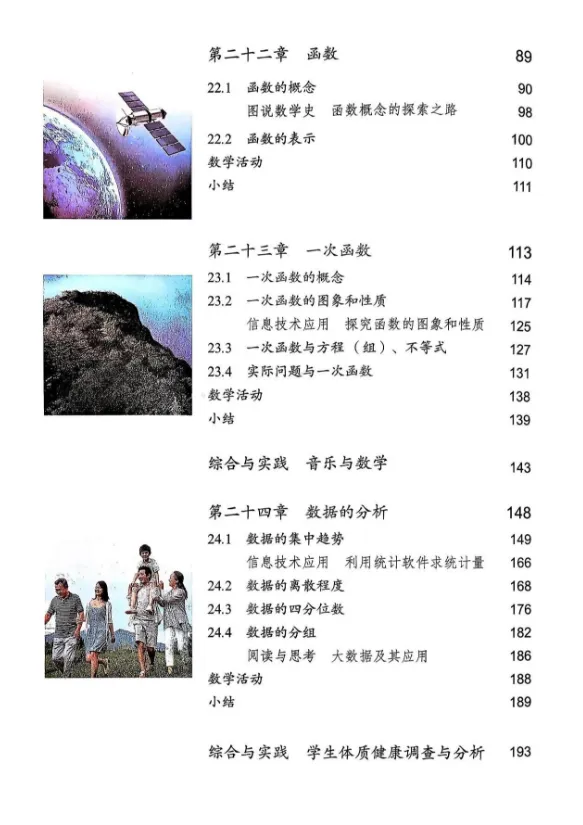 【2】第六章 实数:主要内容包含算术平方根与平方根的概念、立方根的定义、实数的分类及其在数轴上的对应。 【3】第七章 平面直角坐标系:主要内容包含坐标系的概念、用坐标表示地理位置、坐标平移的规律(左减右加,上加下减)。