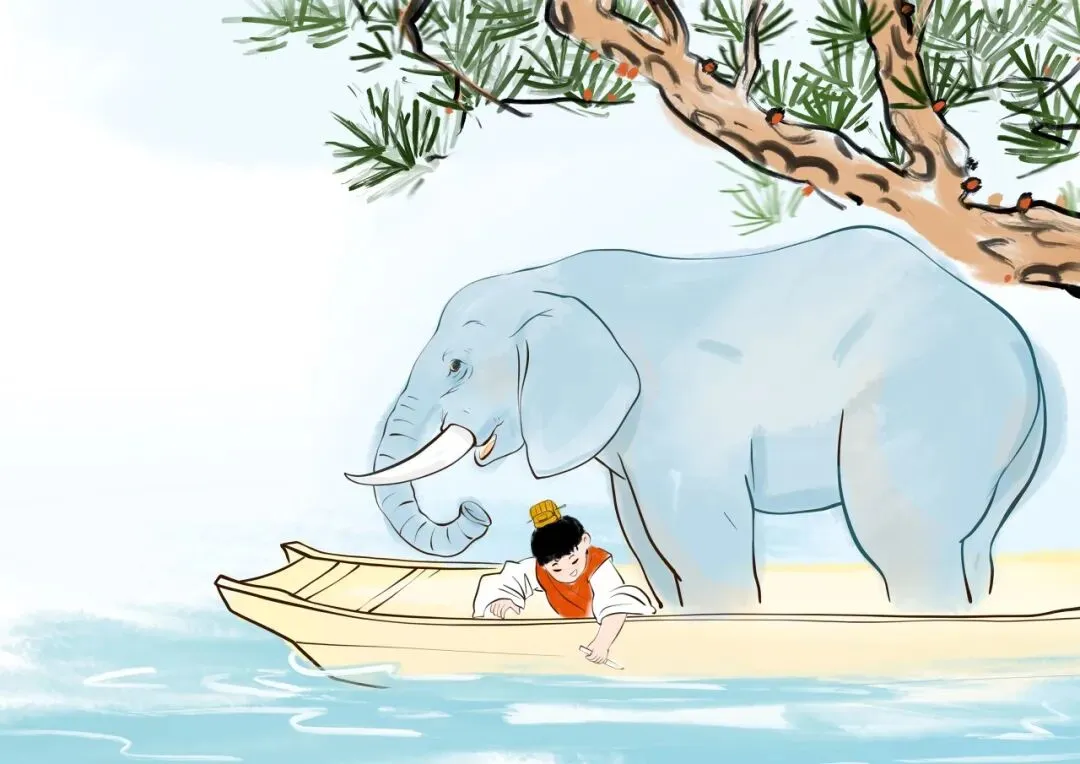 曹冲胸有成竹,说道:要想知道大象的重量,一定用秤吗?我们可以找条船,先让大象上船,画好吃水线。再让大象下船,然后让士兵往船上搬石头。等船到吃水线,再称称石头的重量,就可以知道大象有多重啦!