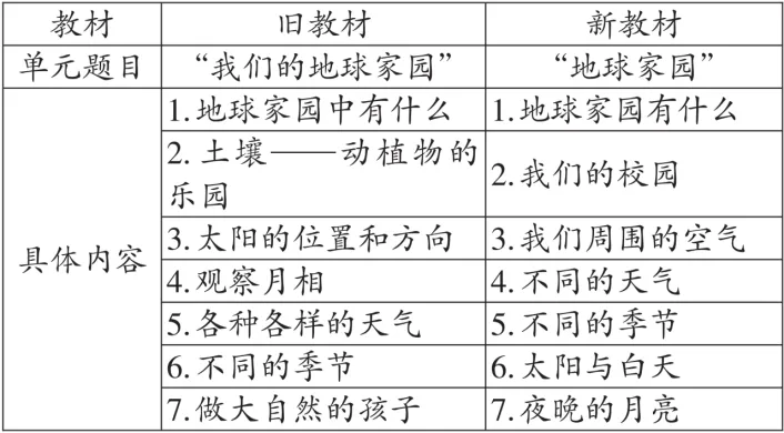 新教材虽然继承了旧教材以单元进行编排的结构特点,但更加重视以学科核心概念为主线组织单元内容,进一步加强了单元内容的重组与优化。每个单元都围绕一个主题展开,对零散的学习内容进行整合,让学生经历解决实际问题的过程,构建清晰且有逻辑的学习体系。以新旧教材二年级上册第二单元的内容为例,分析后发现两版教材都以“地球系统”为核心概念,带领学生了解地球家园中的各种自然现象,具体内容如表1所示。
