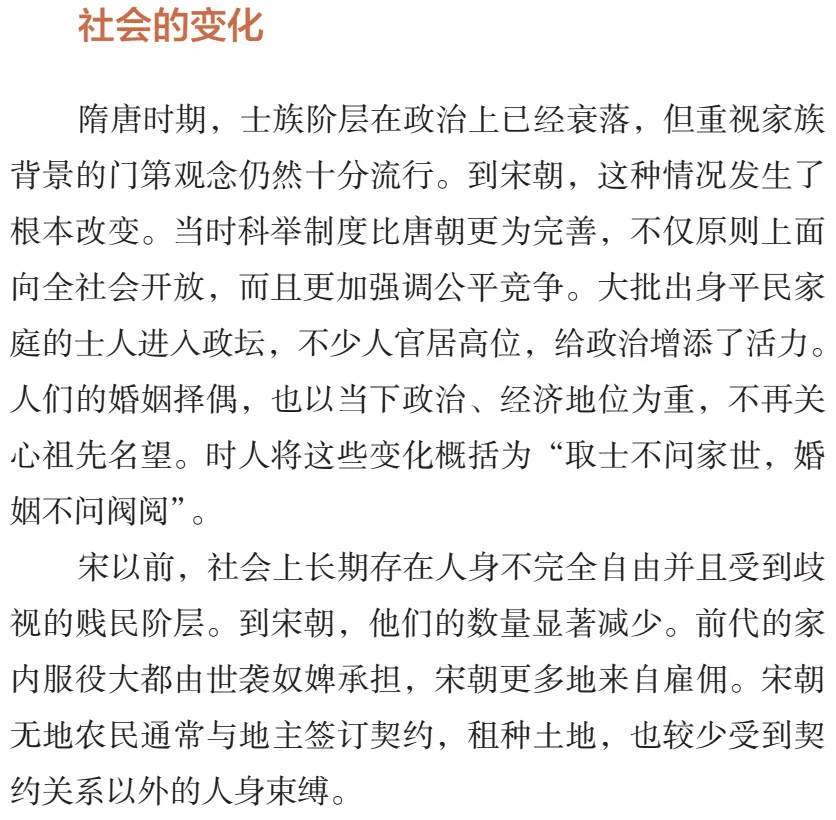 前面不谈门第,此处突然提及隋唐门第观念盛行;前面不谈科举制的不完善之处,此处突然提及宋代更完善;前面不谈贱民阶层、奴婢、农民受到的超经济强制,此处突然谈到宋代有了变化;前面不谈政府的社会控制,此处突然提及放松。教师当然可以一个一个去补充(如果教师清楚前代情形),但什么都要教师补充,那教材是用来干嘛的?