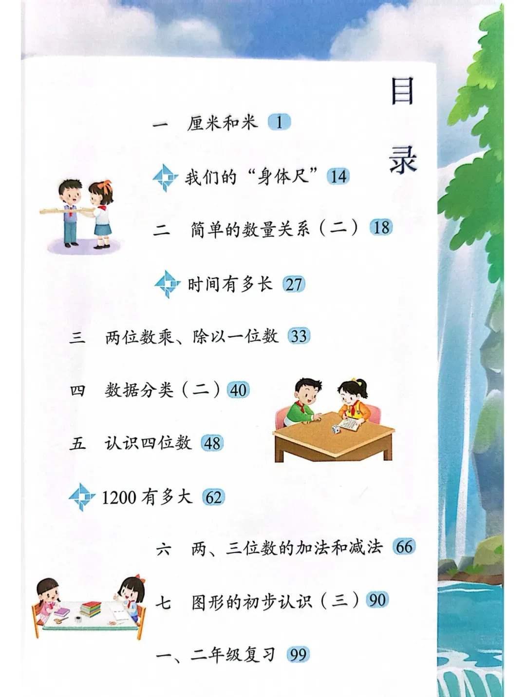 单元大幅调整:新增《厘米和米》《简单的数量关系(二)》《两位数乘除一位数》《图形的初步认识(三)》4个单元;删除《有余数的除法》《认识方向》《分米和毫米》等已学或衔接不畅内容。