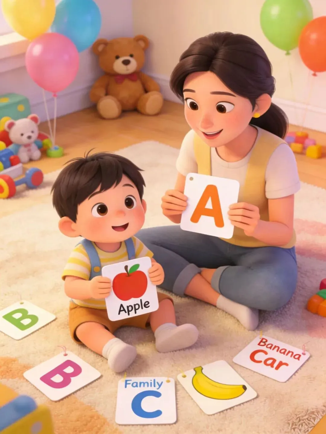 每天选3个字母,比如A、B、C,对应苹果、书包、杯子,让娃: