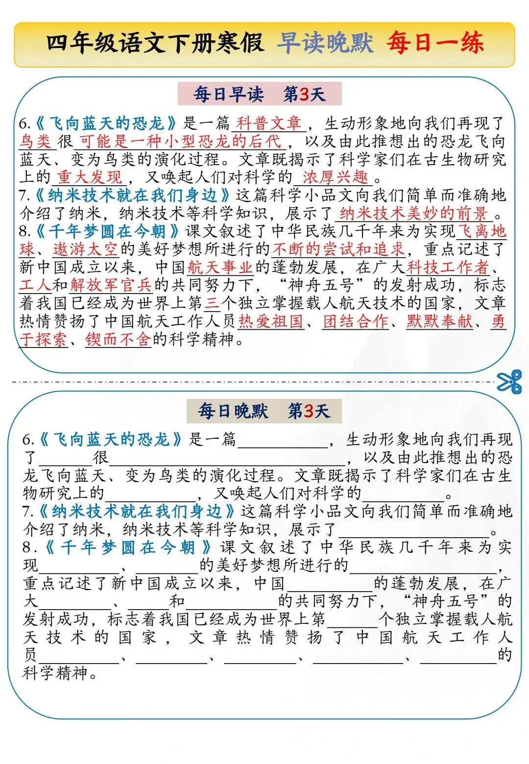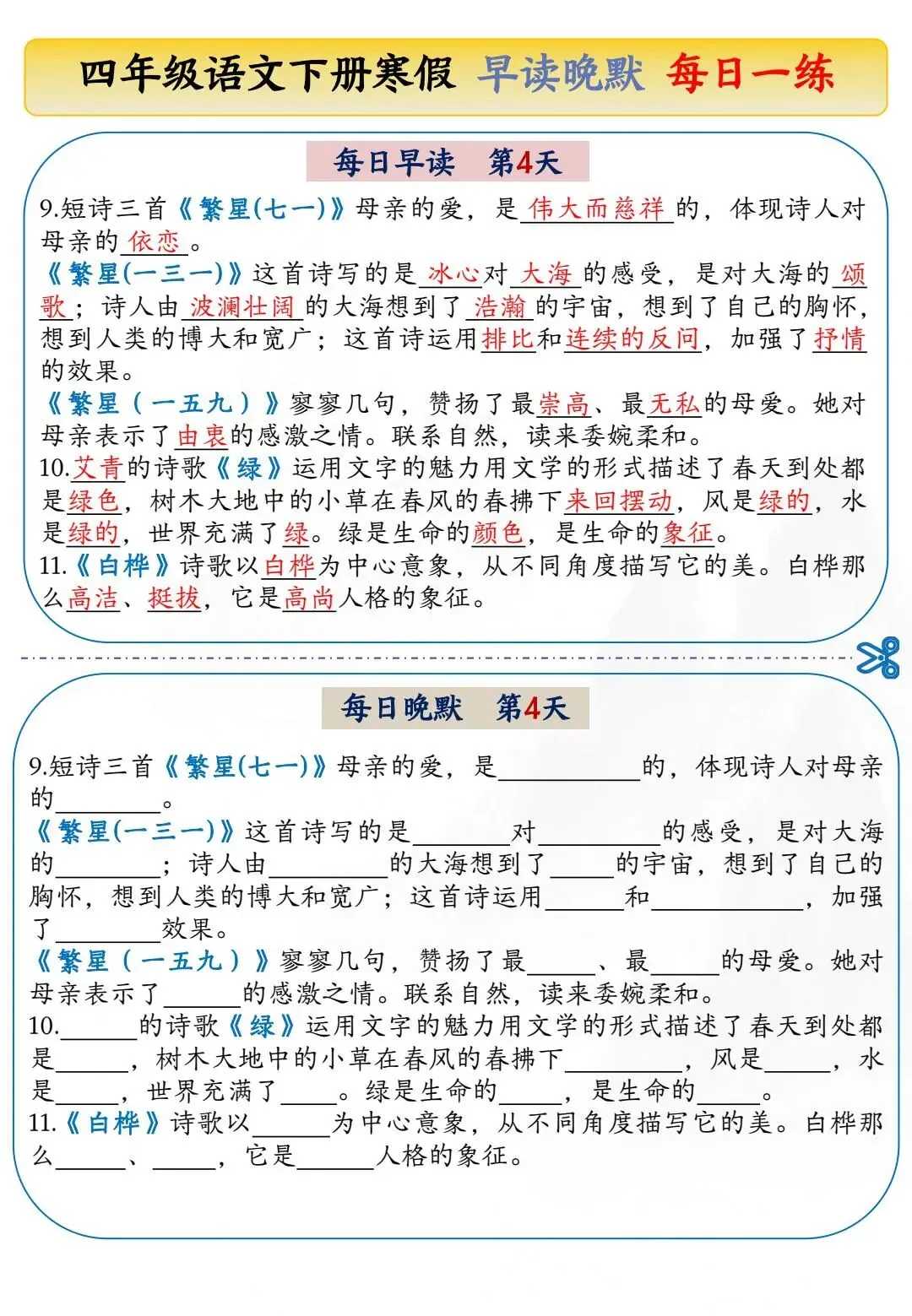 今天小麦给大家分享的是:新版教材小学语文四年级上册《寒假早读晚默每日一练》(高清PDF电子版,可打印)。完整电子版文章末尾可直接领取,无套路,欢迎收藏和下载。